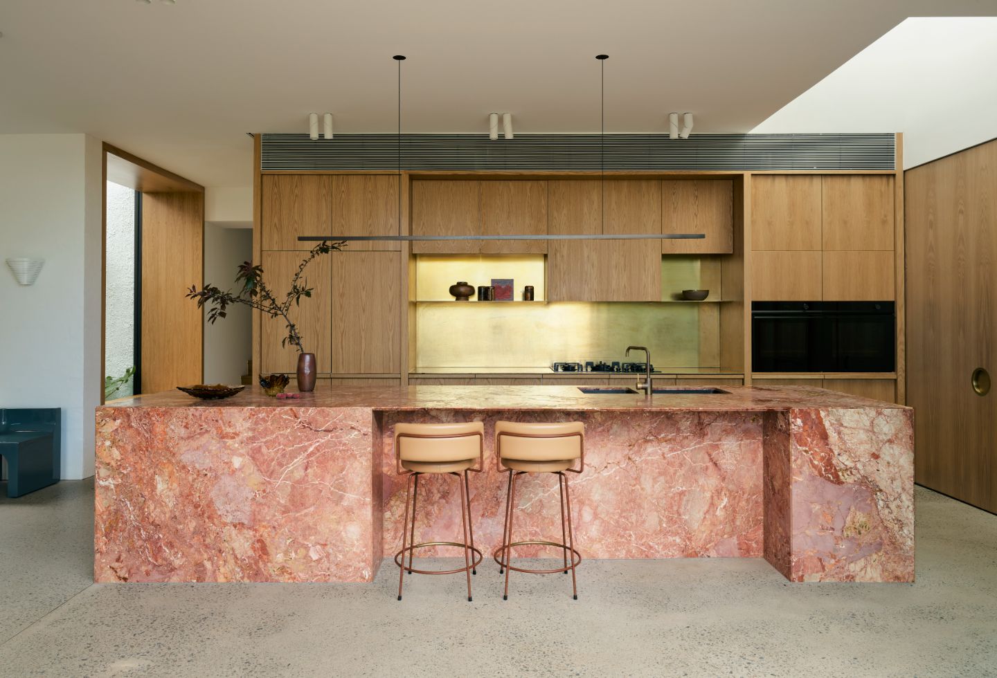 The home’s previous incongruous additions are replaced with an expansive, L-shaped volume that skilfully addresses the rear garden. The ceiling line is ‘pulled up’ through the living and dining spaces, celebrating the home’s existing roof pitch and offering a dramatic expansion of space – testament to Studio Prineas’ volumetric understanding of space.