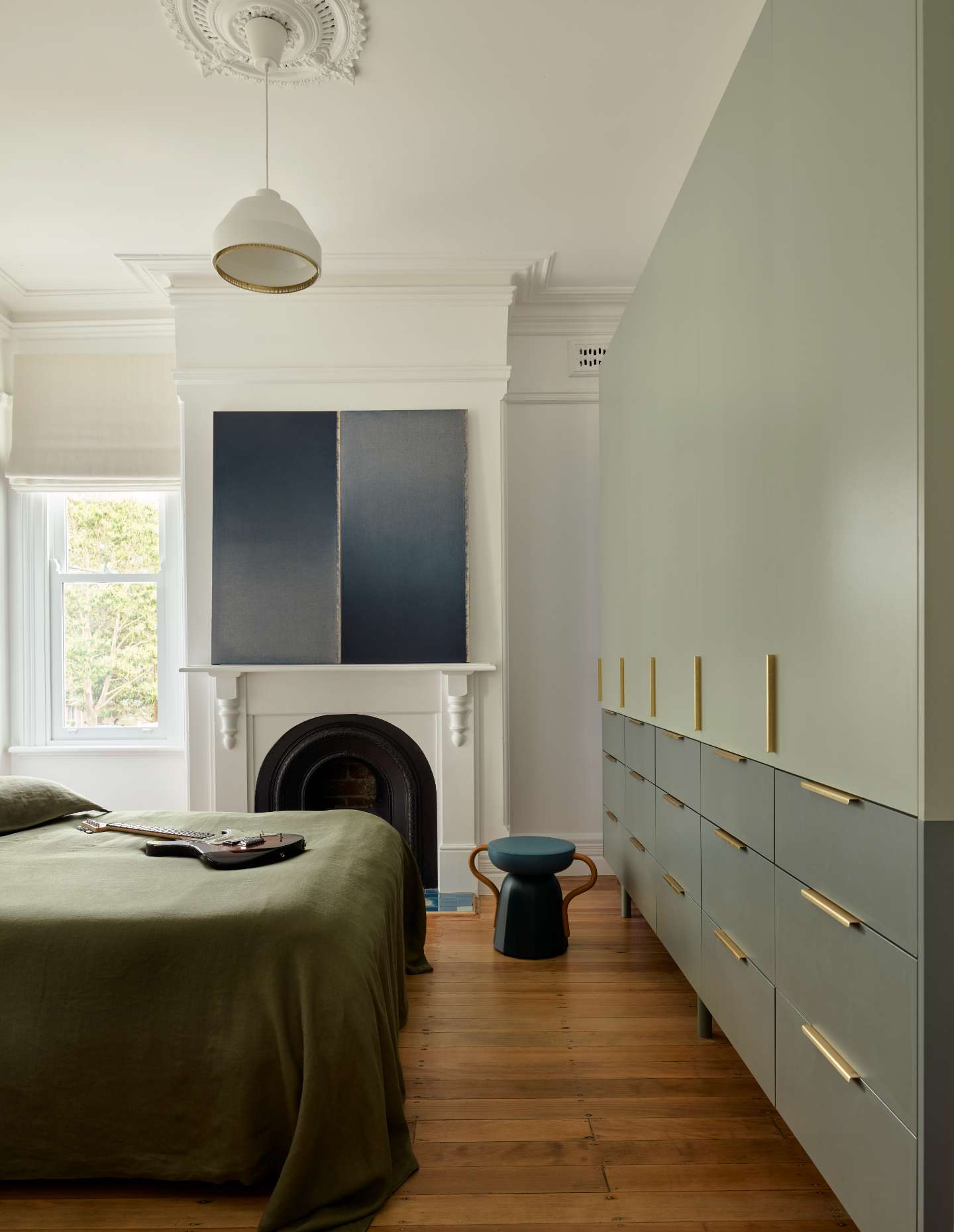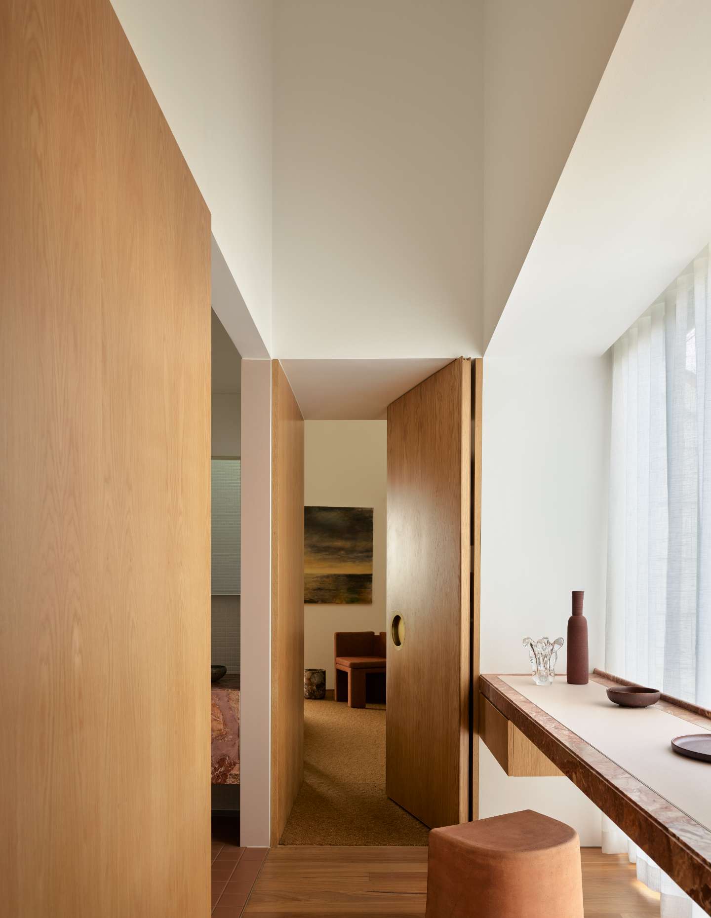 The large block form of the island is countered by a glowing brass splashback that extends upwards behind the floating brass shelves. The cabinetry here is exceptional, with the American Oak figuration fully realised as a layer within the pattern of the whole. Rather than opt for a seamless wall of cabinetry, each cupboard is visually articulated with detailed joinery and trim. It is excellently done and a breath of fresh air in kitchen design. The cabinetry also conceals a mud room, wine store and pantry. While tucked behind the back bench is a service area comprising a laundry, linen store, cellar and powder room, with pocket sliding doors that allow the whole to be closed off as required. Meanwhile, honed concrete floors provide a neutral foundation to the eclectic collection of loose furnishings the family has gathered over the years.