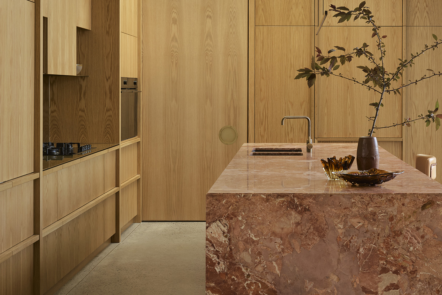The striking blush and burgundy veined marble of the kitchen island holds the room magnificently. Jewel-like and framed by American Oak veneer cabinetry, the natural shifts within the stone are given full flight with areas of intense tights figuration balanced by large swathes of colour. The large paired splash of pink and white in the left-hand expanse is particularly beautiful, but then so too is the sudden ripple of white through the centre.