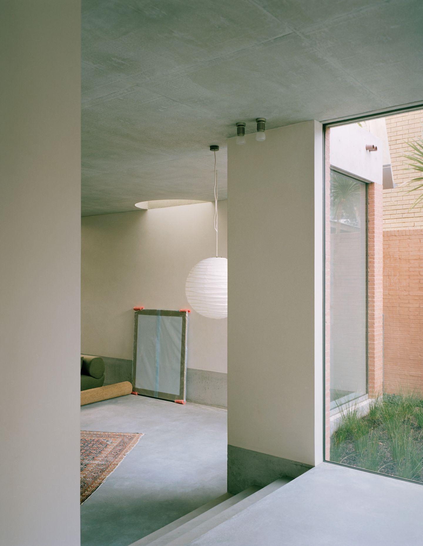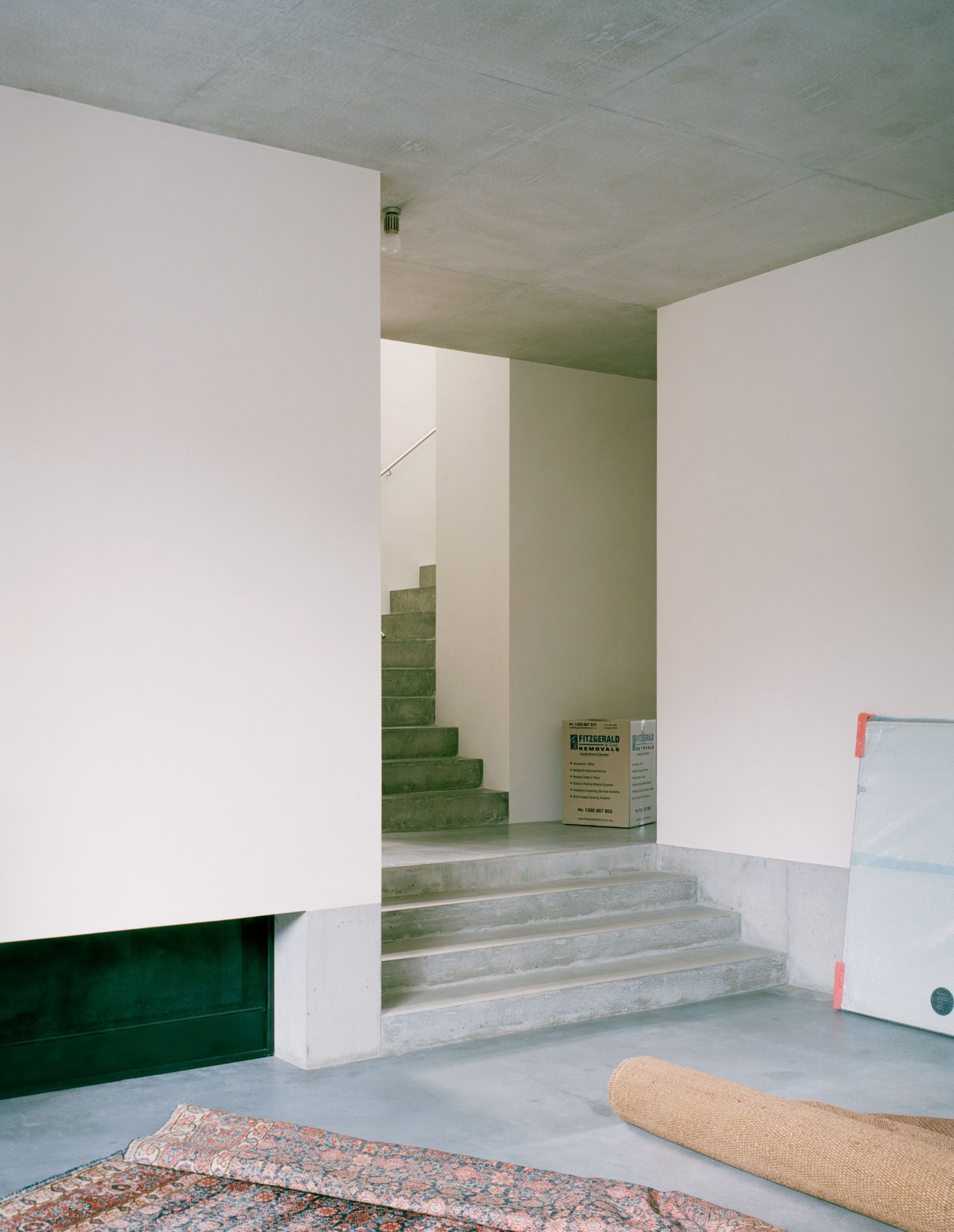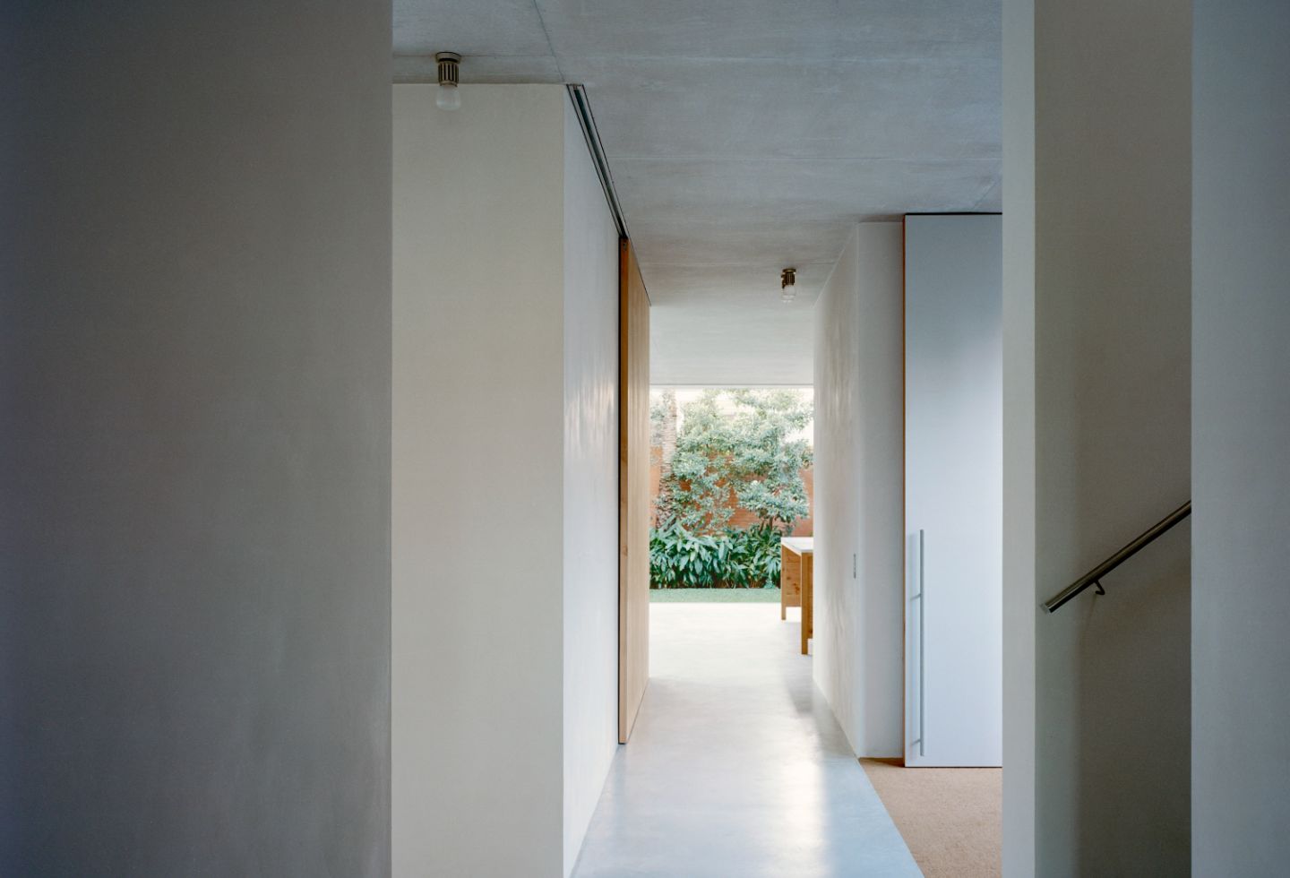 Unfolding from the street, the home follows a minimal aesthetic with a straightforward and hardworking material palette of concrete and brick. Evoking the local context, the meandering streets reveal a diversity of materiality – and yet, red brick makes frequent appearances. The architects decided to work with this rather than against it for a building grounded in place.