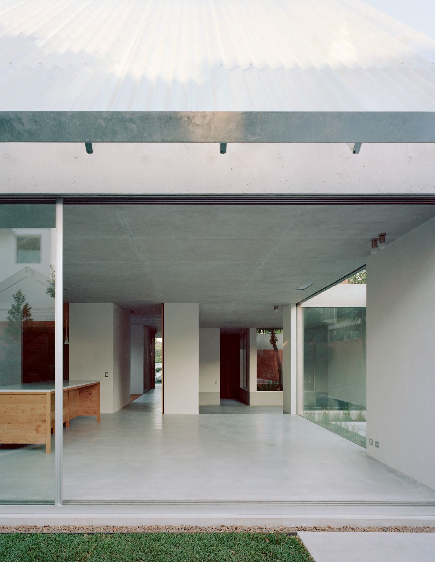 Inside, the material palette is brutalist in its expression, mostly using the grey-hued concrete on the floors and ceilings. On the internal walls, the recycled bricks are finished in a natural render, unpainted and sealed with wax. While the Oregon roof framing is dispensed throughout, re-used for the kitchen island and all internal doors, also finished with wax.