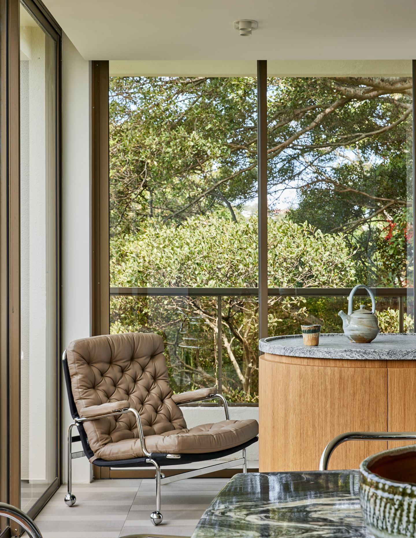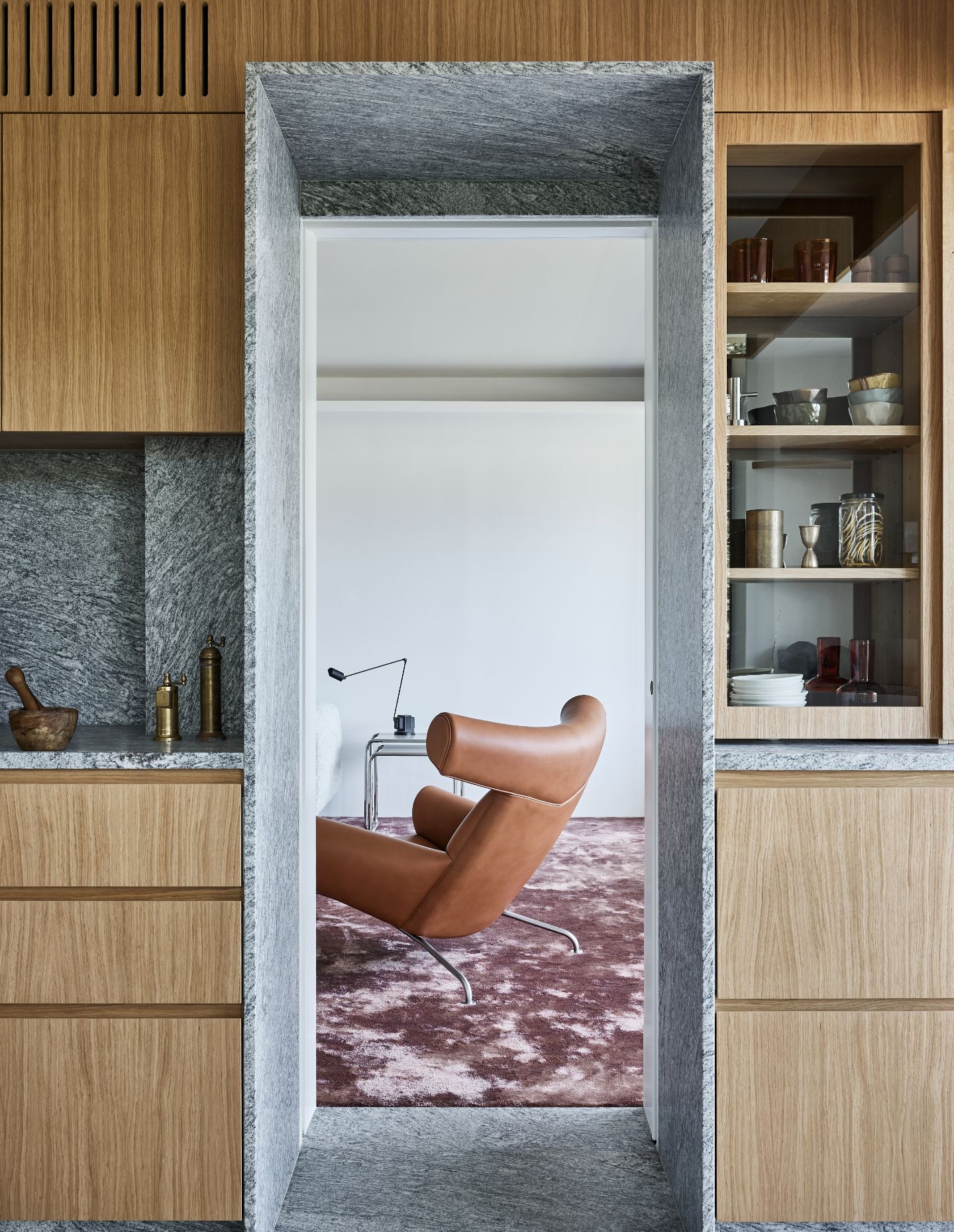 The architectural language for this second Double Bay project is a continuation of what previously existed, and Architect George’s team were challenged with accentuating the residences’ authentic character rather than altering it. Drawing inspiration from 1980s architecture and furniture design, bold-coloured carpets, mirrors, chrome accents and the extensive incorporation of granite textures were chosen to pay homage to the era.