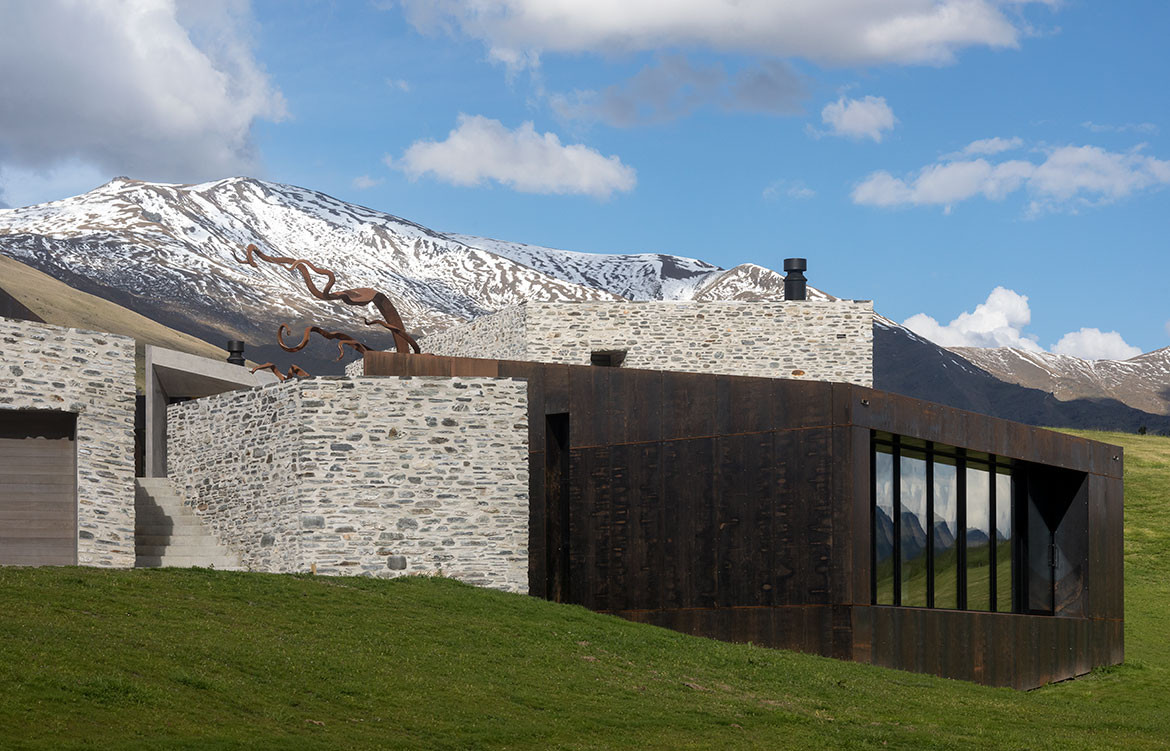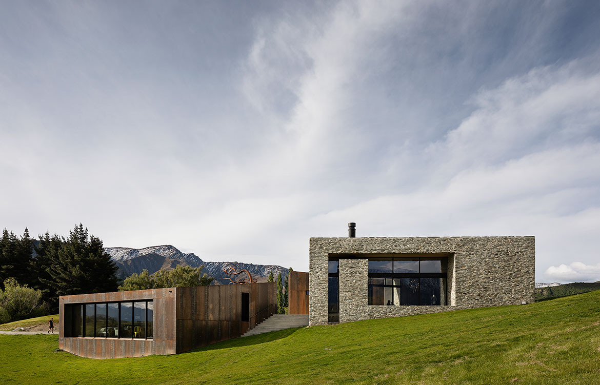 The whole area is in fact sculpted by glaciation and erosion with the basin floor peppered with exposed stone outcrops. As well as this very raw, physical environment, there are the remnants of 18th century gold mining. Scoured rivers with the iron huts and stone stores abandoned after the gold rush, left to weather and rust. These simple structures formed a basis for the geometric and material expression of the house – shed-like ‘remnants’ recreated in weathered Corten steel for the bedroom pavilions and the local Glenorchy schist for the living pavilion and garage.