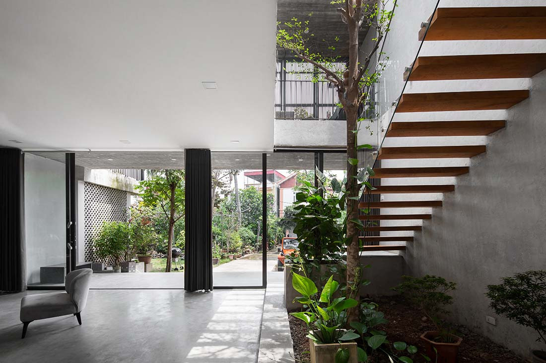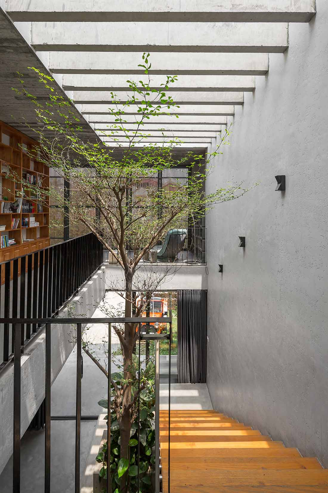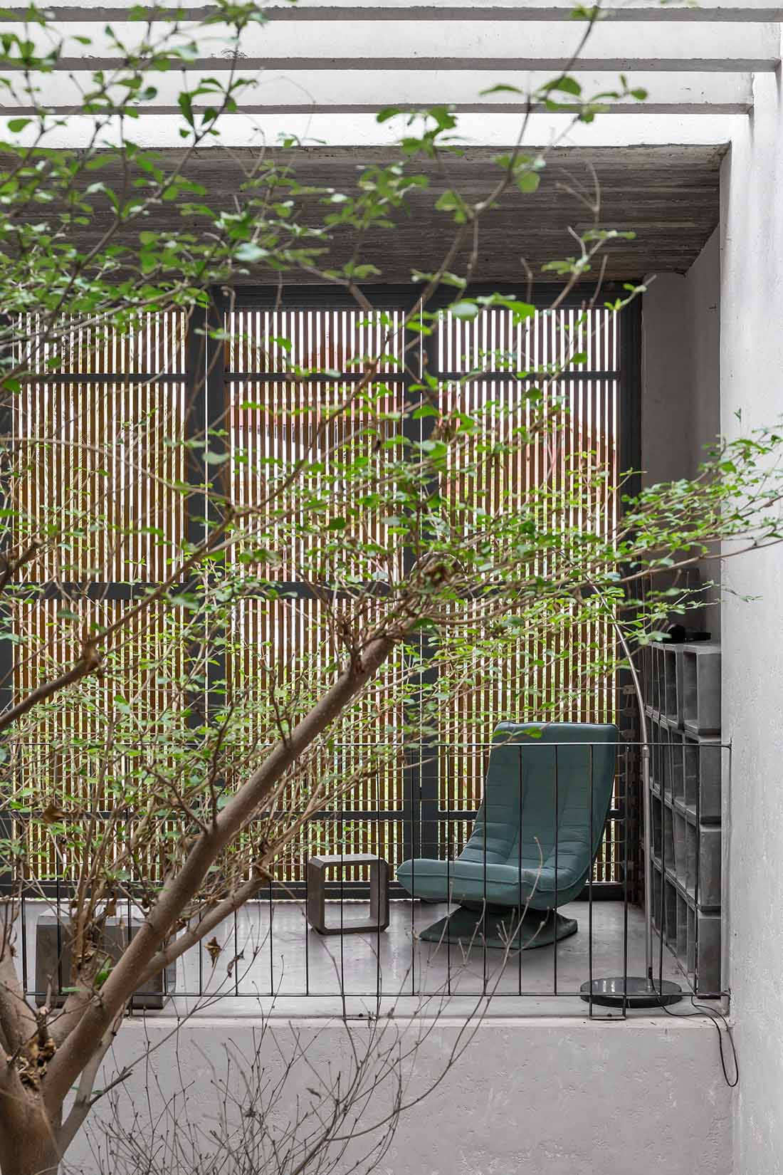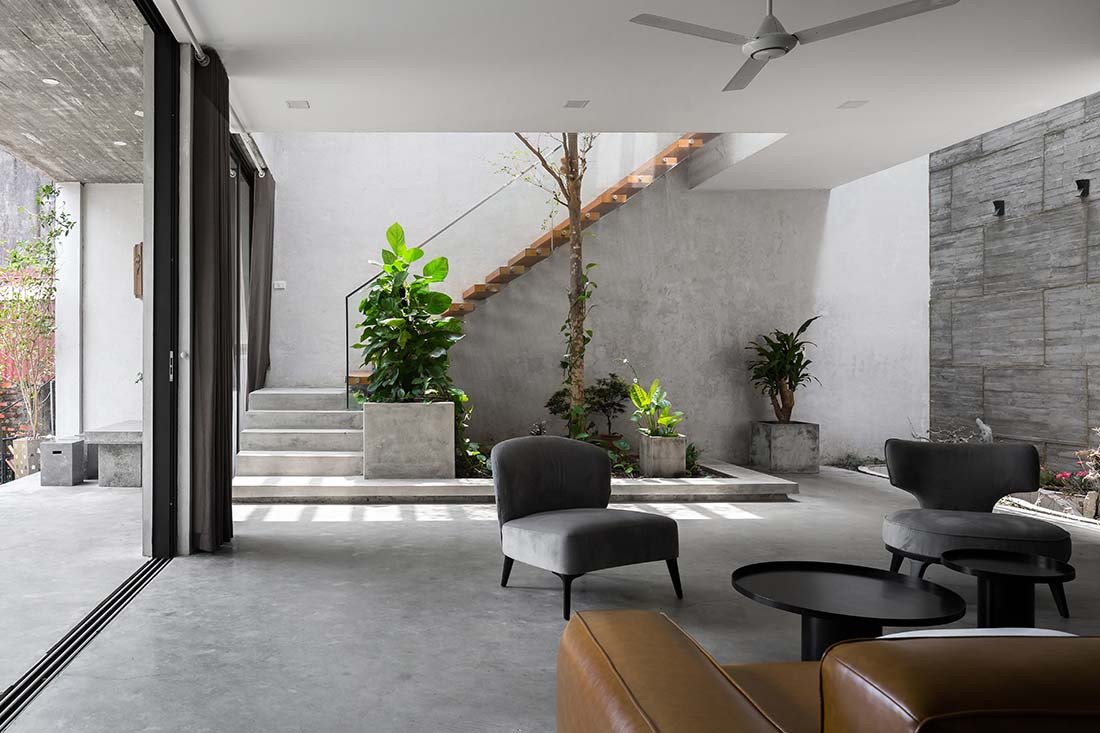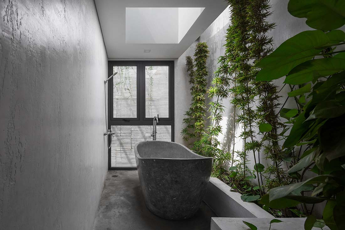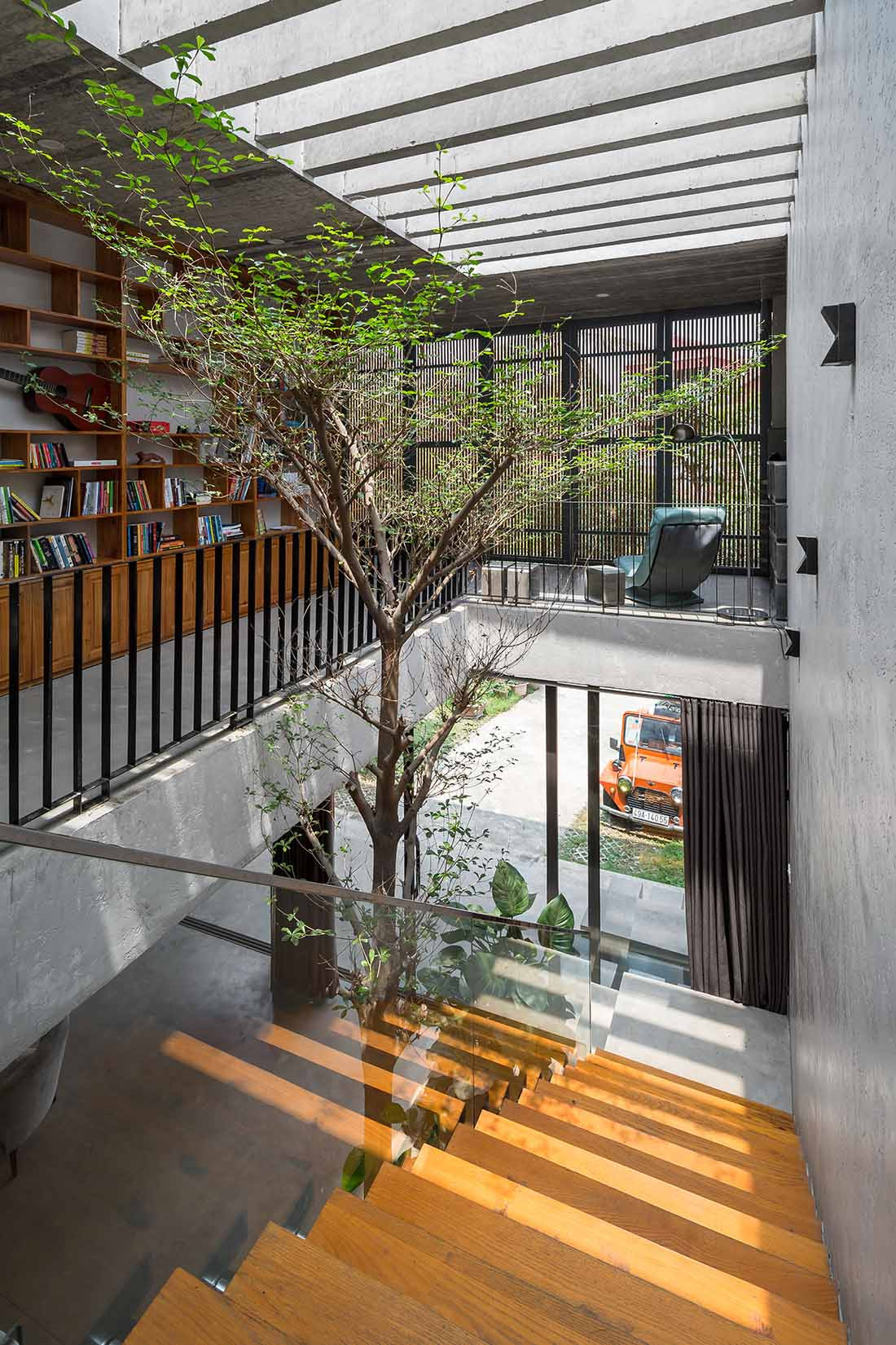 Nature (both greenery and timber elements) softens the concrete character of the house. “We gave priority to trees and plants that can grow well inside a house without meticulous care as the homeowner is pretty busy with his daily work already,” Van says of the indoor planting. Bamboo and Terminalia mantaly, commonly known as the Umbrella tree, were chosen for their delicate foliage and low leaf fall.