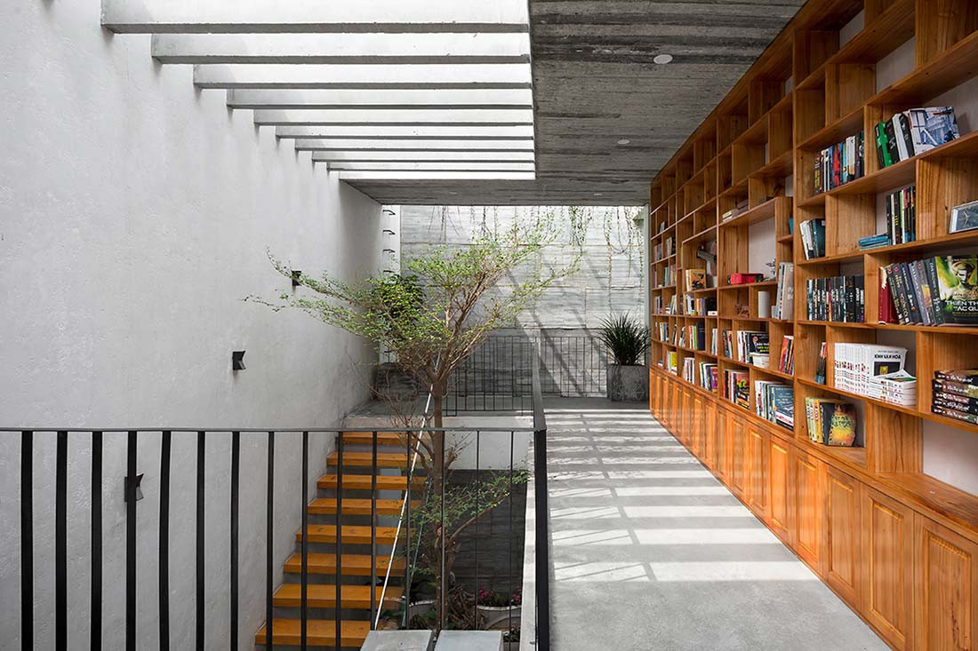 The house’s large openings invite the breeze and offer views out. They create opportunities for quieter enjoyments too, such as in the reading area upstairs, set in a cosy yet open space by a stretch of windows and bookcase – both gratifyingly large for the resident bookworm.