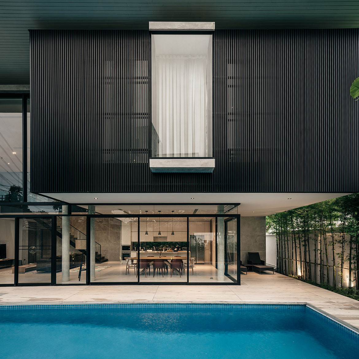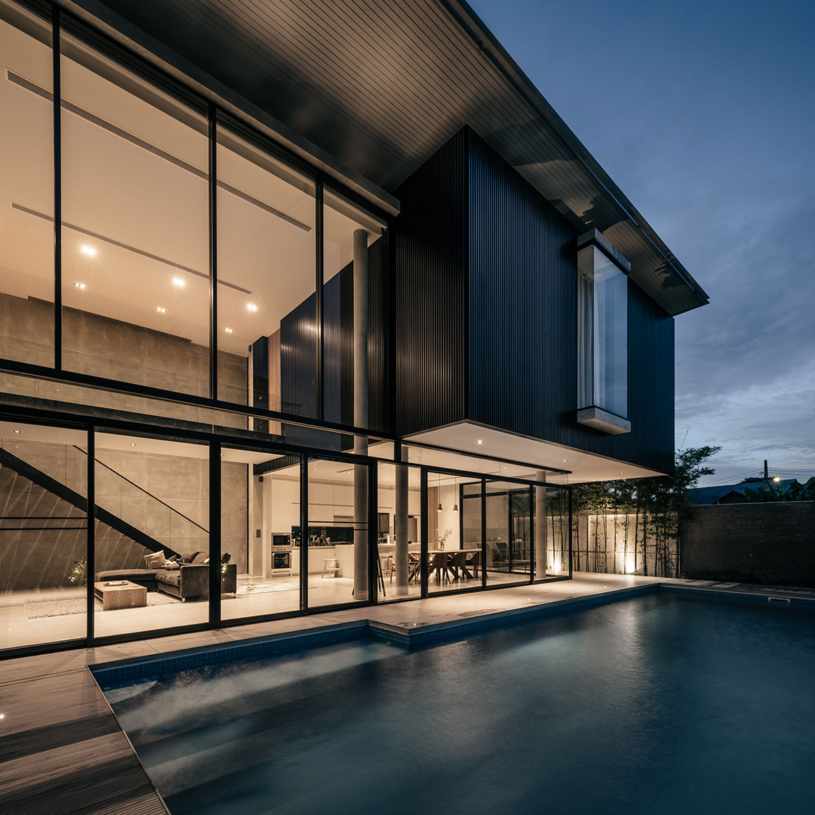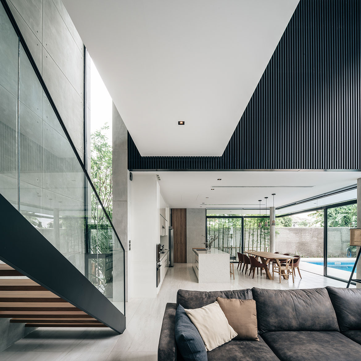 Located in Bangkok, the 500 square-metre-house is designed for an extended family whose old home still exists on the same site. The first task of the architect was, therefore, to understand not only the physical requirements, but also the socio-cultural specificities within the micro-scale of the family. Only when such understanding was established, could the design begin to translate both individual and collective needs into a unique spatial and formal configuration.