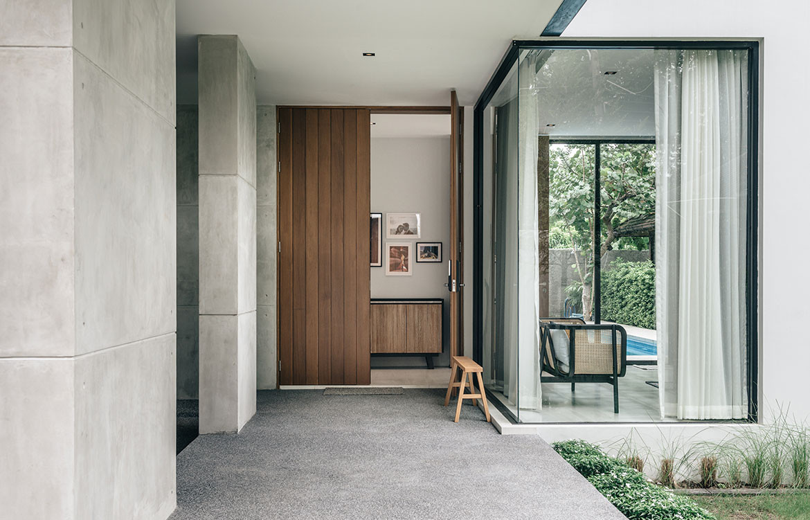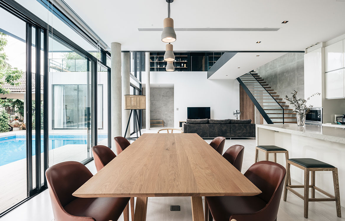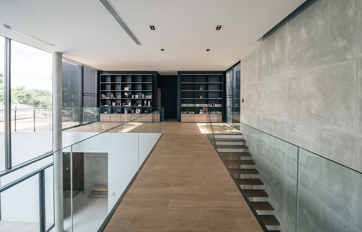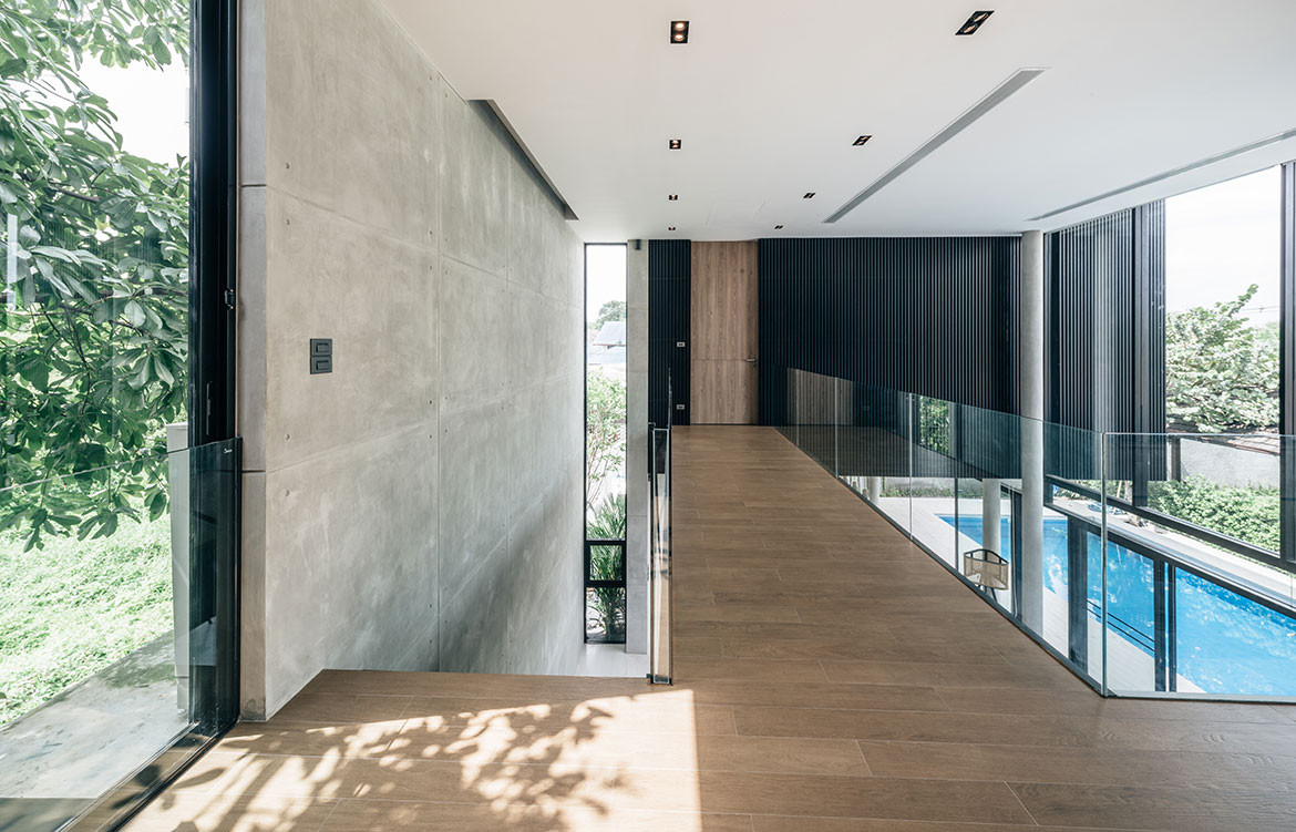 Aligned parallel to each other, the existing house and bAAn are at once separated and joined by a swimming pool and outdoor familial spaces that are extended from the house’s interior perimeter. The ground floor thus becomes an ideal location for all public activities that do not need to be closed off from their surrounding natural and habitual landscape belonging to the extended family. The more private areas are located on the upper level, organised around the double-height space of the living room that allows both visual and actual connection between the two levels. A transparent walkway linking both sides of the private spaces becomes a transitional element allowing both ends of the house to coexist as one. While most interior spaces are intended to embrace both natural light and views out to the surrounding garden, the west-facing walls are solid and contain storage spaces and restrooms, thus protecting the living spaces from the afternoon sun, known in Thailand for its extreme heat.