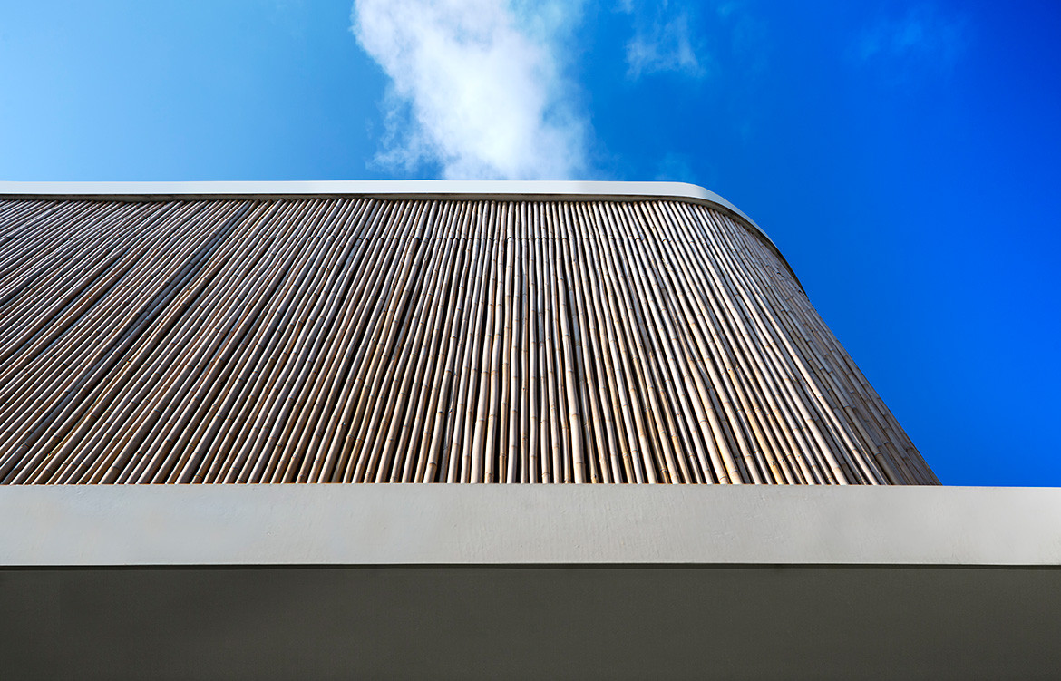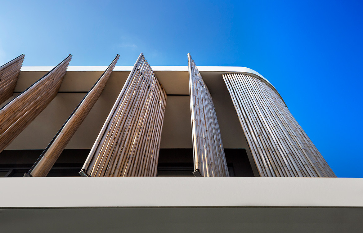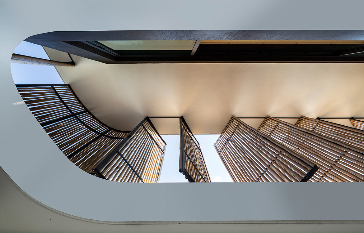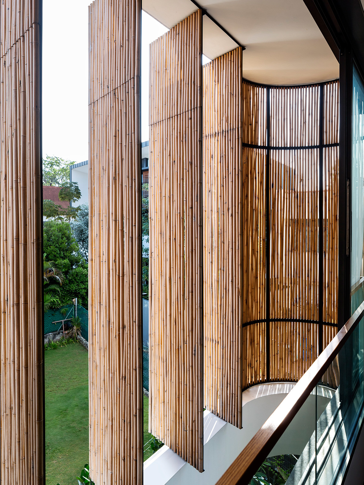 The result is an elegant curving skin of operable screens made of vertical bamboo columns that forms a second skin to the first floor of the house. The new, smaller house is set back further than the original and this has enabled the architects to have the bamboo screens extend out to the original setback line, leaving a 1-1.5 metre gap to the façade. The effect of this is to create an air bubble which helps cool the interior.