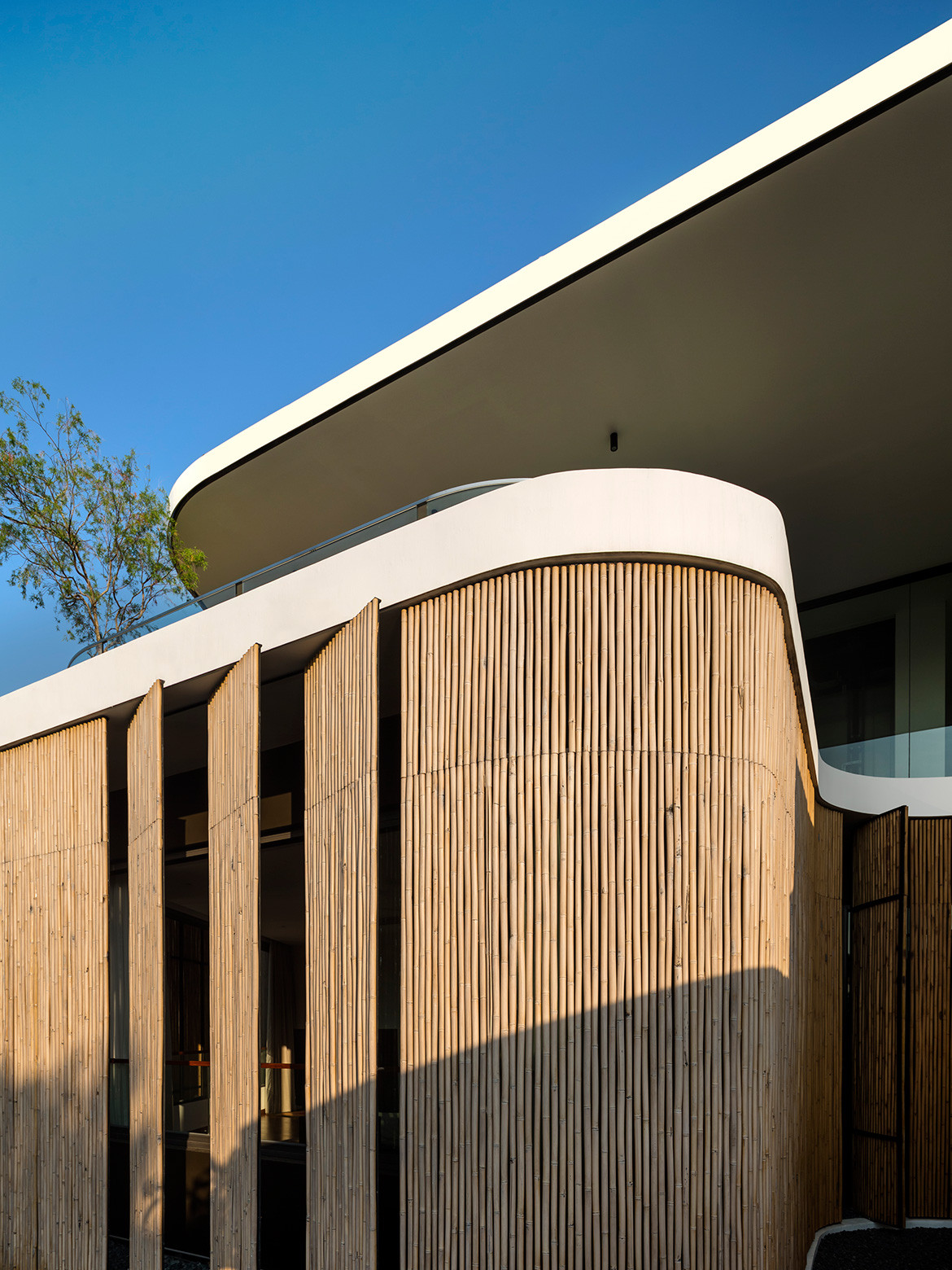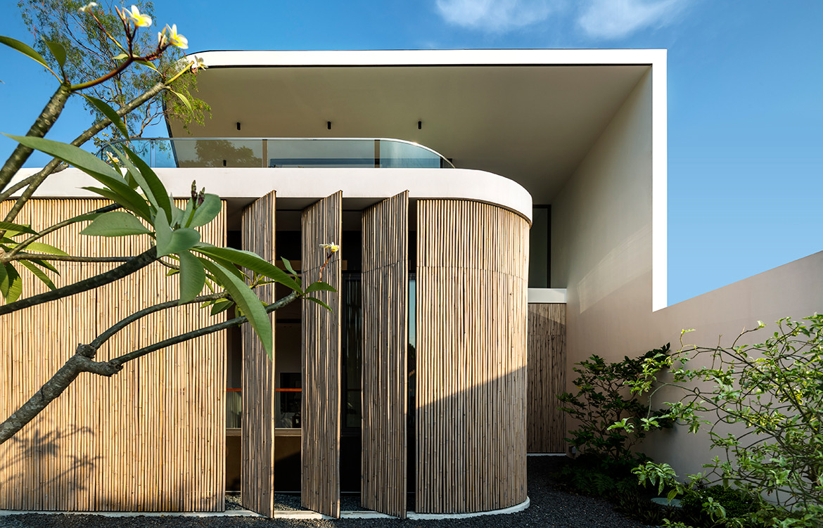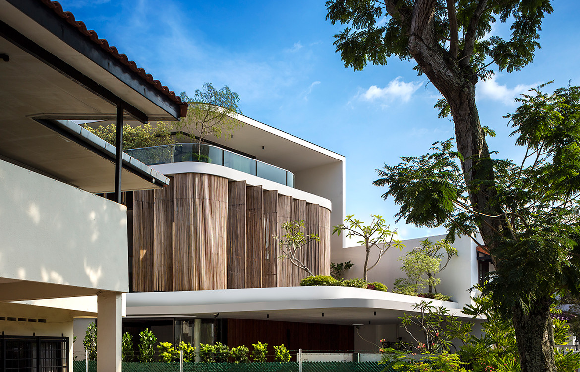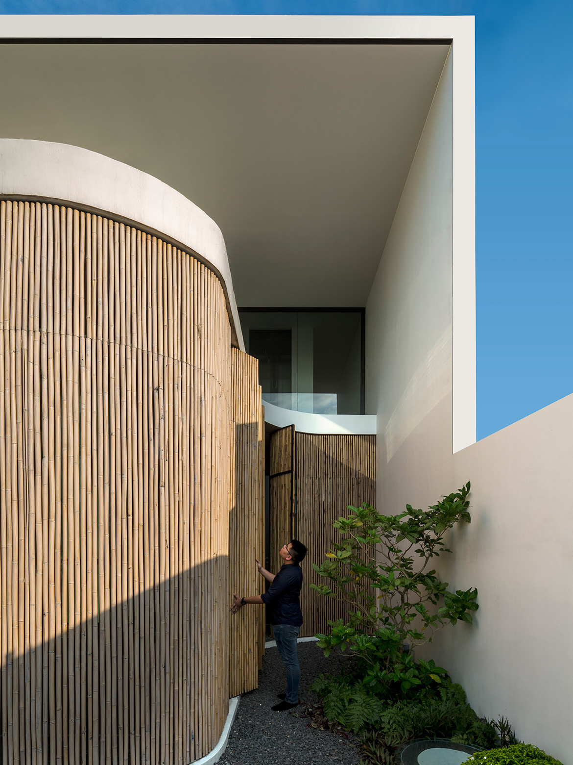 The result is an elegant curving skin of operable screens made of vertical bamboo columns that forms a second skin to the first floor of the house. The new, smaller house is set back further than the original and this has enabled the architects to have the bamboo screens extend out to the original setback line, leaving a 1-1.5 metre gap to the façade. The effect of this is to create an air bubble which helps cool the interior.