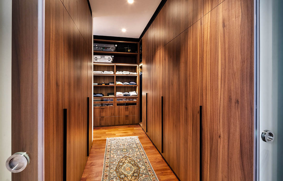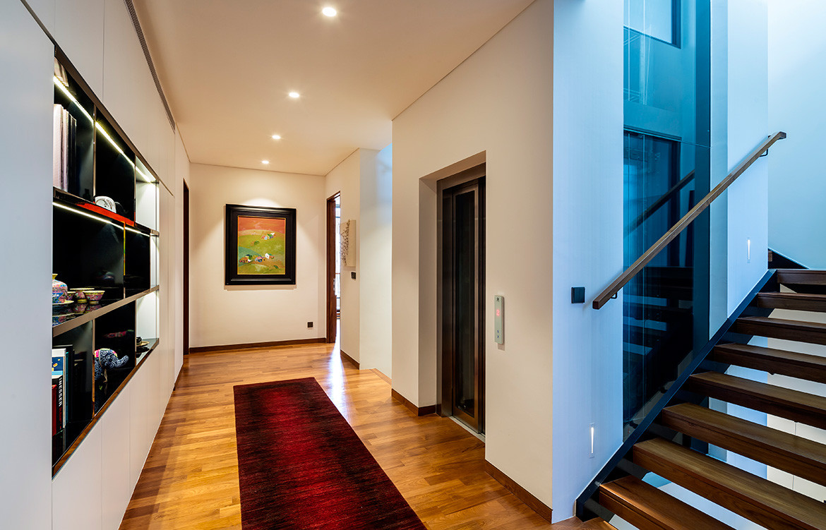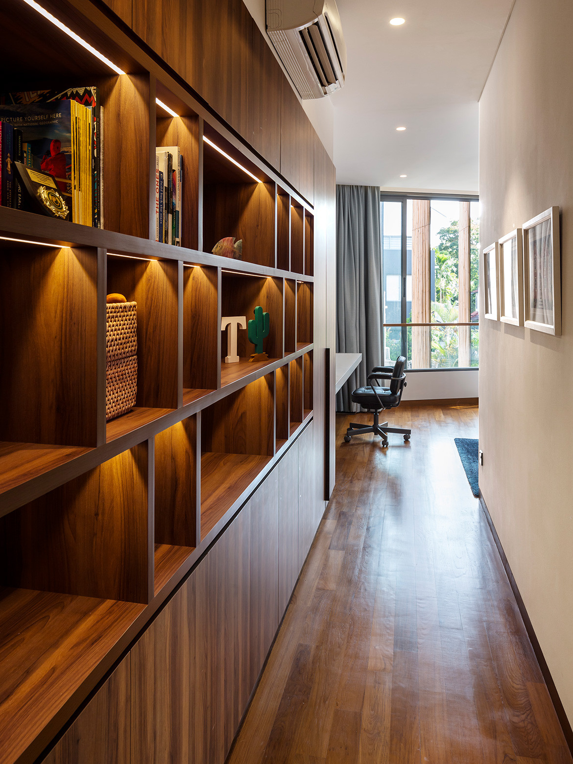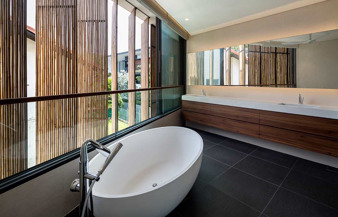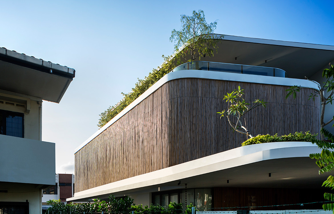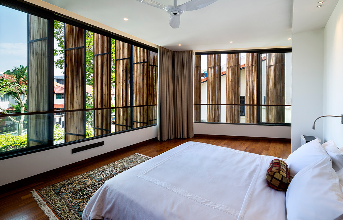 Apart from the bamboo screens, climate mitigation is helped by a large overhang that wraps over the attic aided by ample greenery.“We like to introduce pockets of greenery,” says Robin, “because in Singapore owners want to build up to the max. So we like as much as possible to bring the greenery up to the second storey and to the attic level.” In this case, there is a little garden above the garage. This not only helps cool the master bedroom, but it also provides a privacy screen from the neighbours opposite. Planting on the attic floor screens the western afternoon sunlight while also providing some green relief.