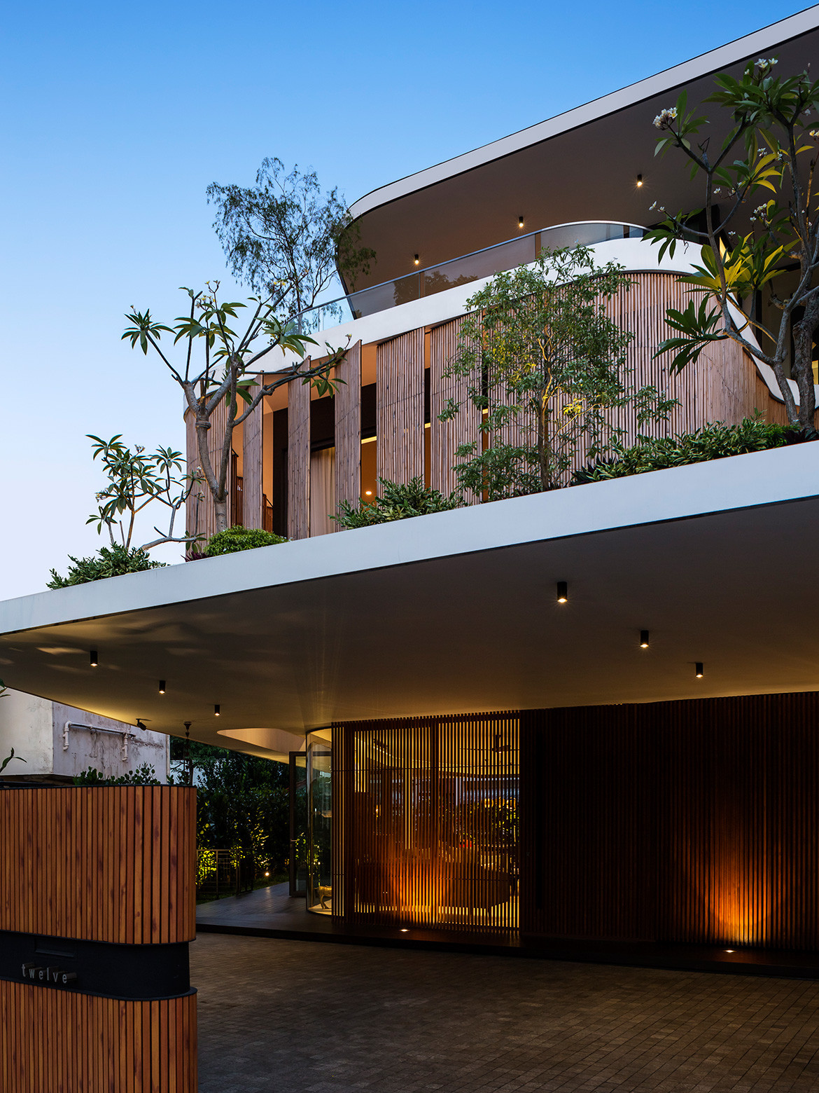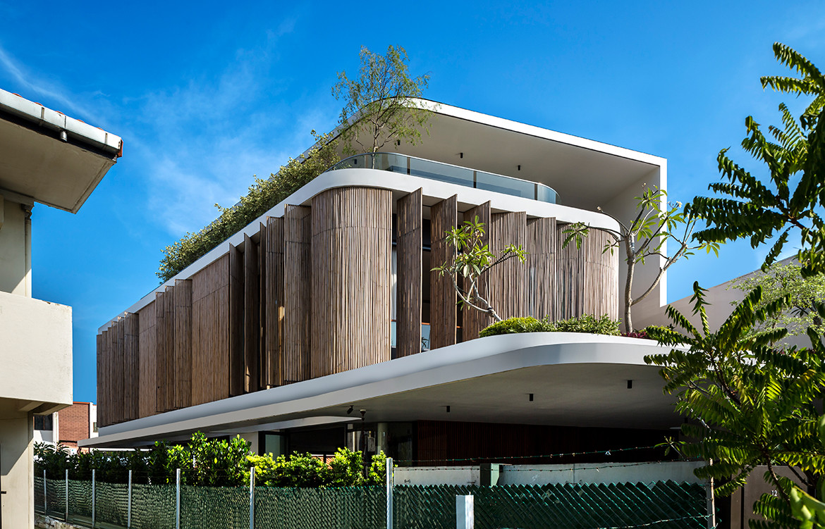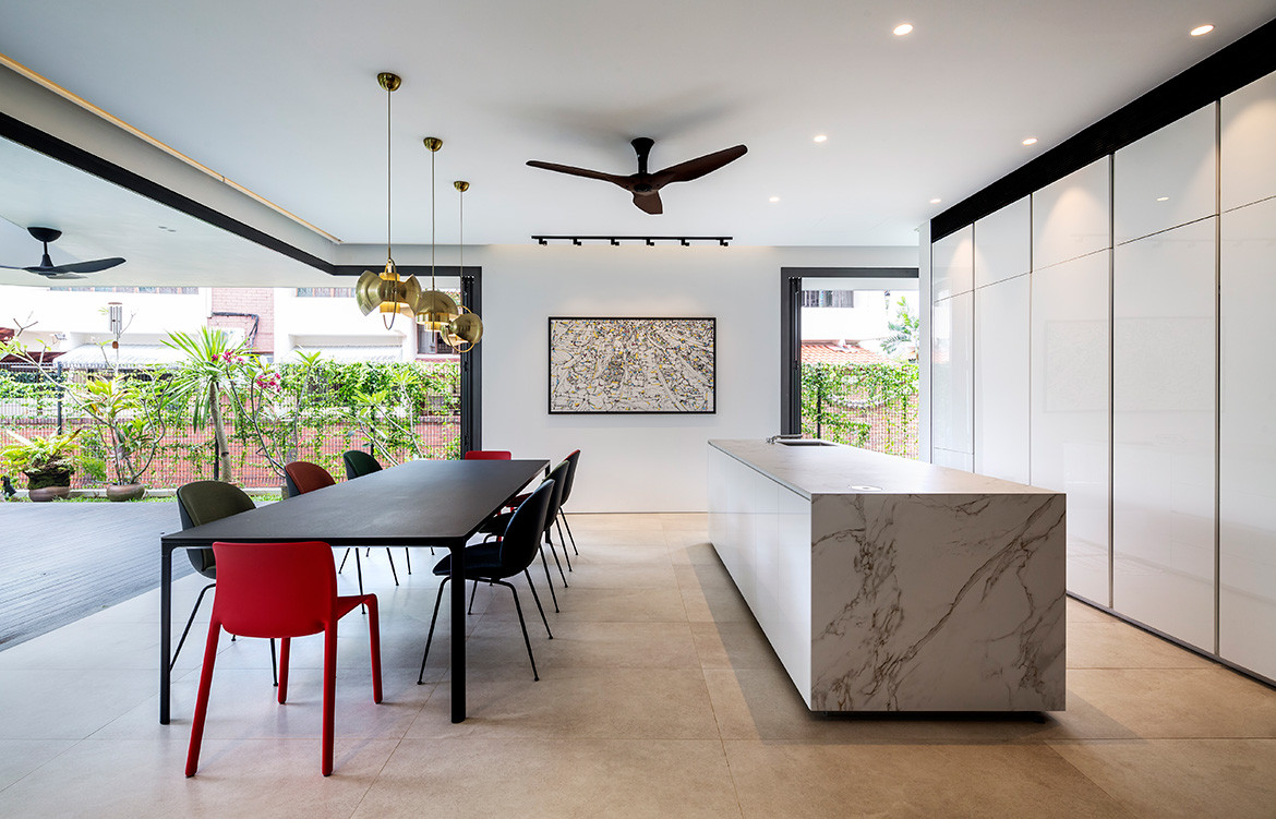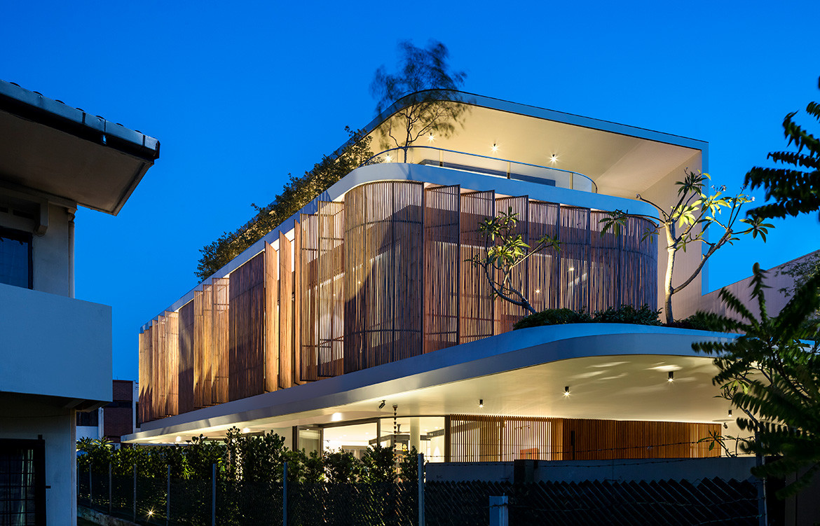 This 680-square-metre, semi-detached house replaces an earlier house on a curving triangulated site. It is for a small family of just three. “[I] had the luxury of building a small house with an ample amount of shade with deep overhangs,” says the architect, Robin Tan of Wallflower.