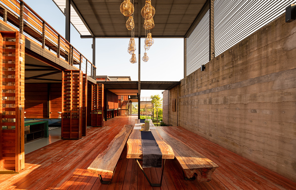 This means the house has a very fluid programme. Life in the house is not pre-determined by functionally specific spaces. Some, like the bedrooms and kitchen/dining are, but other spaces can be what anyone wants them to be, while still allowing for a balance between privacy and community. The extensive use of permeable timber screens and open pavilions drive a sense of the house being an extension of the landscape – and part of the ongoing story of this place.