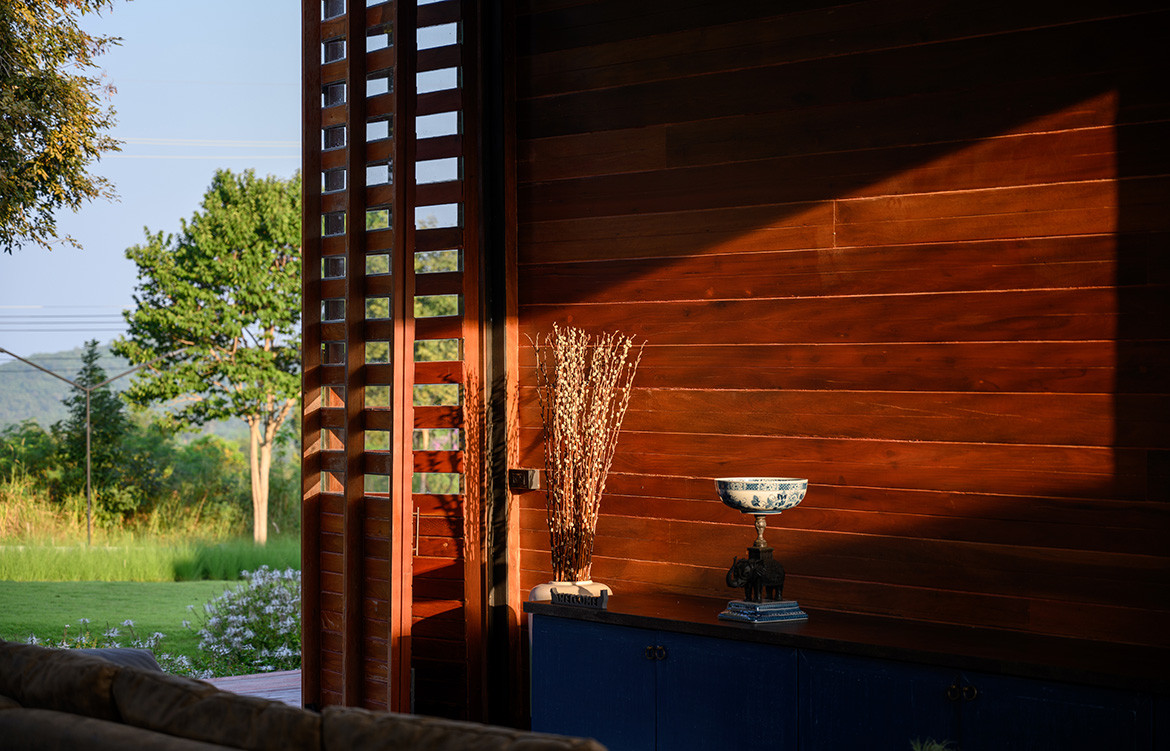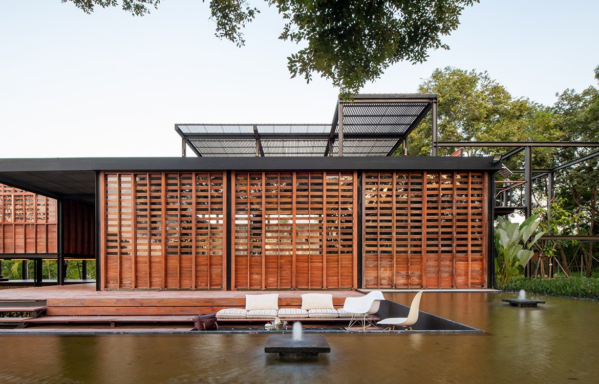 The architects also borrowed the strategy of using modular, pre-fabricated timber systems, resulting in a structure that retains the aesthetic appeal of the timber façade of the Korat House, but in a very lightweight form. In fact, the house seems almost to de-materialise without any sense of imposing itself on the landscape.