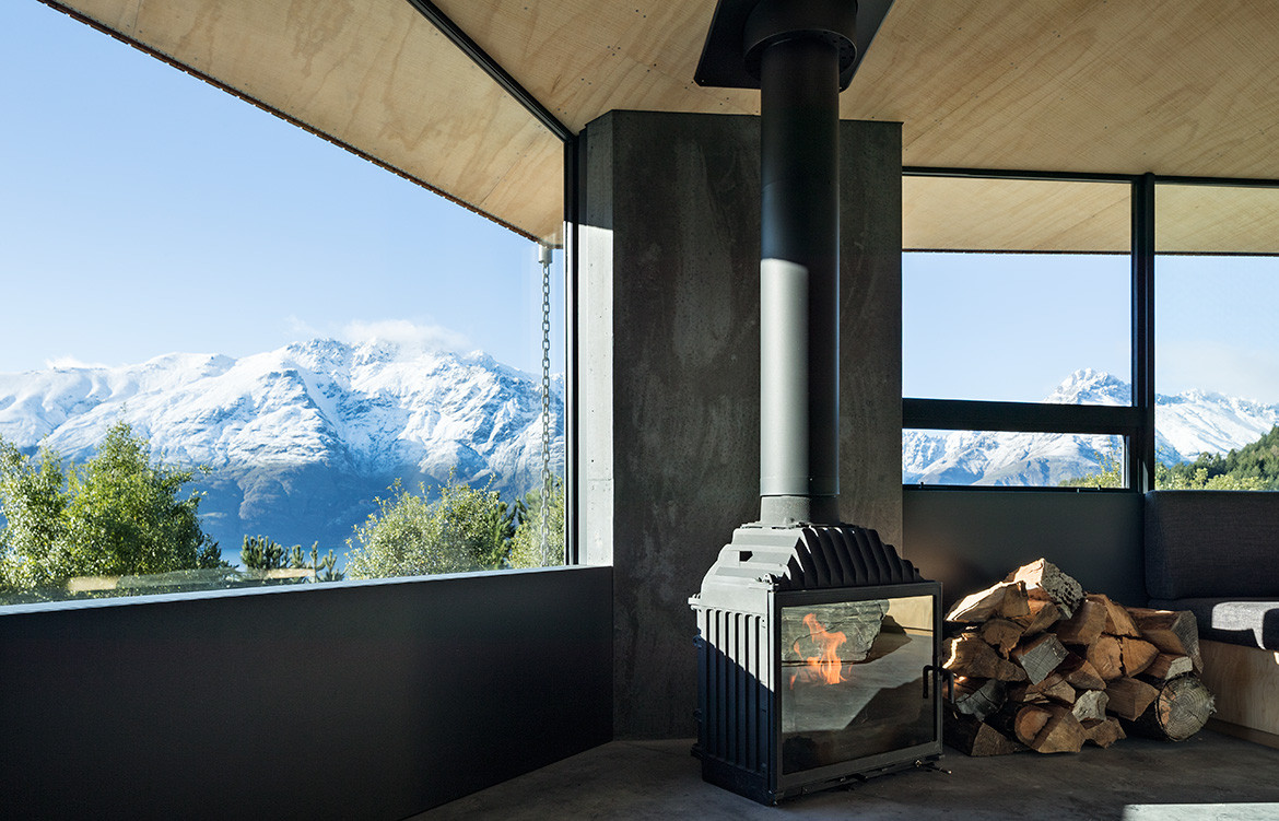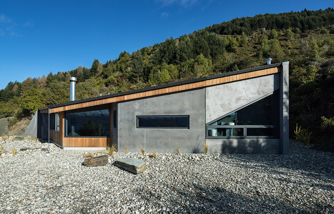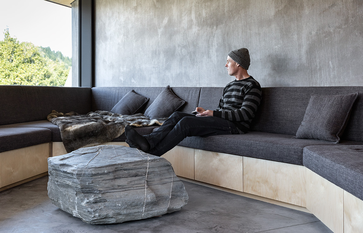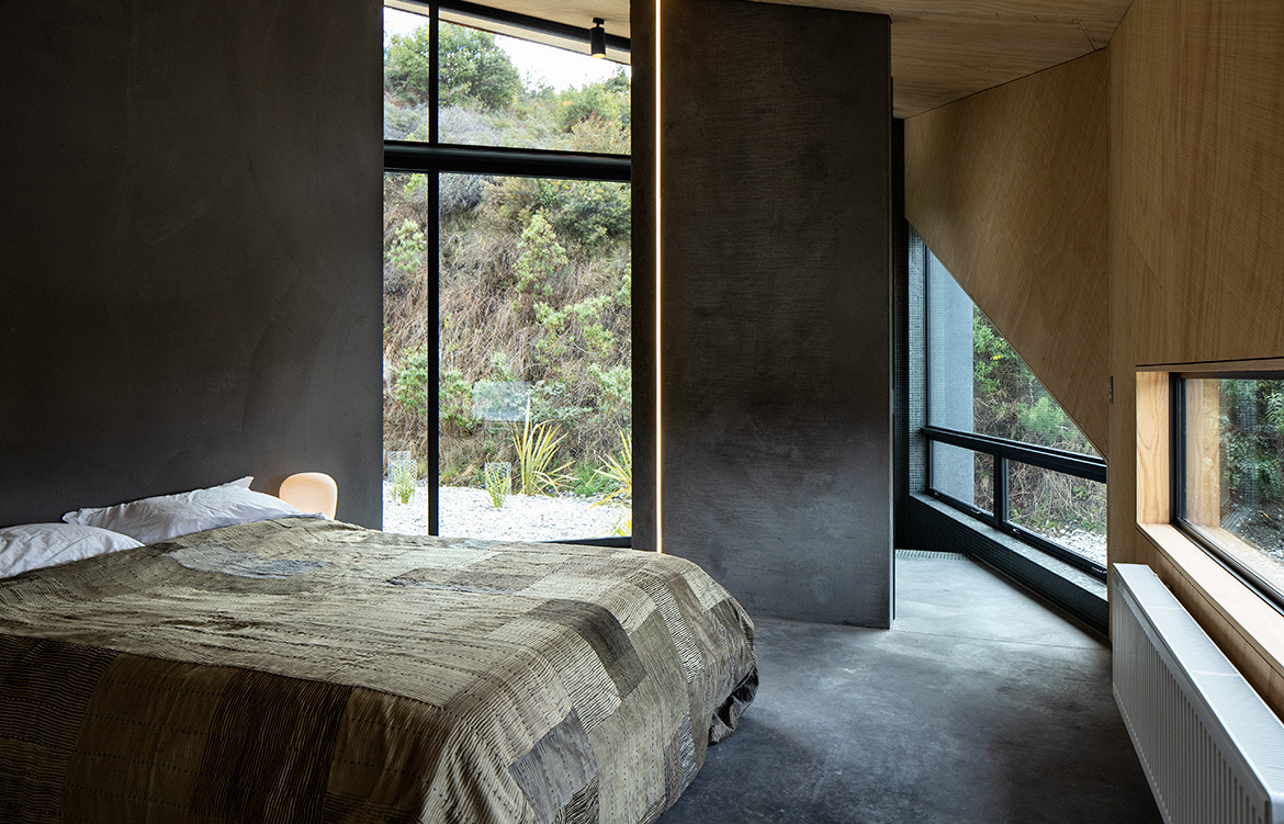 While Sam’s hut is on the forest floor, the site for this house overlooks Lake Wakatipu near Queenstown – on a platform created by a large cut in the side of the valley wall. “It wouldn’t have been my approach to create a house site,” says Vaughn. “So we began to imagine how we could somehow repair or reinstate part of the site by referencing the original contour. This led to how the house might have been formed around large rock fragments left during the platform excavation. A rock bivvy perhaps.”