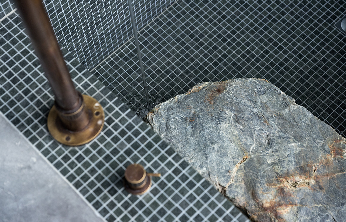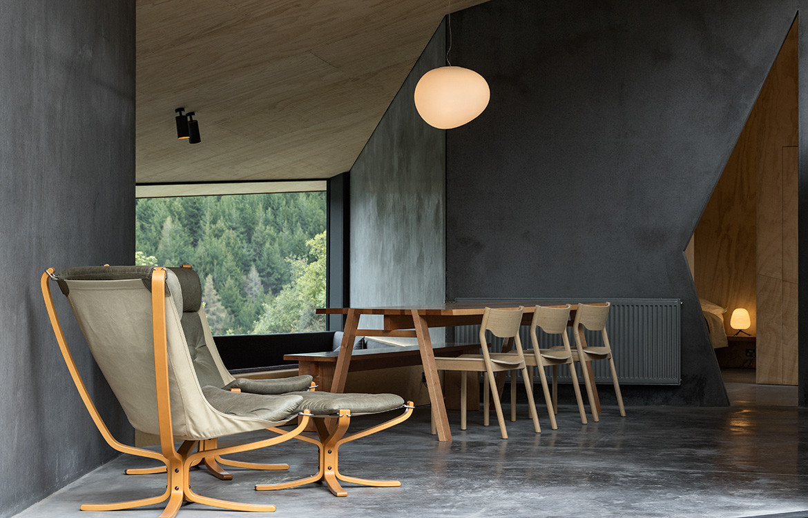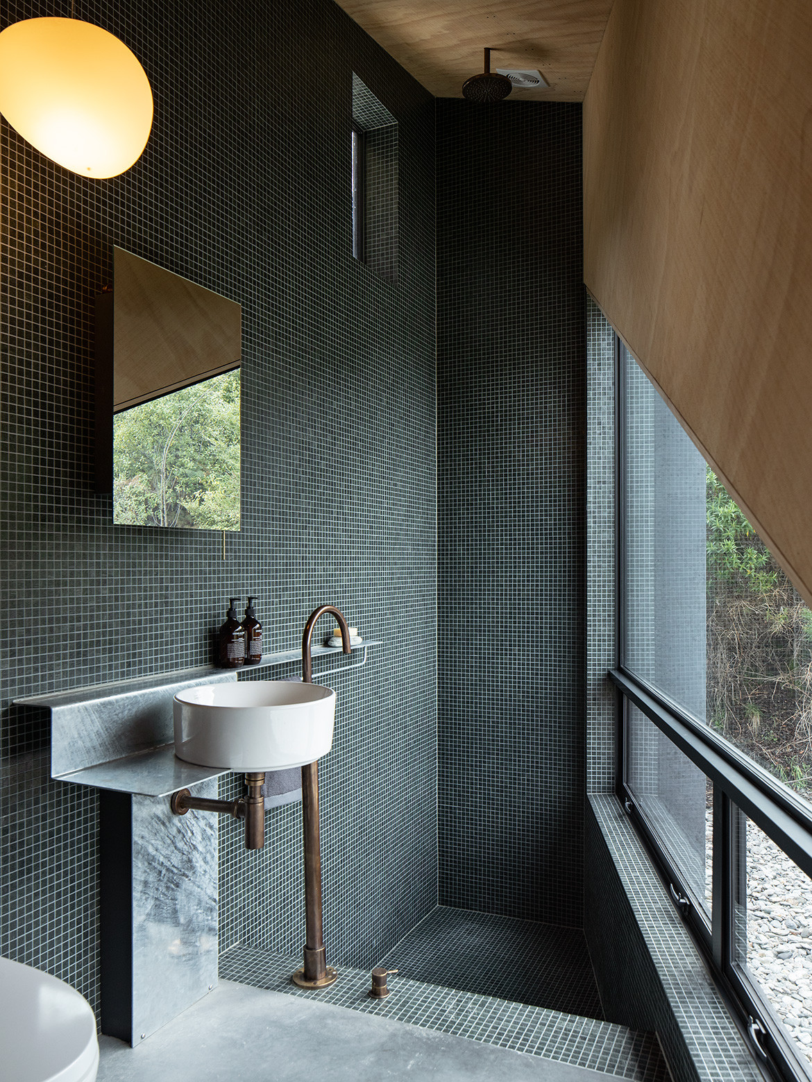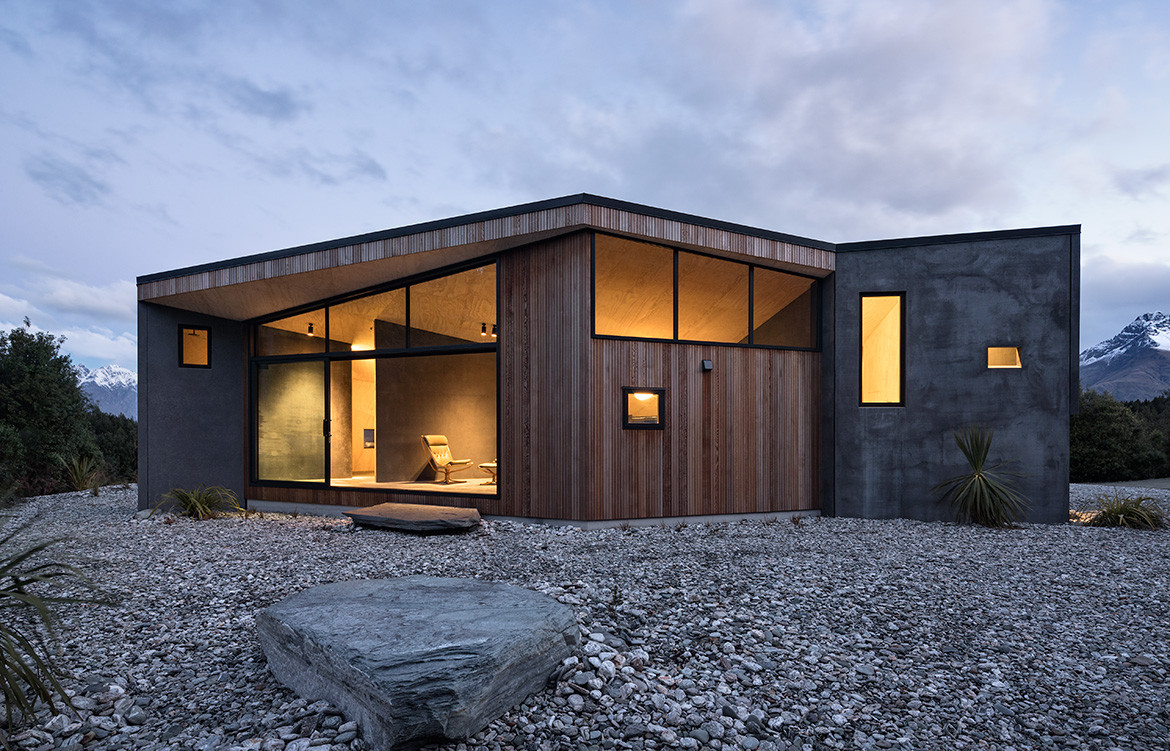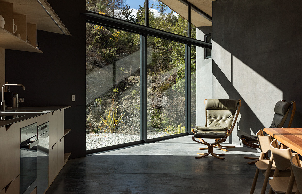 Sensitive use of materials internally creates very different moods according to the use of the room. Vaughn has assigned three areas as the notional rock fragments – the garage and two sleeping spaces. Wrapped in thermally-separated pre-cast concrete, they are coloured the same dark grey as the underlying schist. Spaces in between – kitchen, dining and living – are clad more lightly in glass and cedar.