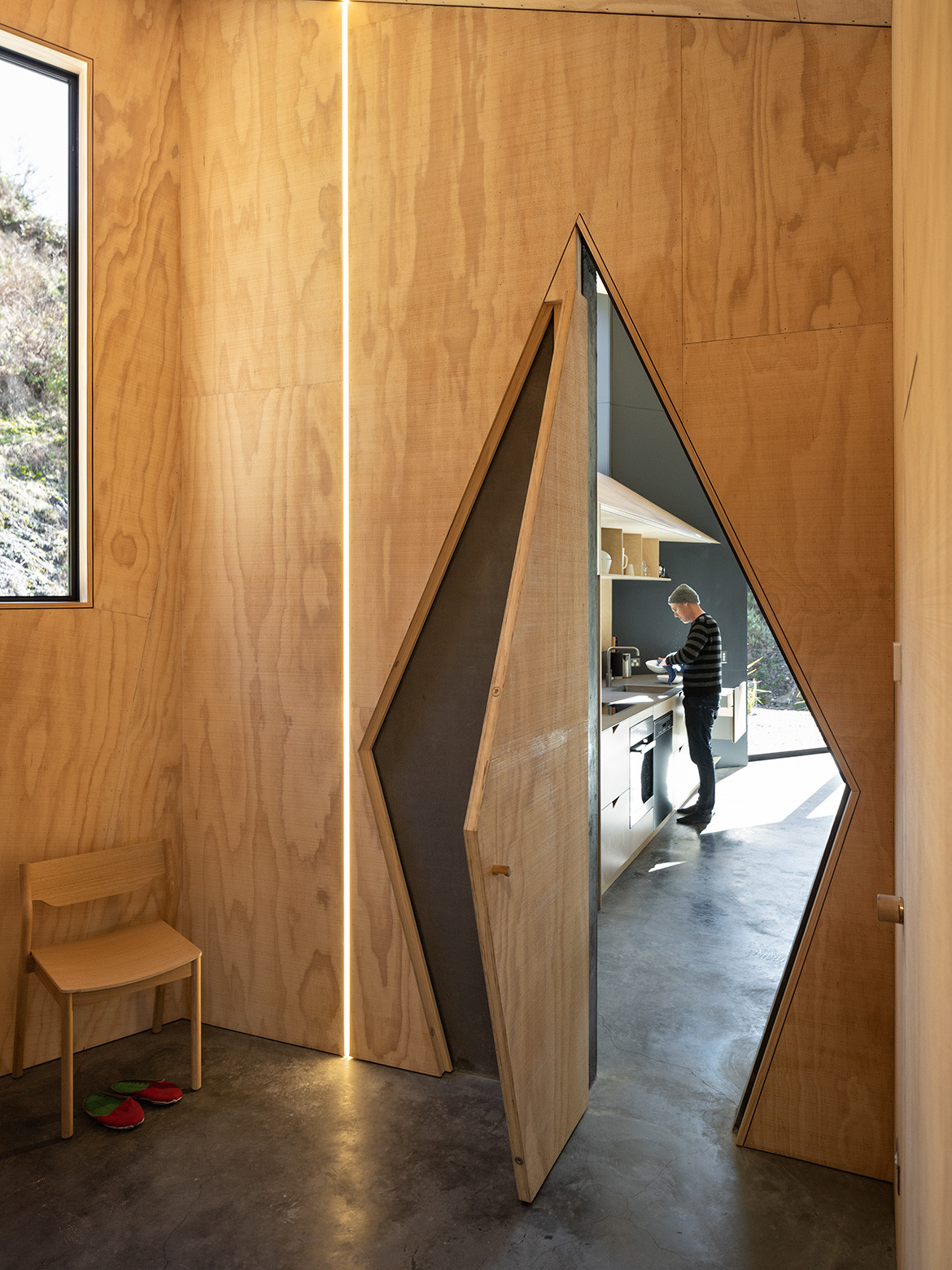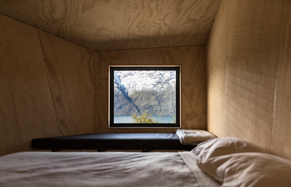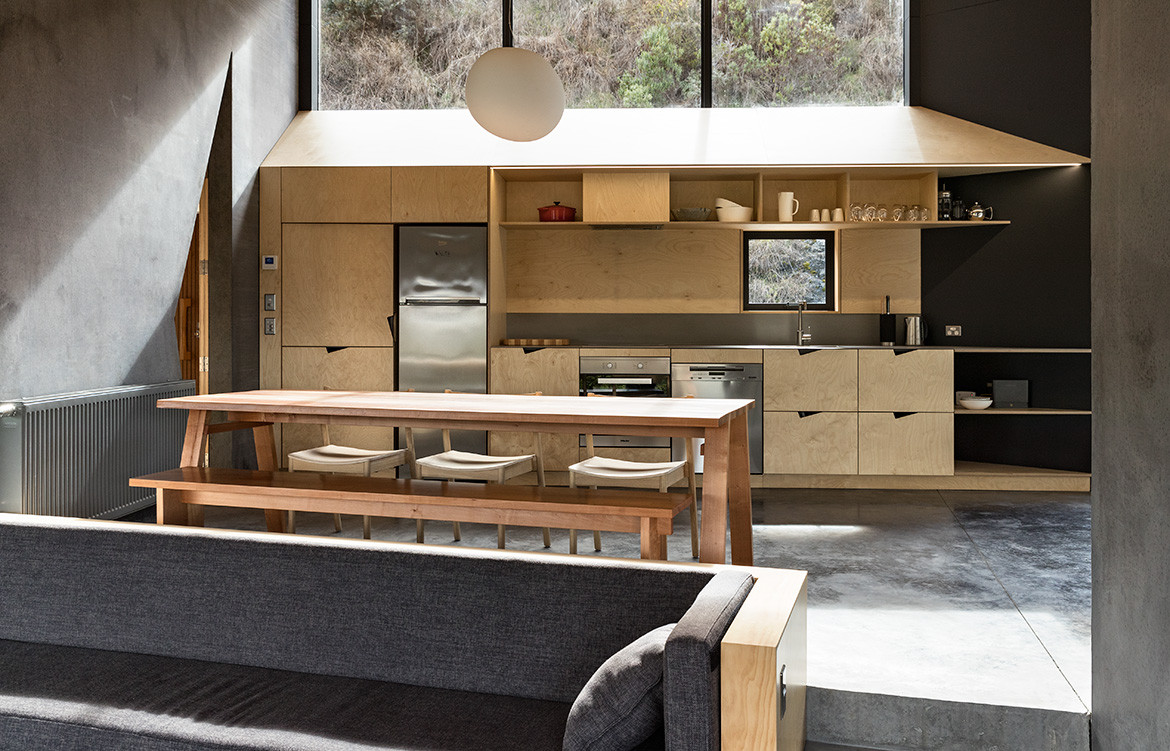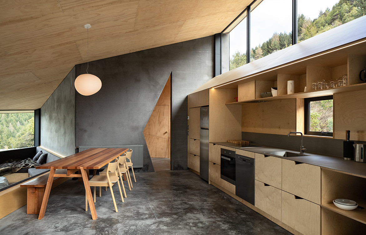 With concrete for its high thermal mass, these social spaces feel solid, hunkered down and reverberate with a slight echo. But on turning the corner into one of the sleeping areas, the whole ambience changes. Untreated band-sawn plywood walls and ceilings create softer acoustics and light. A low slot window is setup to be viewed from one bed, and a perfectly square window frames the landscape from another. These private areas are intimate and cocooned and offer true spatial variety and contrast within the small footprint.