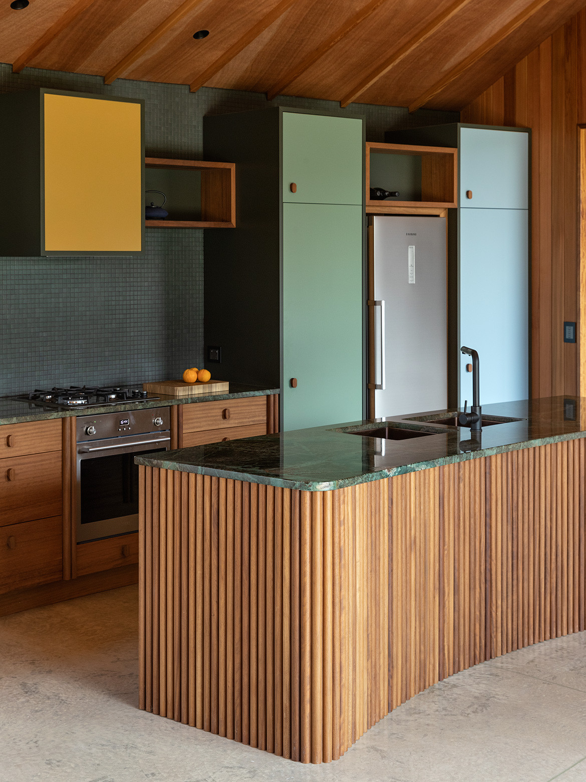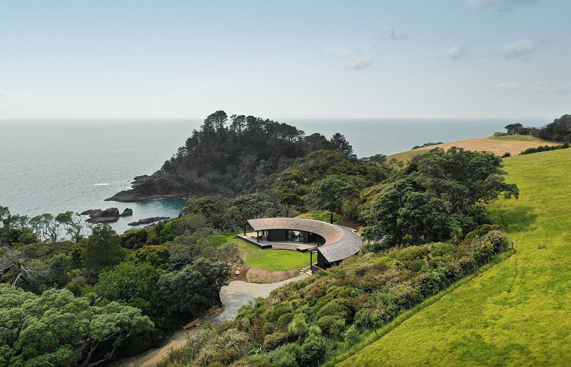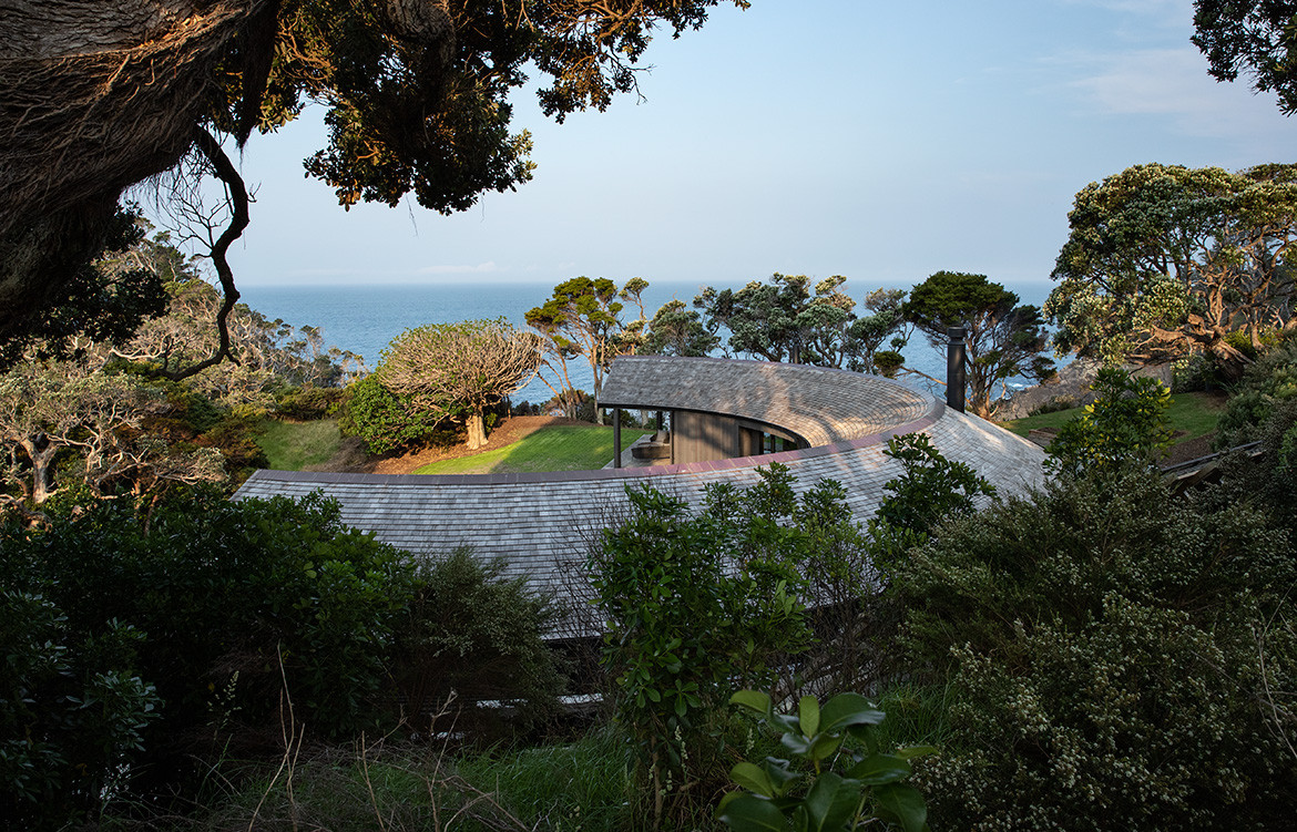 “My client grew up on the land, it was their family farm for decades,” says architect Belinda George. “He has vivid memories of riding palm leaves down the hillside and through the bush, so I hoped to evoke this sensation of sliding and encapsulation in the crescent shape of the house.”