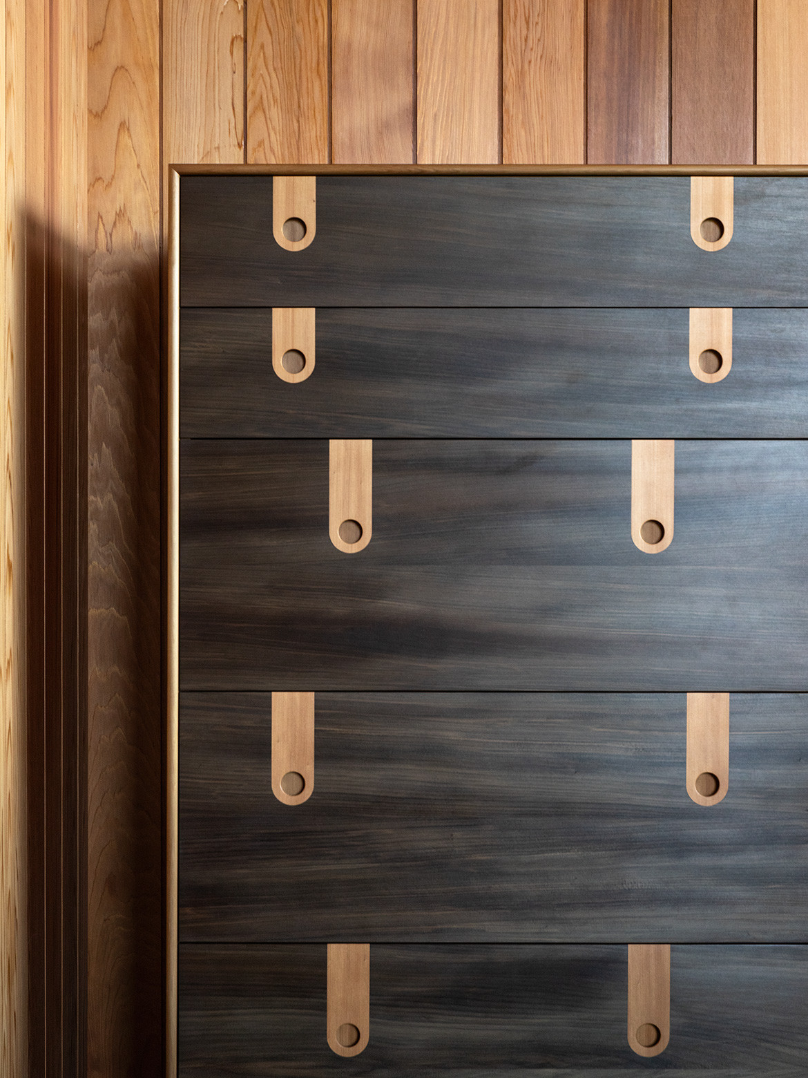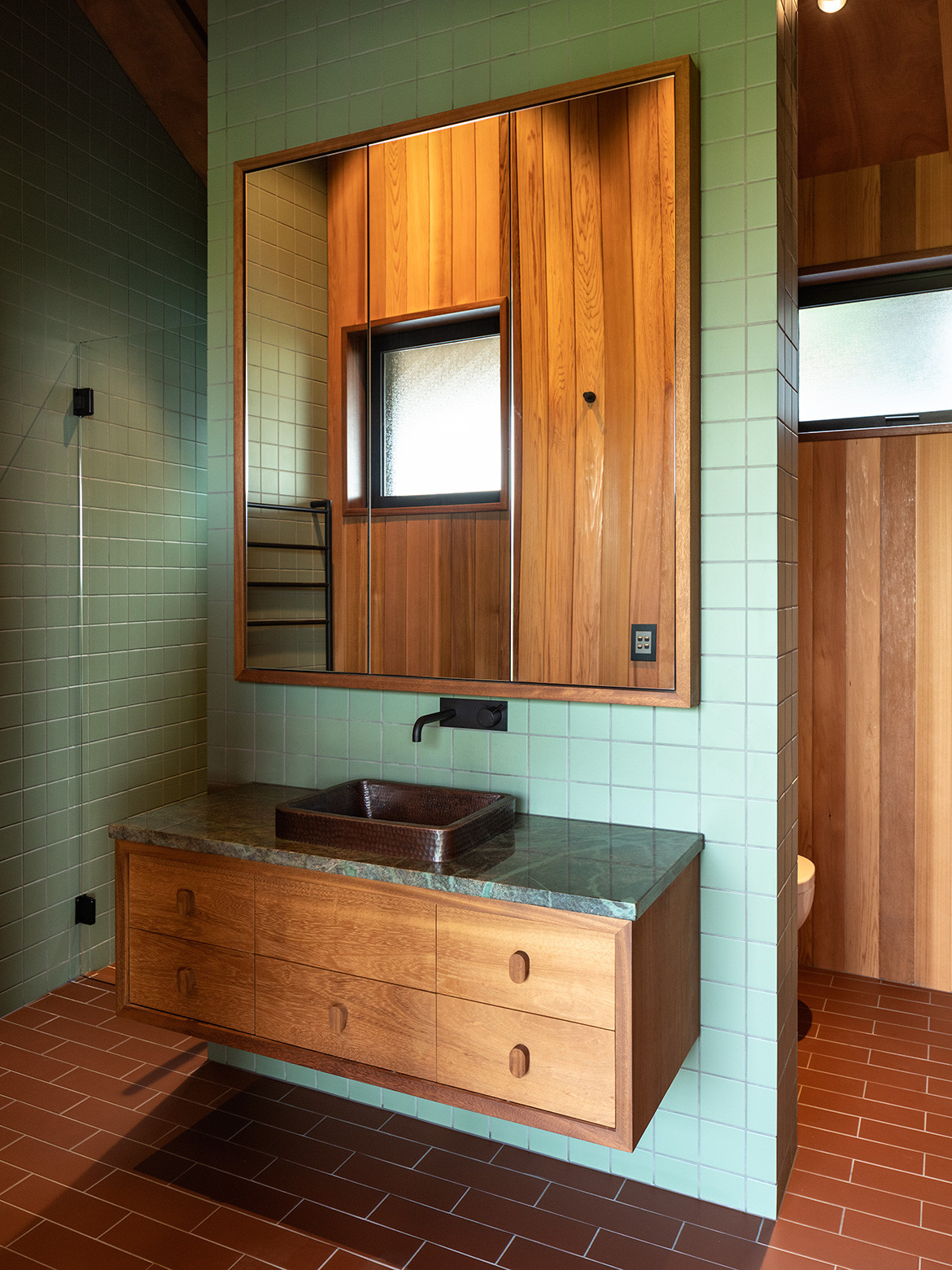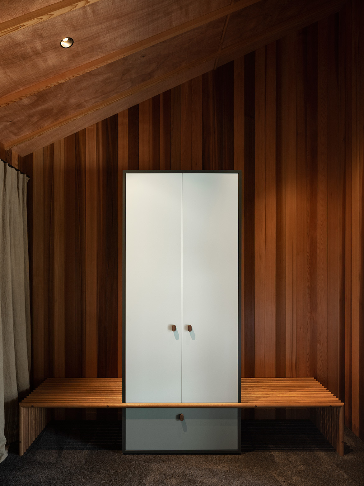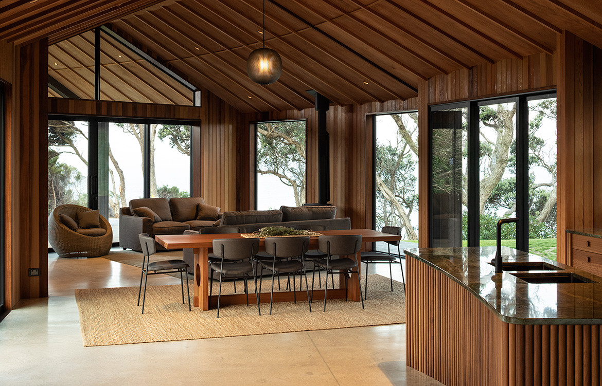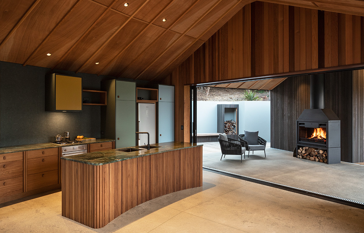 “I love the idea of ‘excavating’ the site to find connections with the past and bringing something of the client’s personality into the design,” says Belinda. “I try to pick something strong that will help inform the decision-making process throughout. So the curved form not only influenced material choice and detailing, it also reappears subtly in the cabinetry and furniture details inside.” Made from reclaimed Matai and Totara, and Iroko in the bedrooms, every piece tells a story.