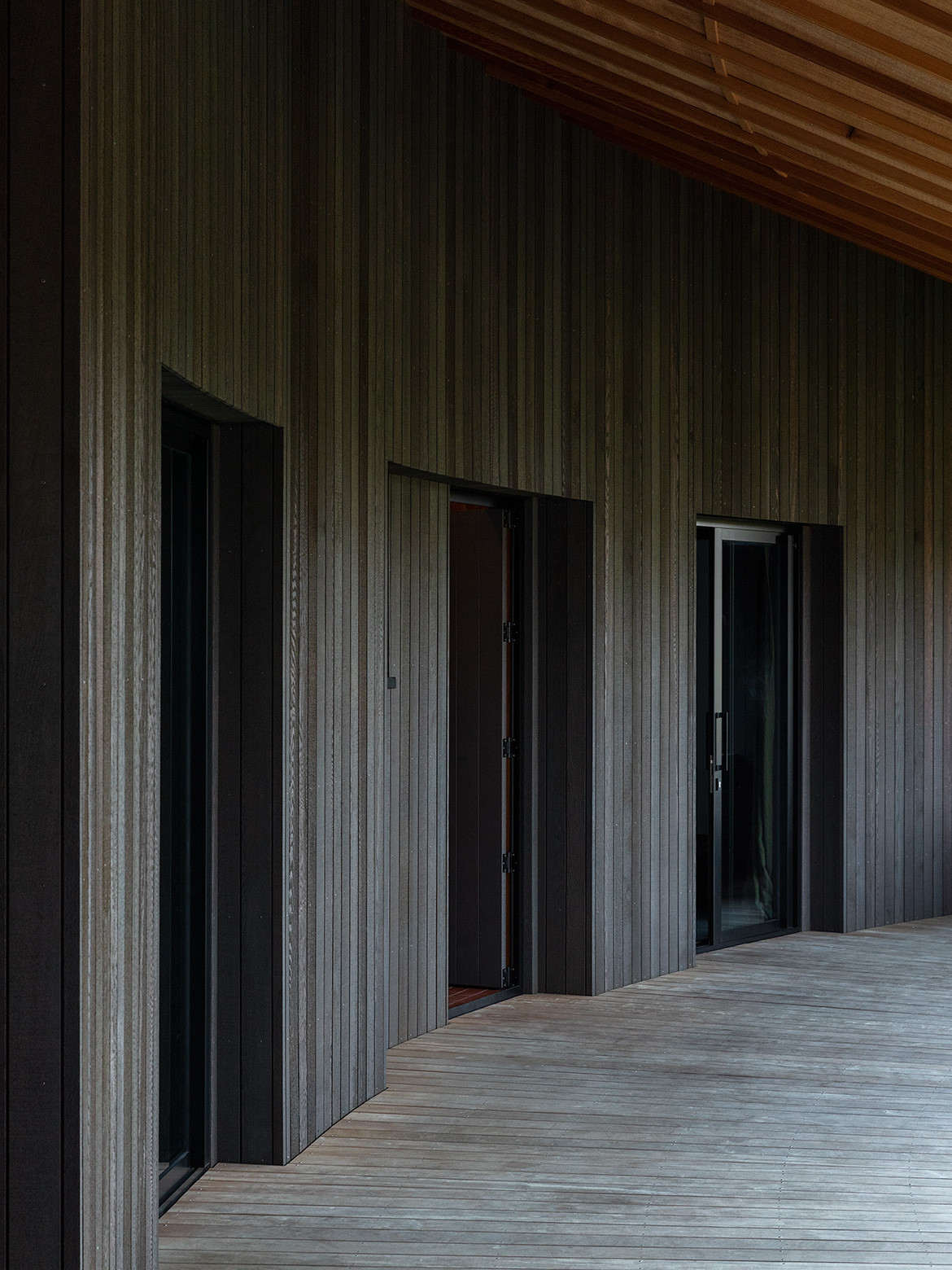 While the living room and kitchen span the full width, bedrooms are set back to create a deep, sheltered verandah. The bedrooms feel more like cabins and the experience more akin to camping. Guests walk outside to reach the bathroom and living pavilion. As a summer retreat, immersion in the sounds and smell of the coast create intimacy with the outdoors.