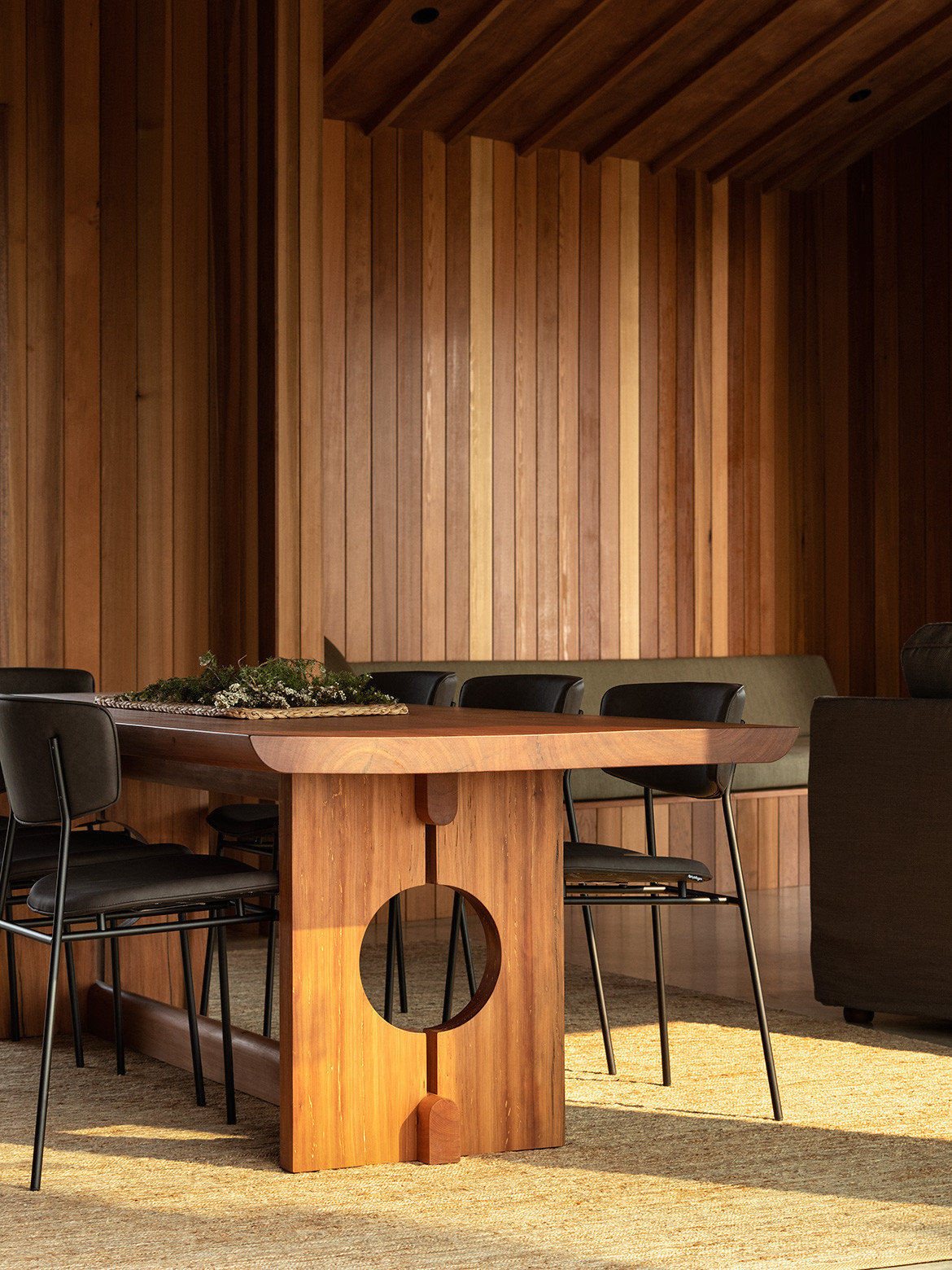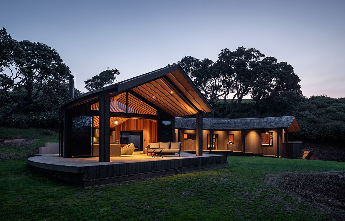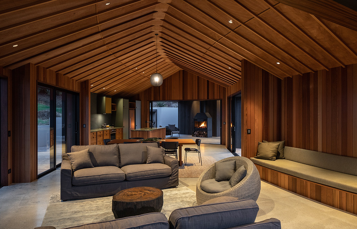 Low-slung and with generous eaves, its Pacific roof shelters 165 square metres of interior floor area arranged into two separate pavilions. Bedrooms and bathrooms are to the west, and the living area is to the east, near the cliff edge. The space between the two pavilions houses an outdoor fireplace and seating area and is protected from the elements by the roof floating uninterrupted overhead.