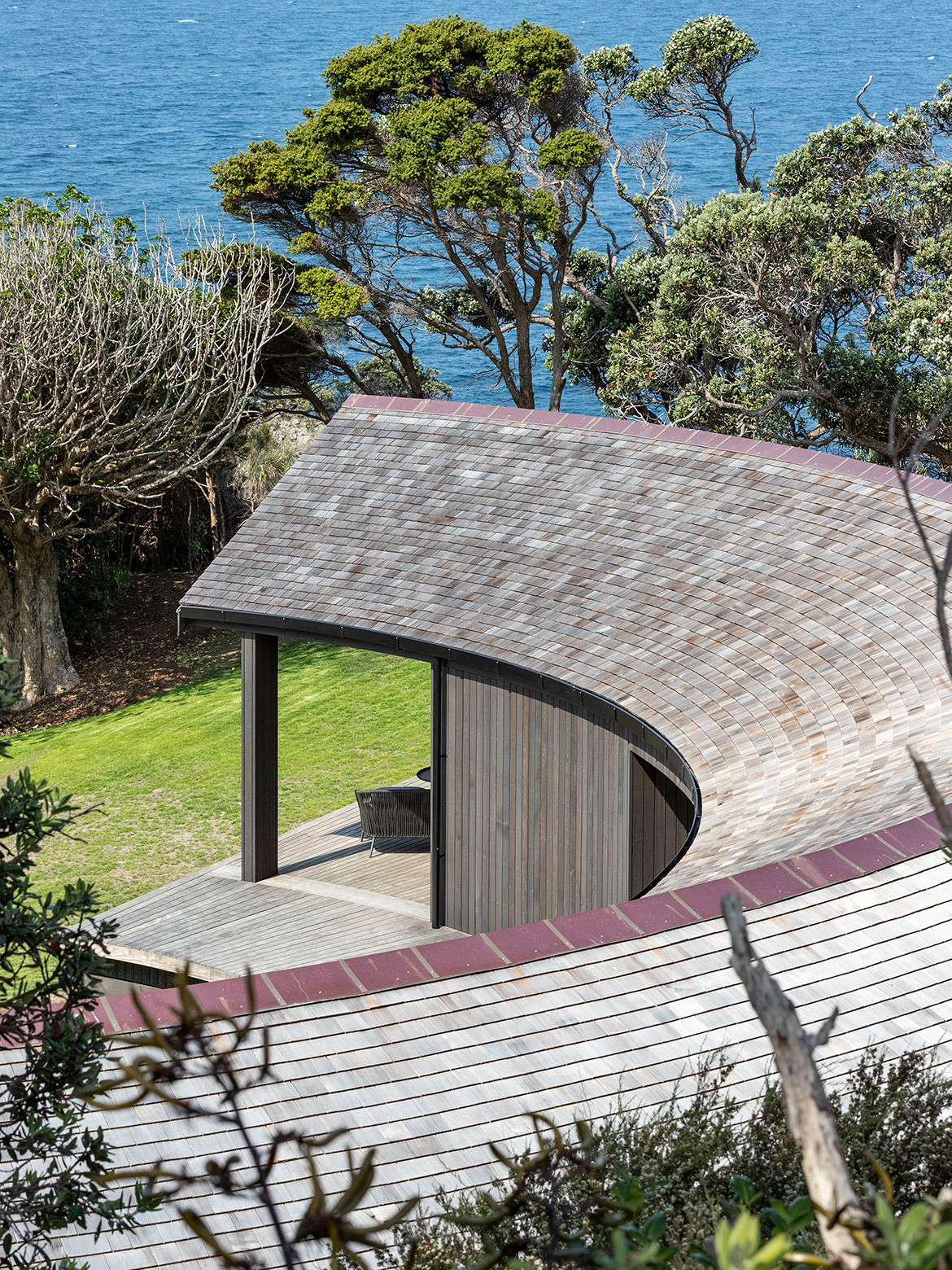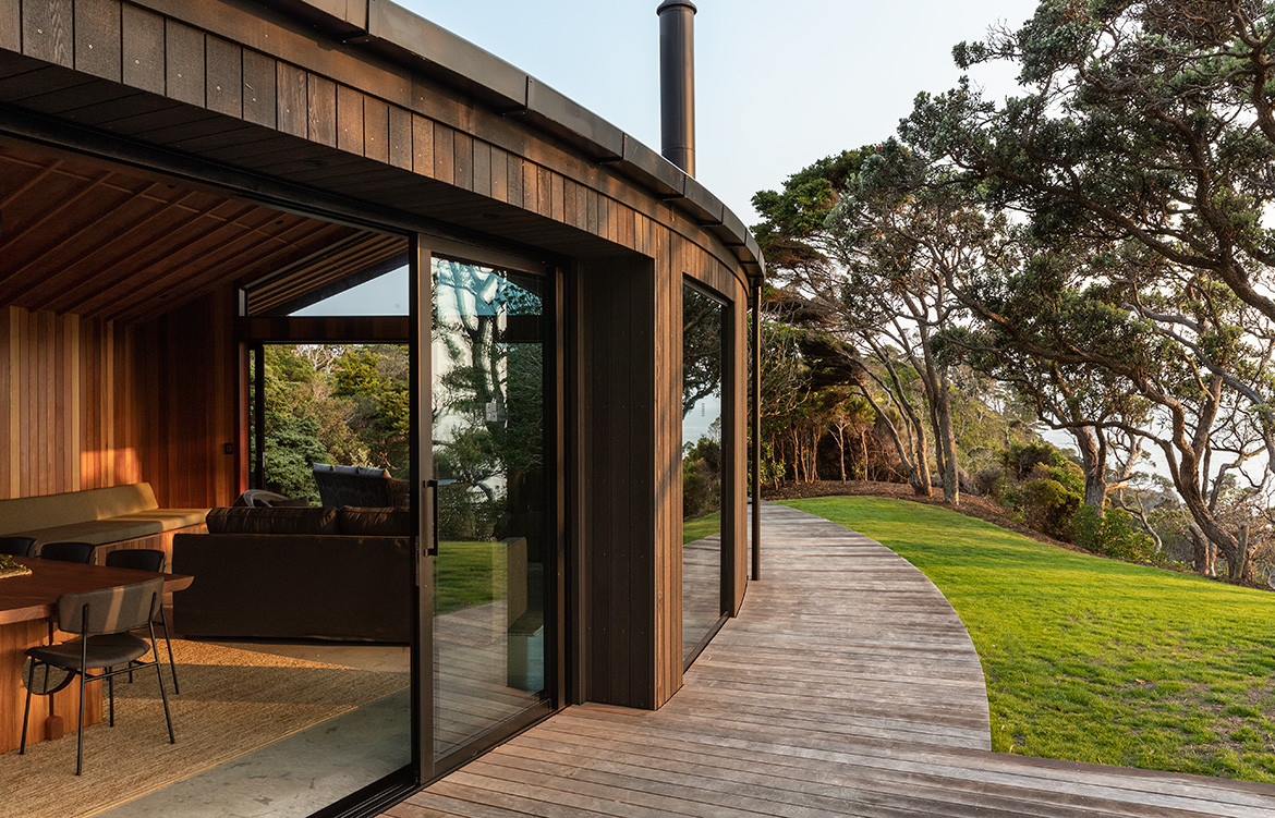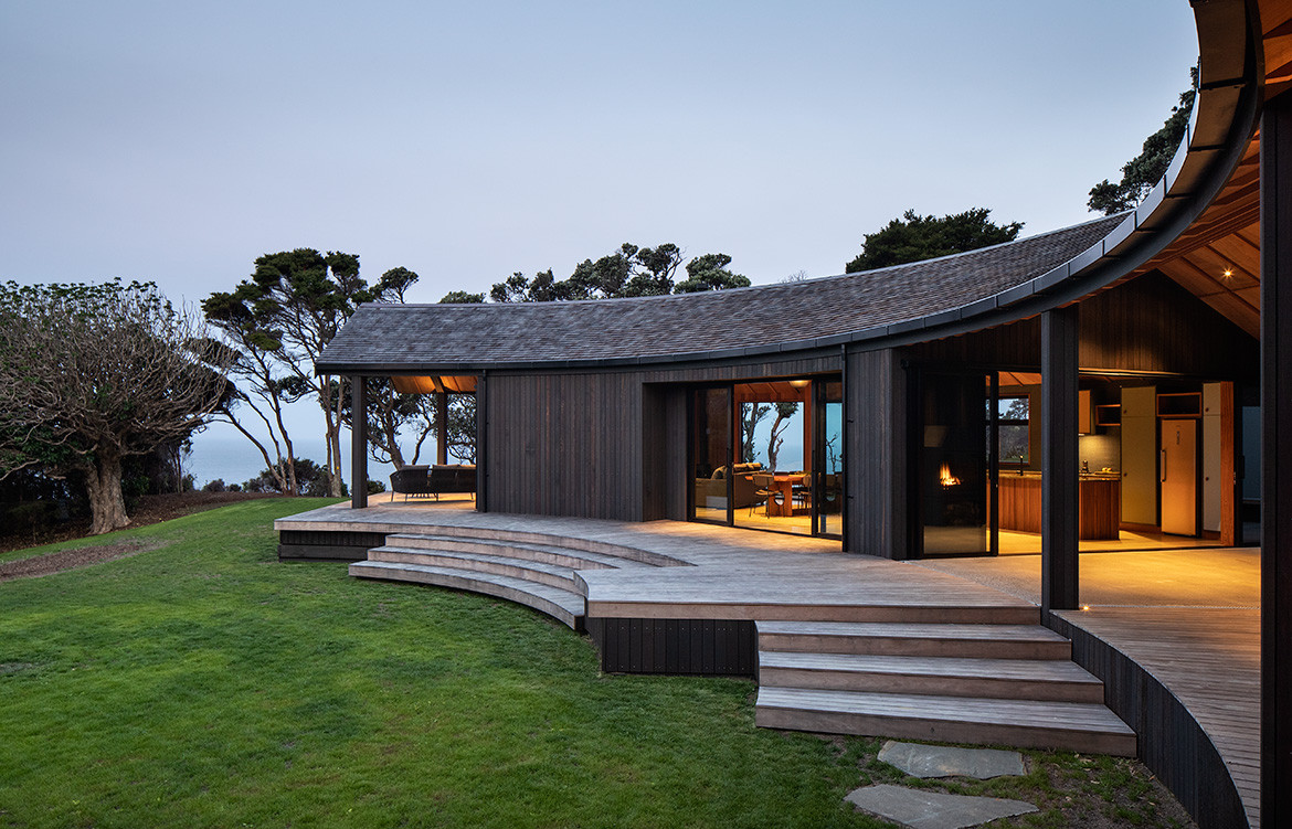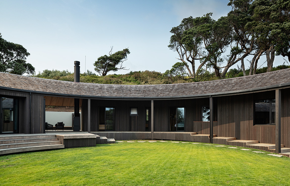 When most coastal houses act as grandstands for the ocean view, this gentle timber house prefers the bush. Curled up in a natural amphitheatre, the perfect semi-circle creates a sheltered north-facing courtyard and a different outlook from every room.
