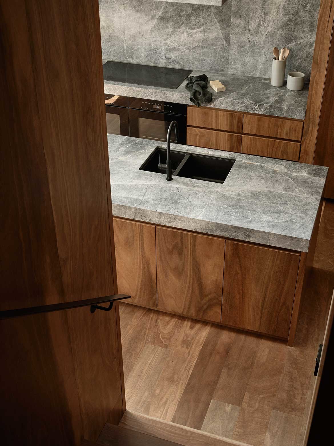 The kitchen and dining room form the heart of the home – both literally and figuratively – a place where the clients intend to spend a lot of their time. A select material palette was chosen with spotted gum timber to the floors, walls and joinery complementing the rich expanses of stone that provide warmth, texture and depth.