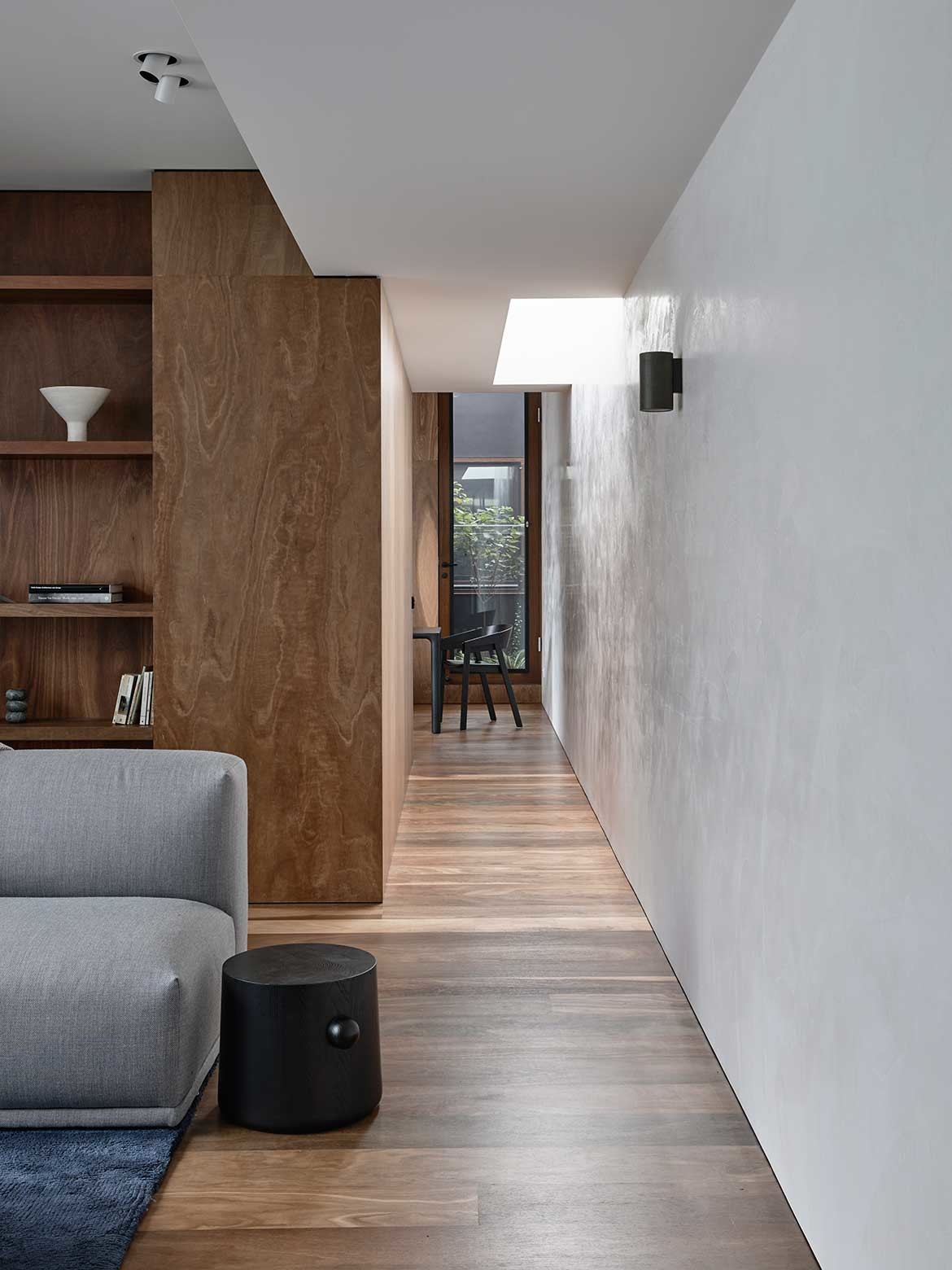 The same refined palette continues throughout the interior spaces with more spotted gum providing warmth and continuity throughout. Plasterboard is kept to a minimum with some walls left as exposed brick, applied with internal render or clad with timber lining boards.
