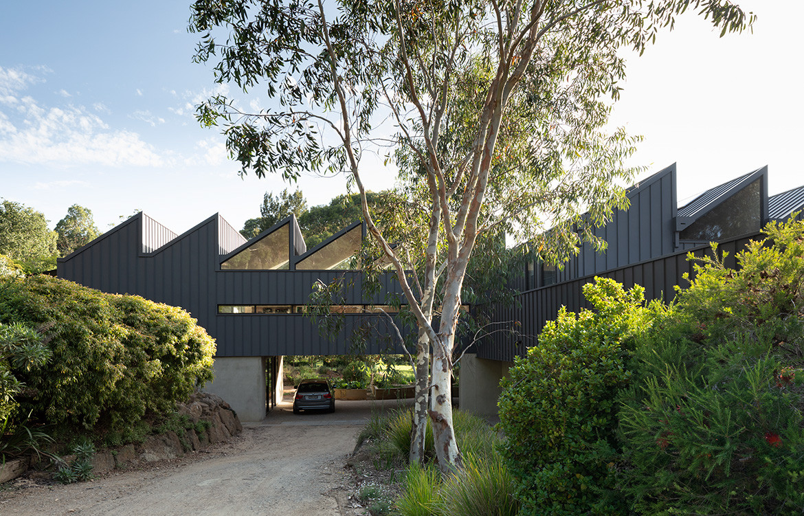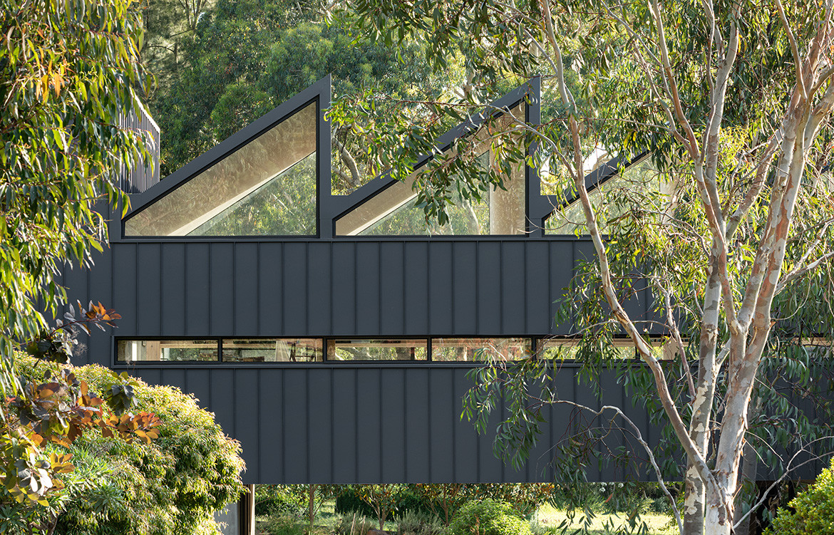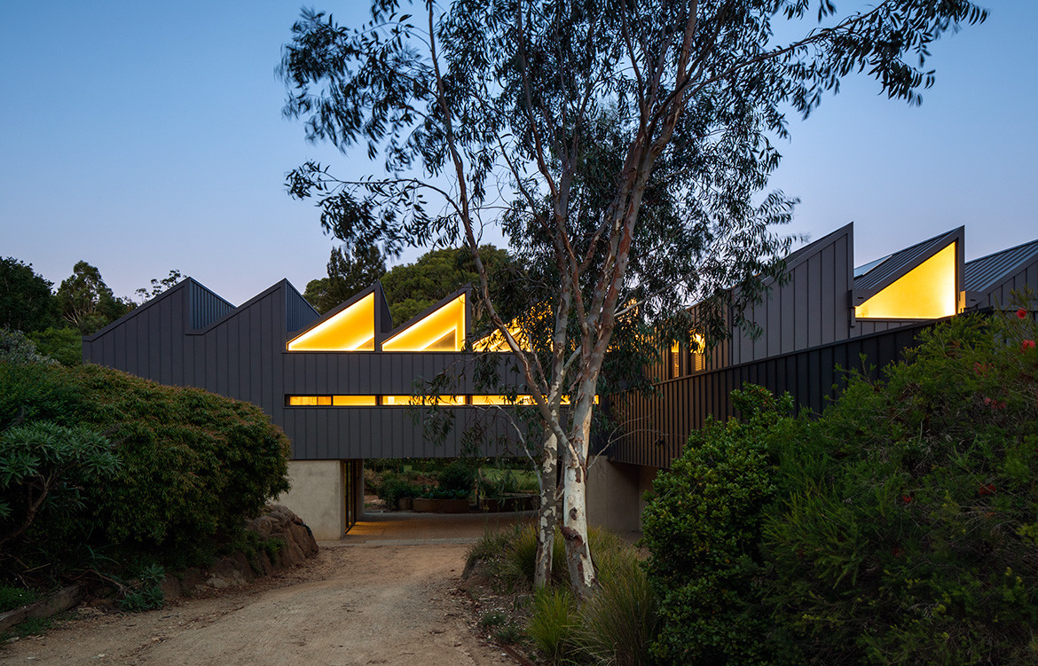 With an emphasis on functionality and practicality, the materials used by FMD Architects include cross-laminated beams expressed in structural elements, as well as in the form of a light fitting above the kitchen island bench – made from CLT but limed. The profile of this light also evokes the outline of the home’s sawtooth roof. “Sue and Peter didn’t want any superfluous details. But the CLT was also in the plan, given its ability to support considerable expanses, up to 14 metres in this case,” says Fiona, who was keen to create a certain rhythm in the design, as well as being able to frame the majestic gum trees on the property. The use of charcoal steel on the exterior picks up on the tree trunks as well as further echoing the industrial/farm aesthetic. At night, the house becomes even more animated when the interior lights create a more exaggerated profile in the bush setting.