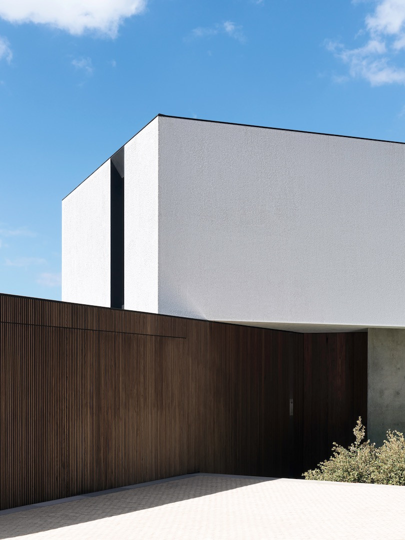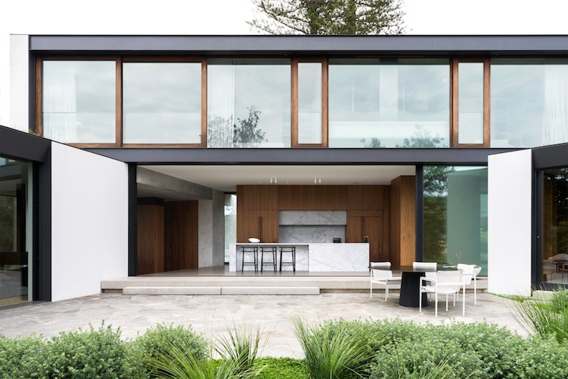 Collins Beach House is defined by three volumes that fully explore and capture the site: two sit at an angle to each other on the ground level, while another floats over the top to create a void.