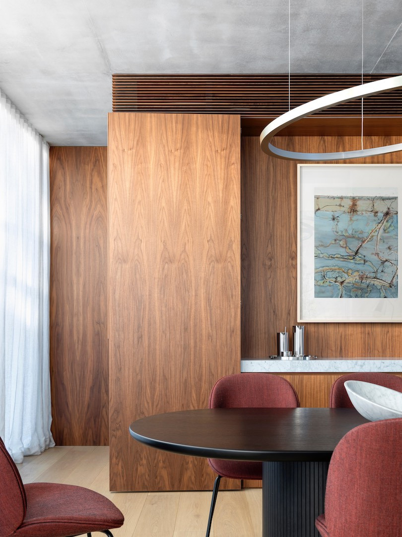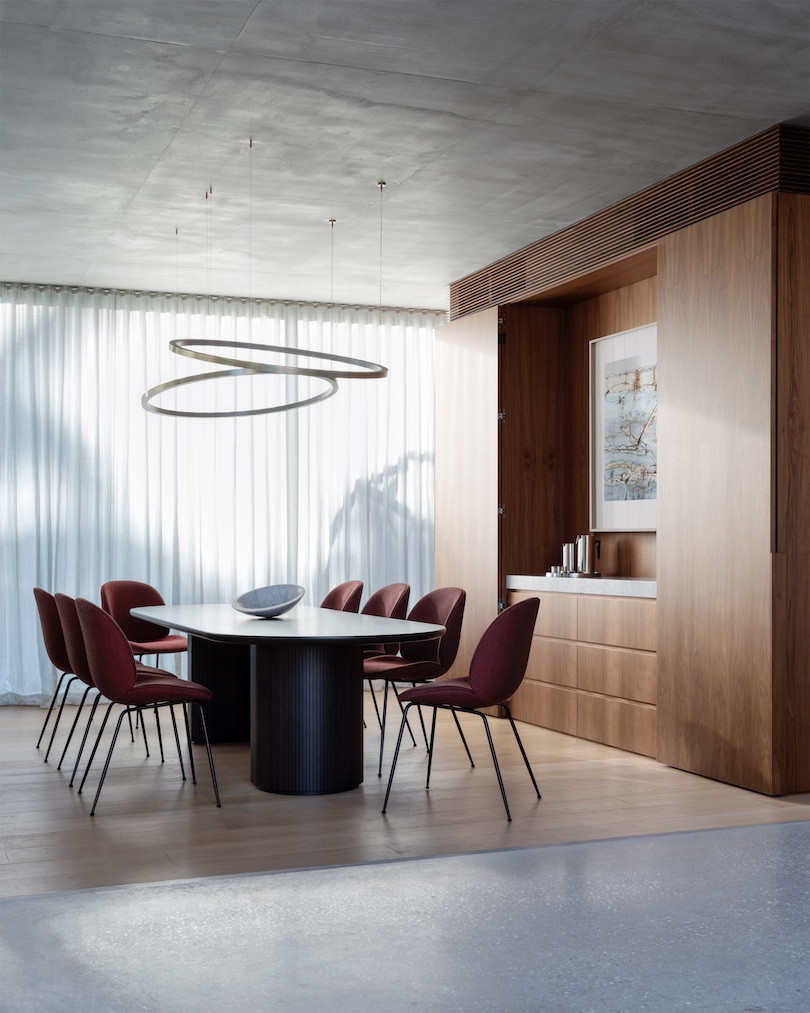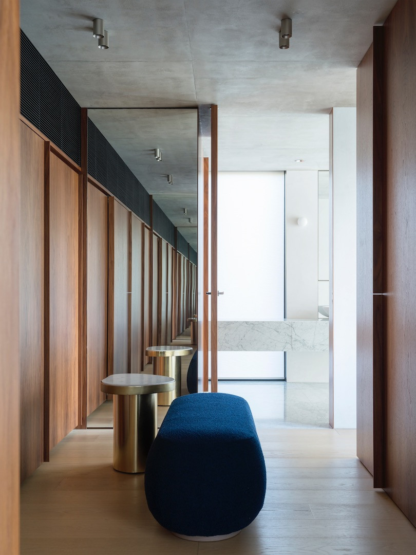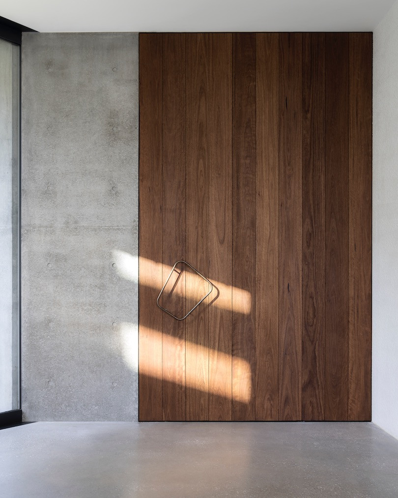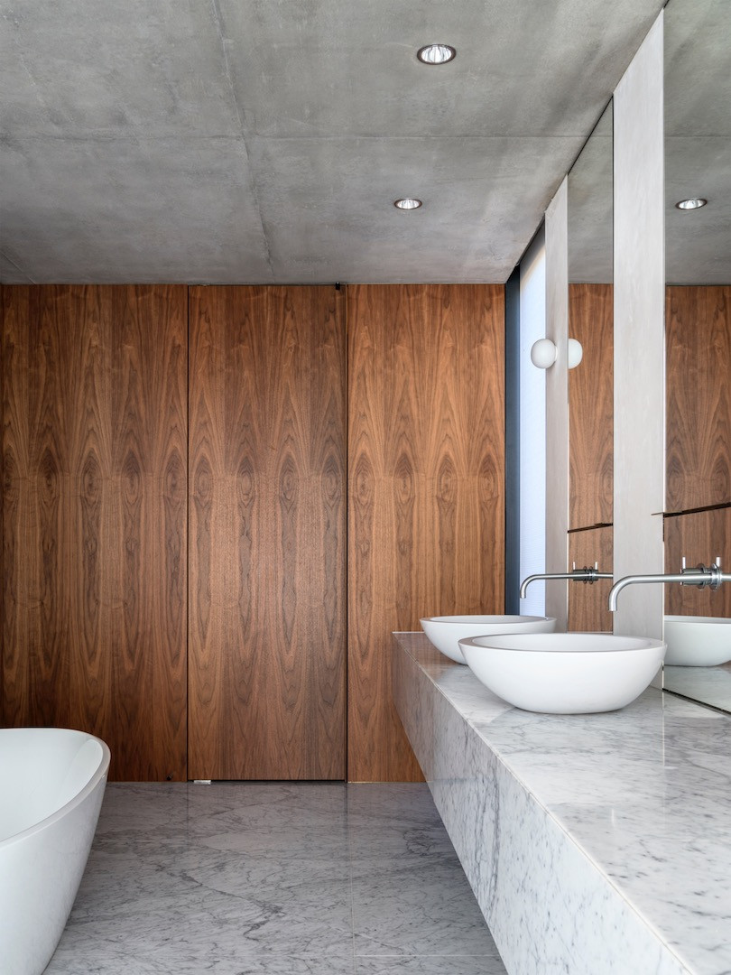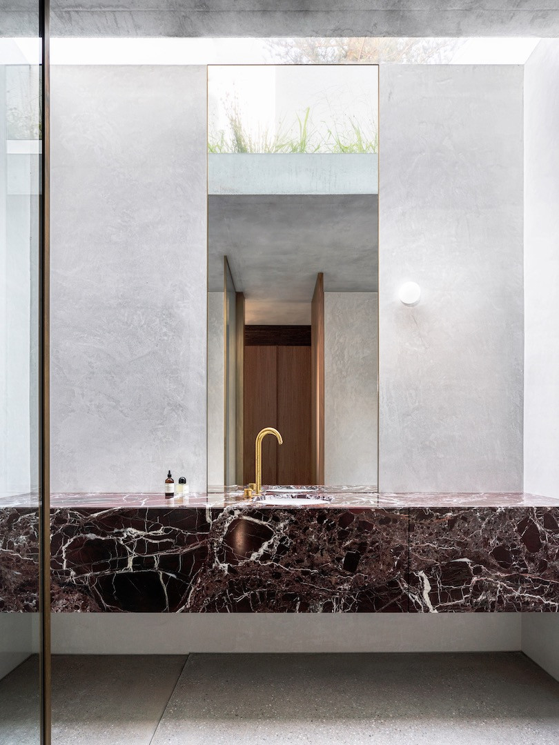 Mindful of fire regulations, the design has a concise and robust materiality of masonry, rendered and textured concrete, marble and blackbutt timber that also informs the colour palette of white, warm honey tones, greys and browns with accents of black.