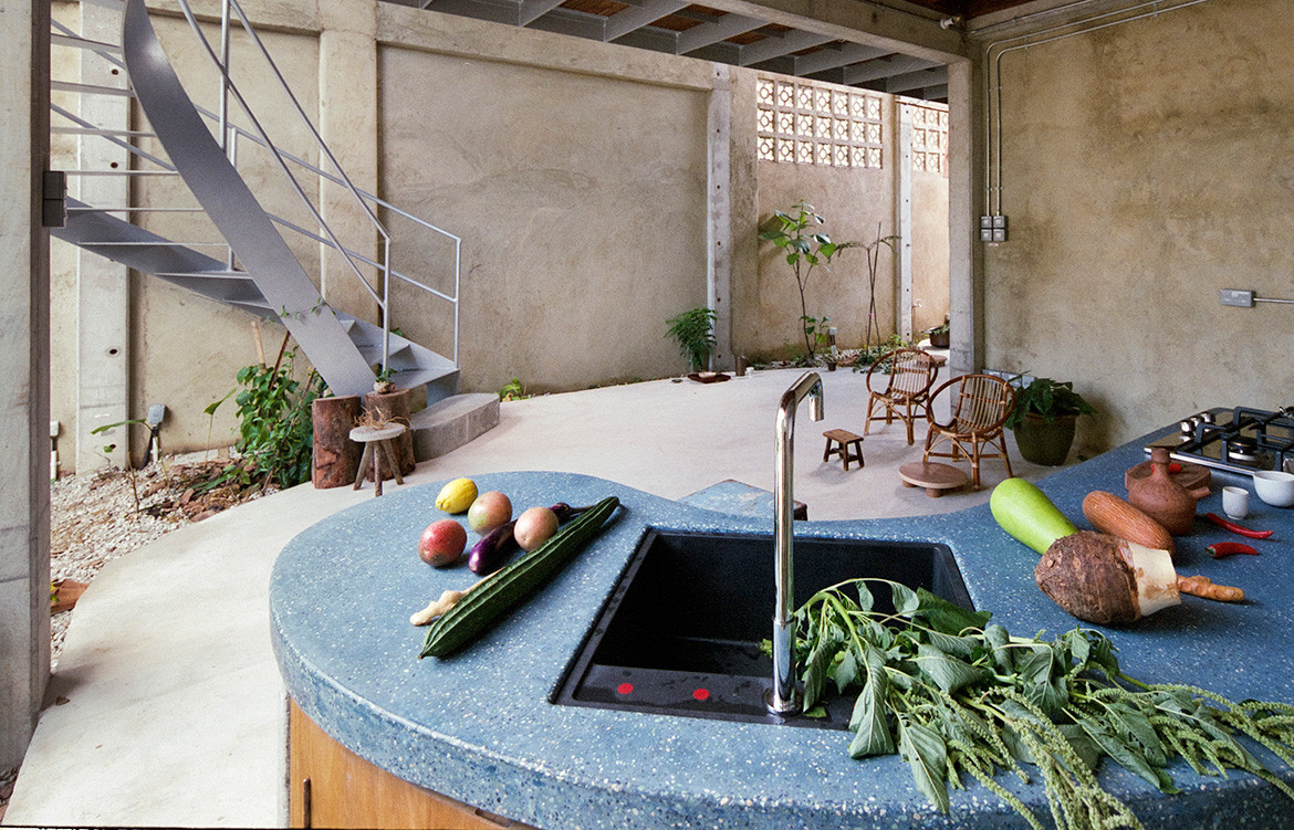 The idea of the compound house was never spelled out. Instead, Ling Hao talked to his clients about how they lived. Also, they remained closely involved in both the design and building of the house throughout. The result is a house that truly reflects the way the family lives, but also provides flexibility and privacy as required. Most of all, it is closely connected to the natural world by virtue of its openness and the generous greenery, including the garden roof whose trees play a major role in cooling the house. “Everywhere you feel as though you are among the plants,” says Ling Hao.