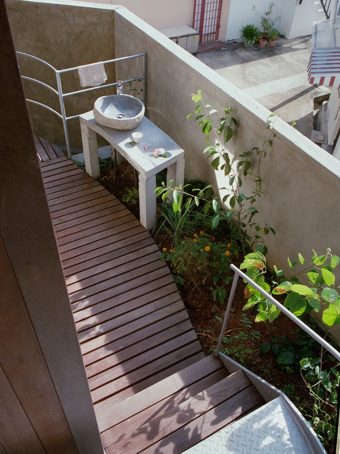 A second floor has been created together with a roof garden without losing the scale of the existing streetscape. The ground floor is left largely open. The parents’ bedroom is at the back and can be closed off with glass sliding doors, but the rest of the downstairs space is family space, including the kitchen, which becomes a combined wet and dry kitchen. It is, says Ling Hao, basically a reconstruction where everything concrete has been kept, with only columns introduced to support the roof.