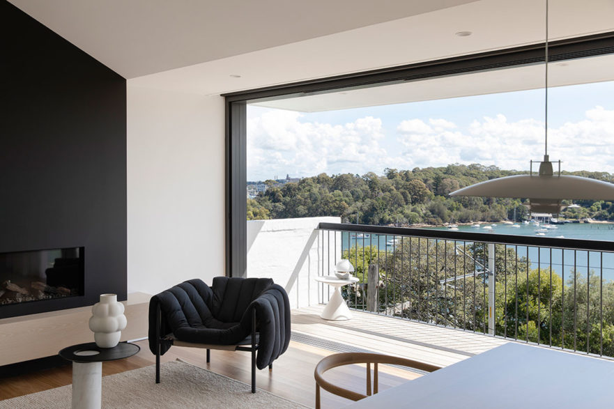 Rising in solid black, the lift grounds every floor of the home, appearing as a totemic connector. The fireplace has been given the same achromic treatment, drawing the eye into the living space without overpowering.