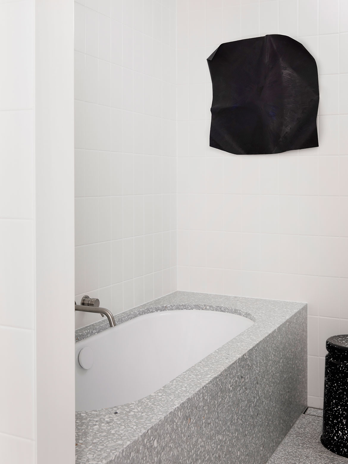 Elements of ritual are elevated in this main ensuite – for example, swathes of terrazzo wrap the bathtub, and the walk-in robe connects out to views.