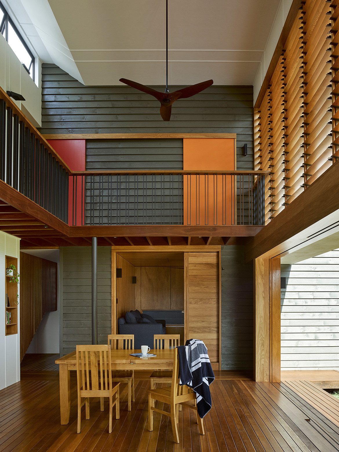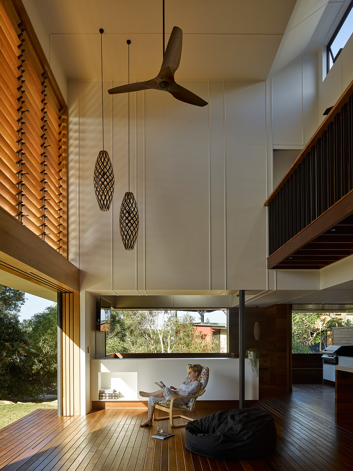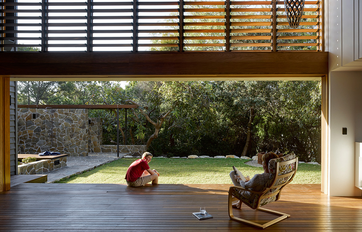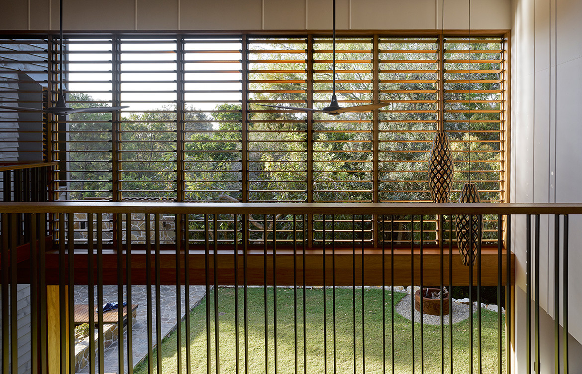 For effect the decking continues upstairs along the corridors connecting the three bedrooms that have been located to the upper, private level. The main bedroom and the boys’ bedrooms at either end of the plan all enjoy ocean views. Although they weren’t significant enough to warrant placing the living spaces on the upper level, they do offer personal and distinctive views for each family member.