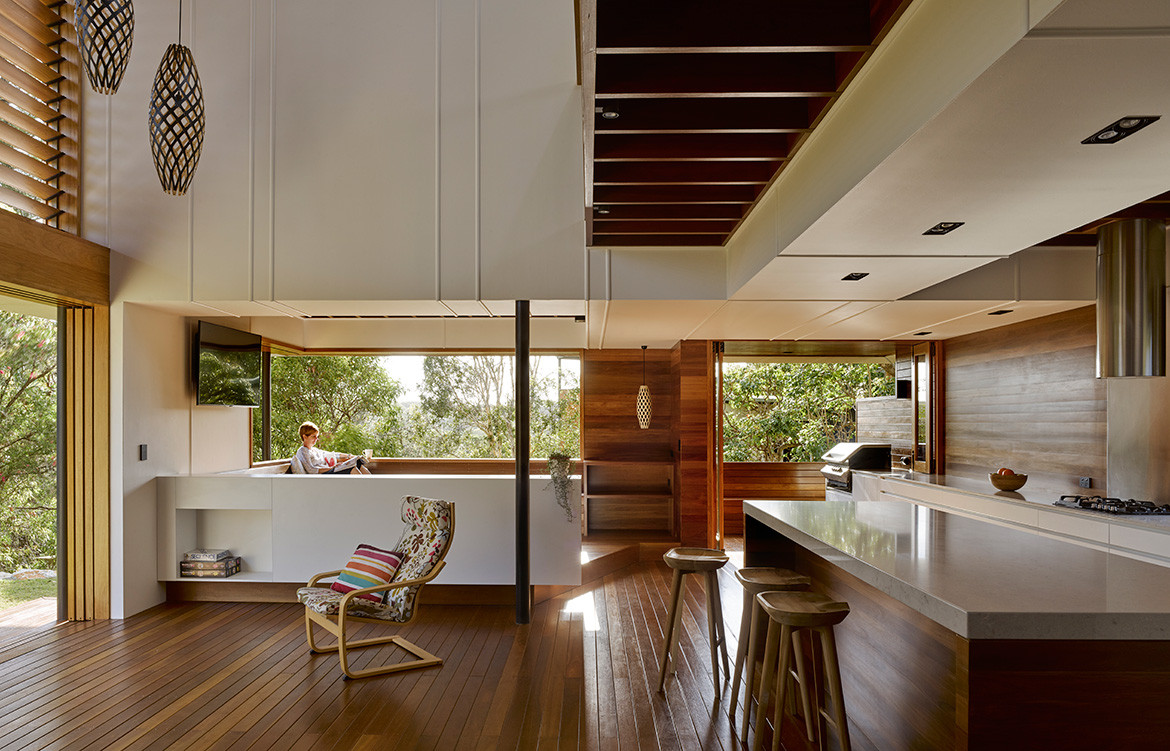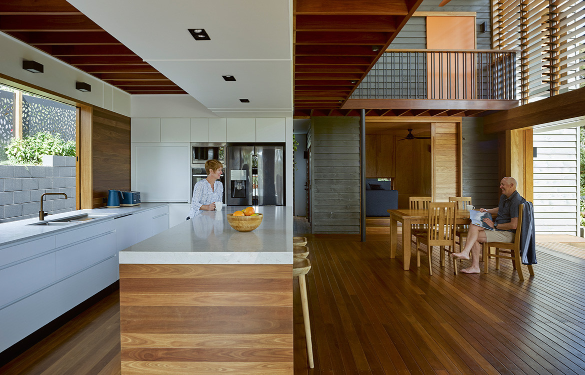 Inside the house much of the flooring is timber decking, a continuation from outside. Not only does this offer a more casual atmosphere for the island retreat, but it’s also a practical decision, and one made often by Paul for the handful of other residences he has designed on Stradbroke Island. The island consists almost entirely of sand and, needless to say, it gets everywhere, but the intention is that by the time the residents reach the internal house proper, as much of the sand as possible will have fallen off and through the floor.