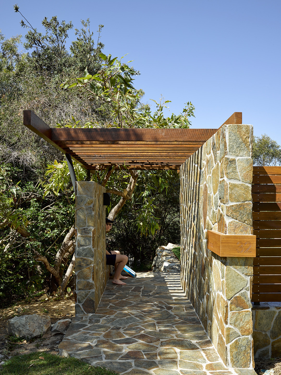 Two stone walls and a timber arbour form the main entrance beneath the characterful, namesake Corymbia tree. A generous width between the timber beams encourages the Flowering Gum to peak through and cast interesting shadows. On the other side of the entry sequence, the house fully reveals itself as it opens on to the great room off the deck and leading to the kitchen with sightlines through to the interior living spaces. This also works as passive security, in lieu of rigid fences, front gates and intercom systems – all of which are rarely found on the island.