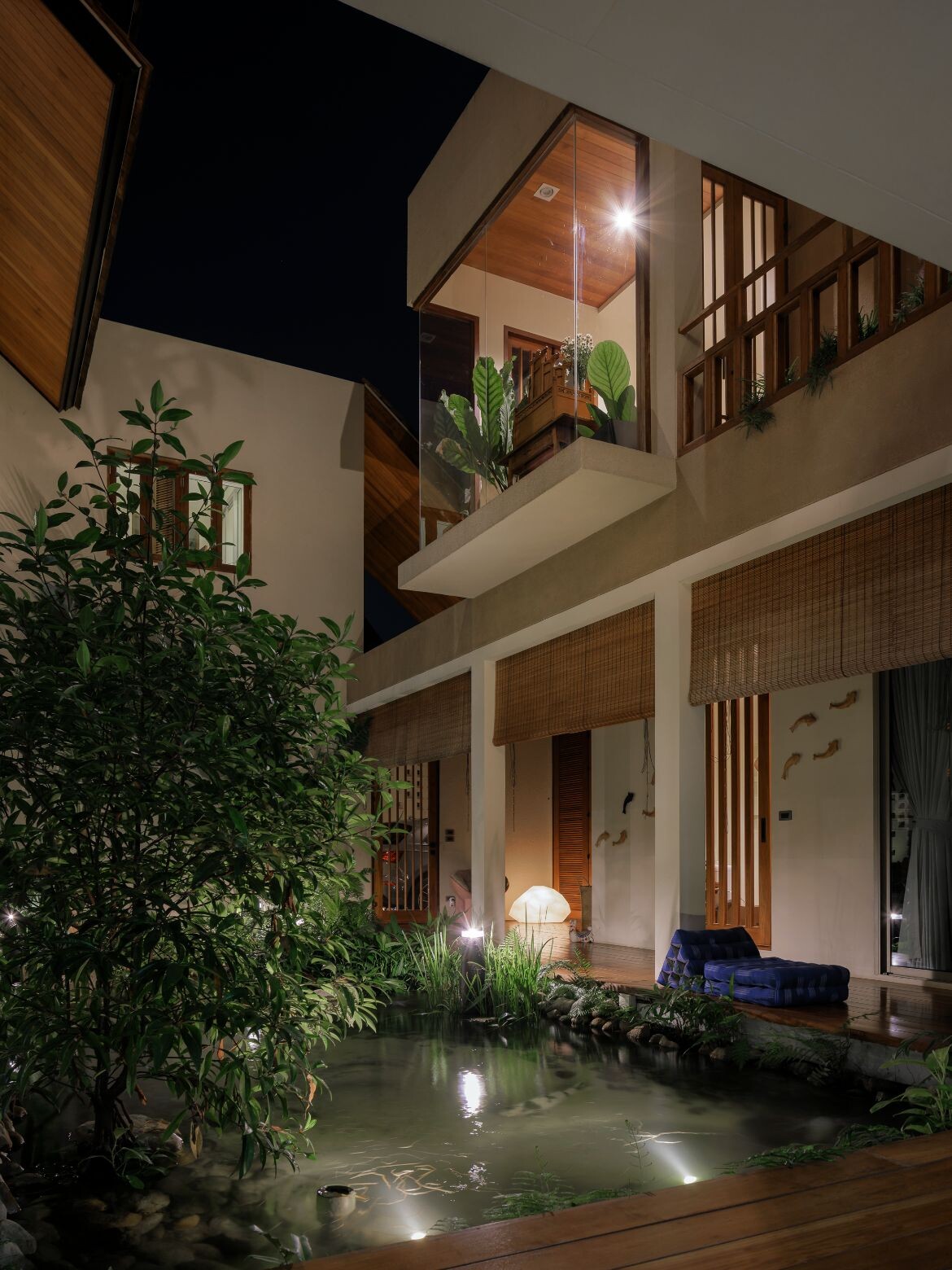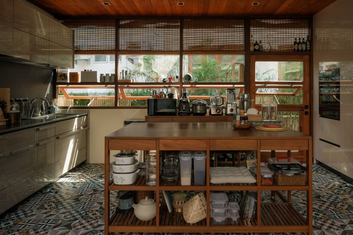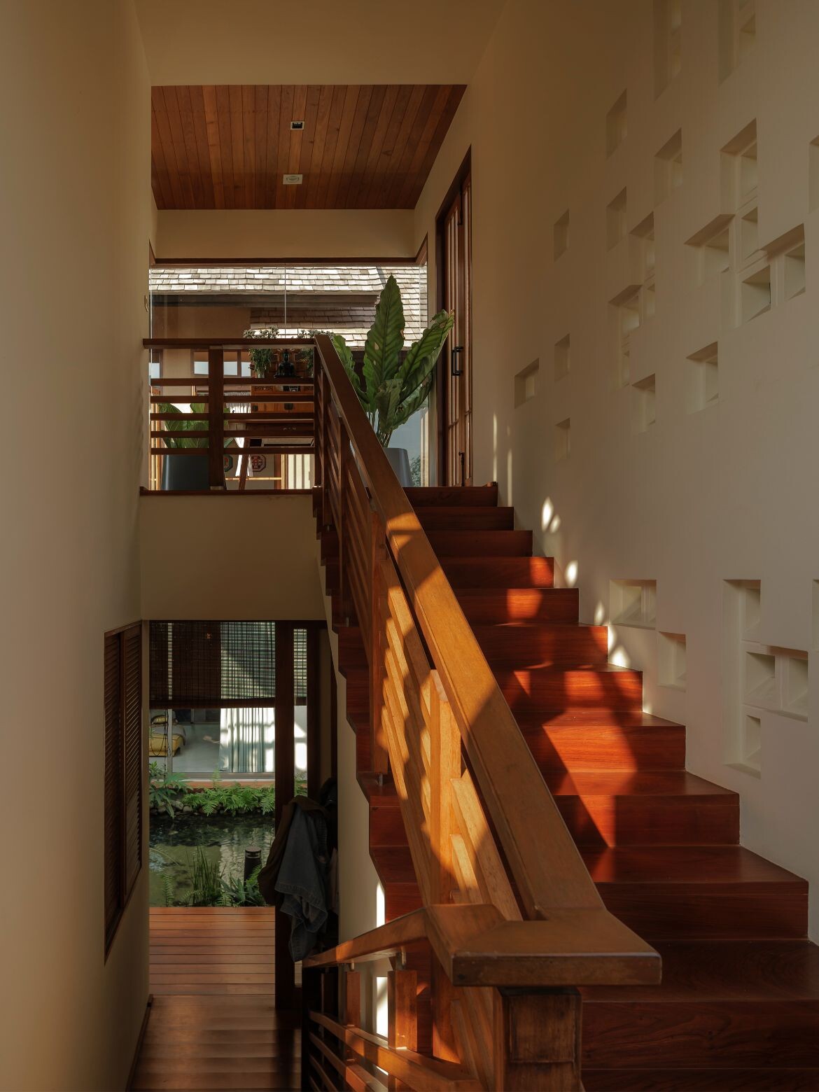 In a word – or perhaps in two – these design considerations centre on shade and ventilation. Bangkok’s climate led the architects at Design in Motion to prioritise air flow and protection from direct sunlight in this renovation project. The ground floor courtyard, with its porous connections to surrounding living areas and kitchen, is the quintessential expression. The height of the whole structure around the ground level courtyard provides shade through most of the day, creating a place of peace and respite – especially considering the small fish-filled pond at its centre.