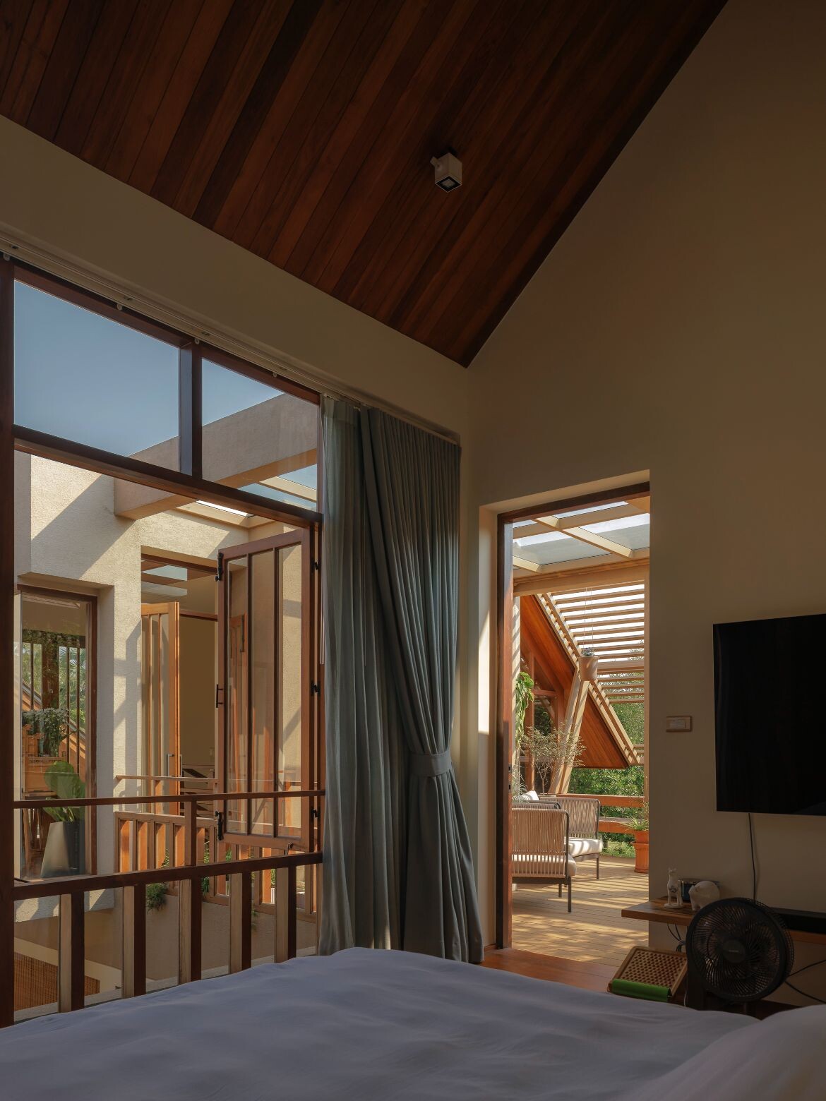 On the upper floor, an old wall has been torn down and the master bedroom takes up a central position overlooking the courtyard. The guest room, meanwhile, is currently occupied by the five cats, who also enjoy full access to walk anywhere around the internal spaces.