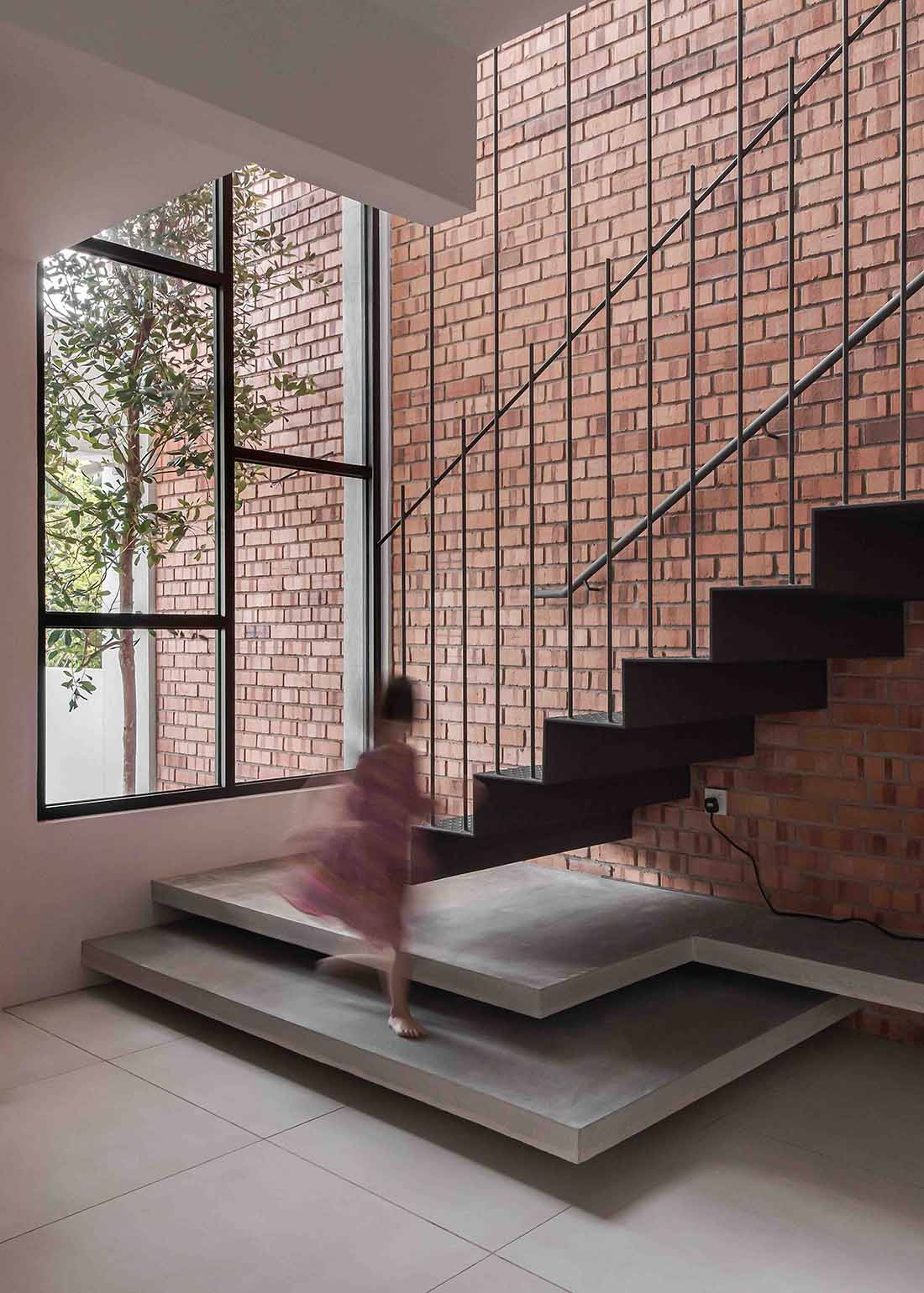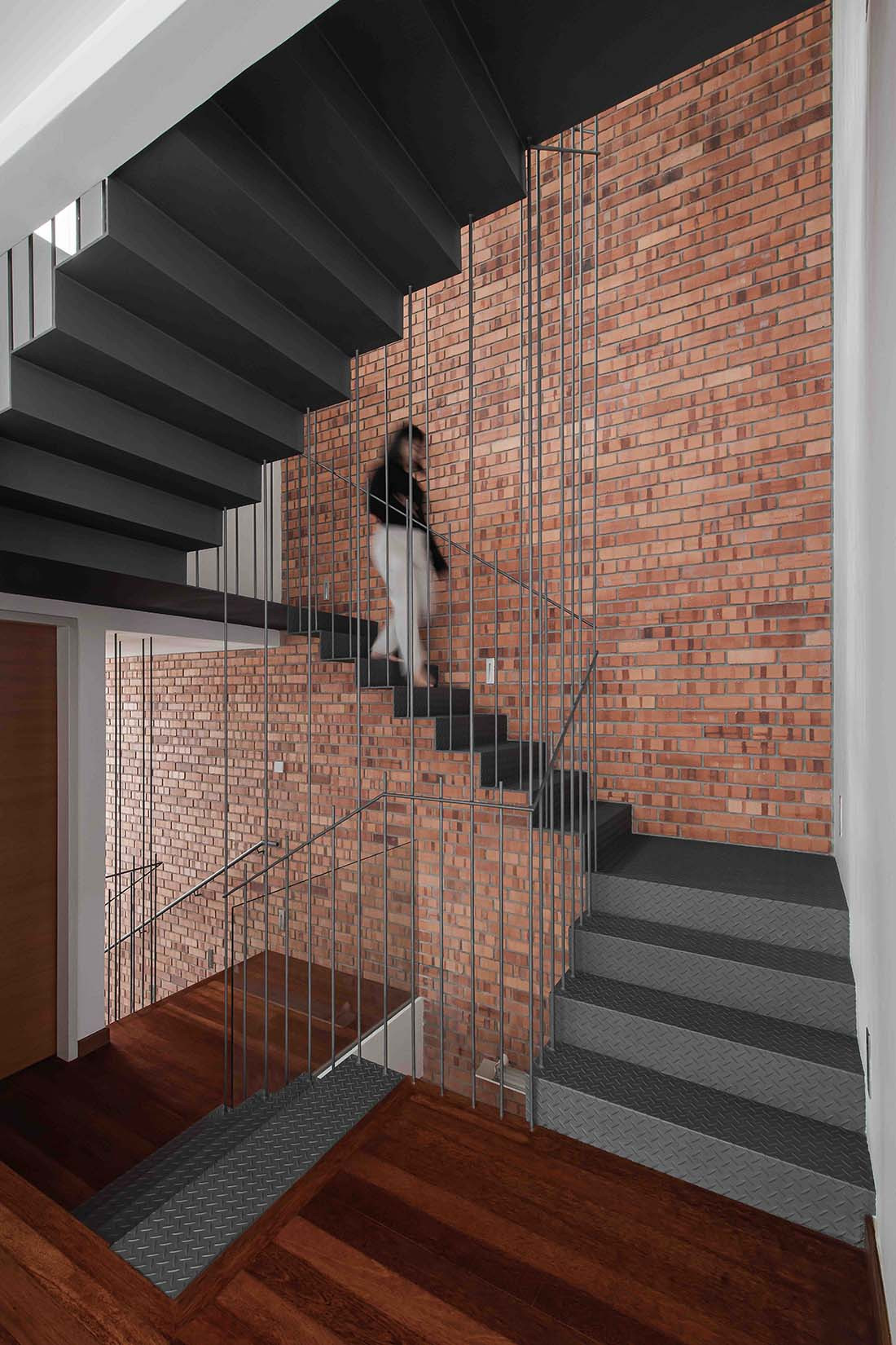 The stair is a feat of spatial planning, traversing all four levels of the home through a newly inserted void. It has a lightness of touch with thin plate-steel treads held up by equally thin steel rods. “The staircase seems to be almost floating within the central void of the house against the brick wall. It took some time and many mock-ups before we could get the right detailing of rods from which the steel plates hang,” says Jamil.