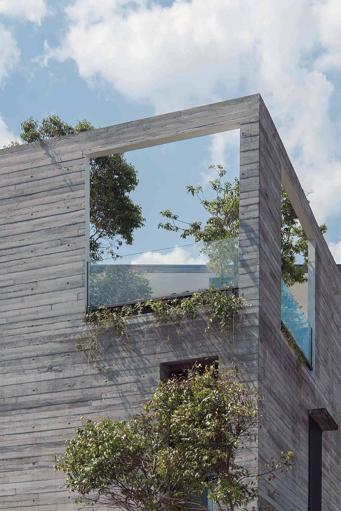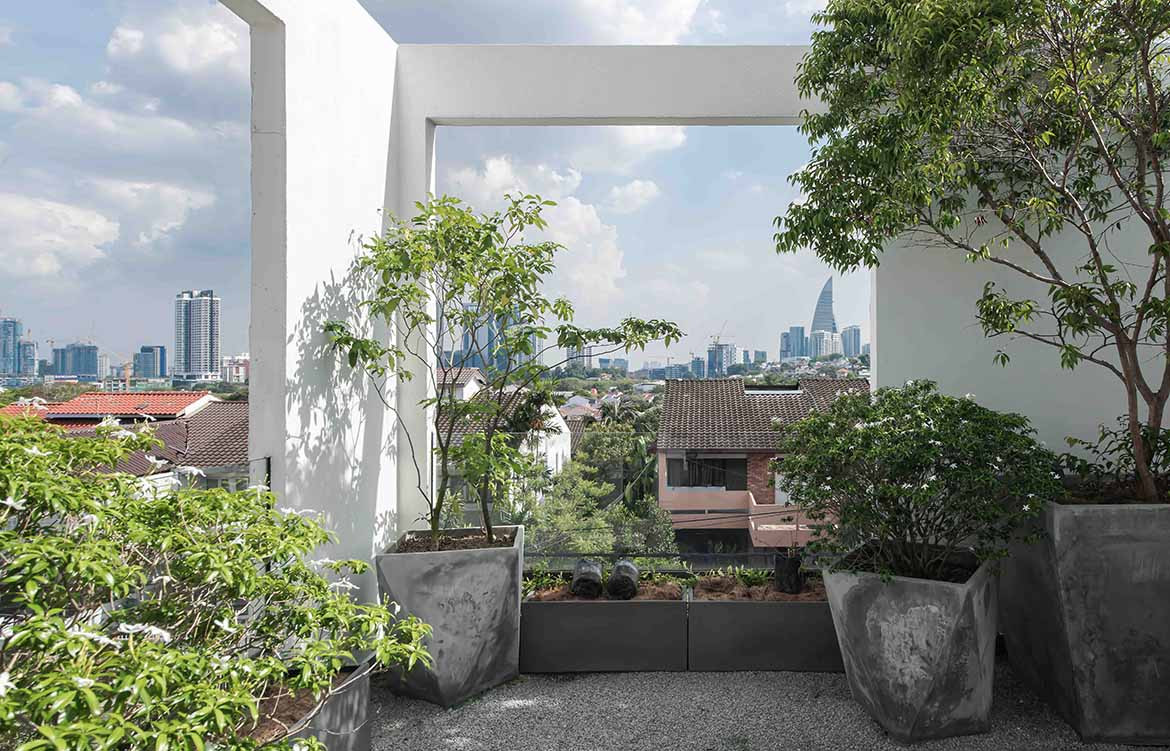 Other elements add some warmth: a brick wall, hardwood timbers and the greenery of the rooftop. Even though in-situ concrete is a common and cheap building material in Malaysia, texture is added through the boardmarked pattern in the formwork.