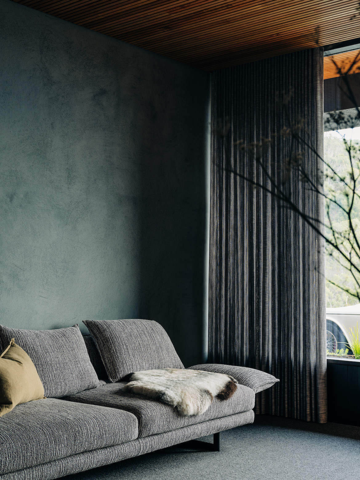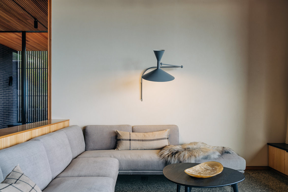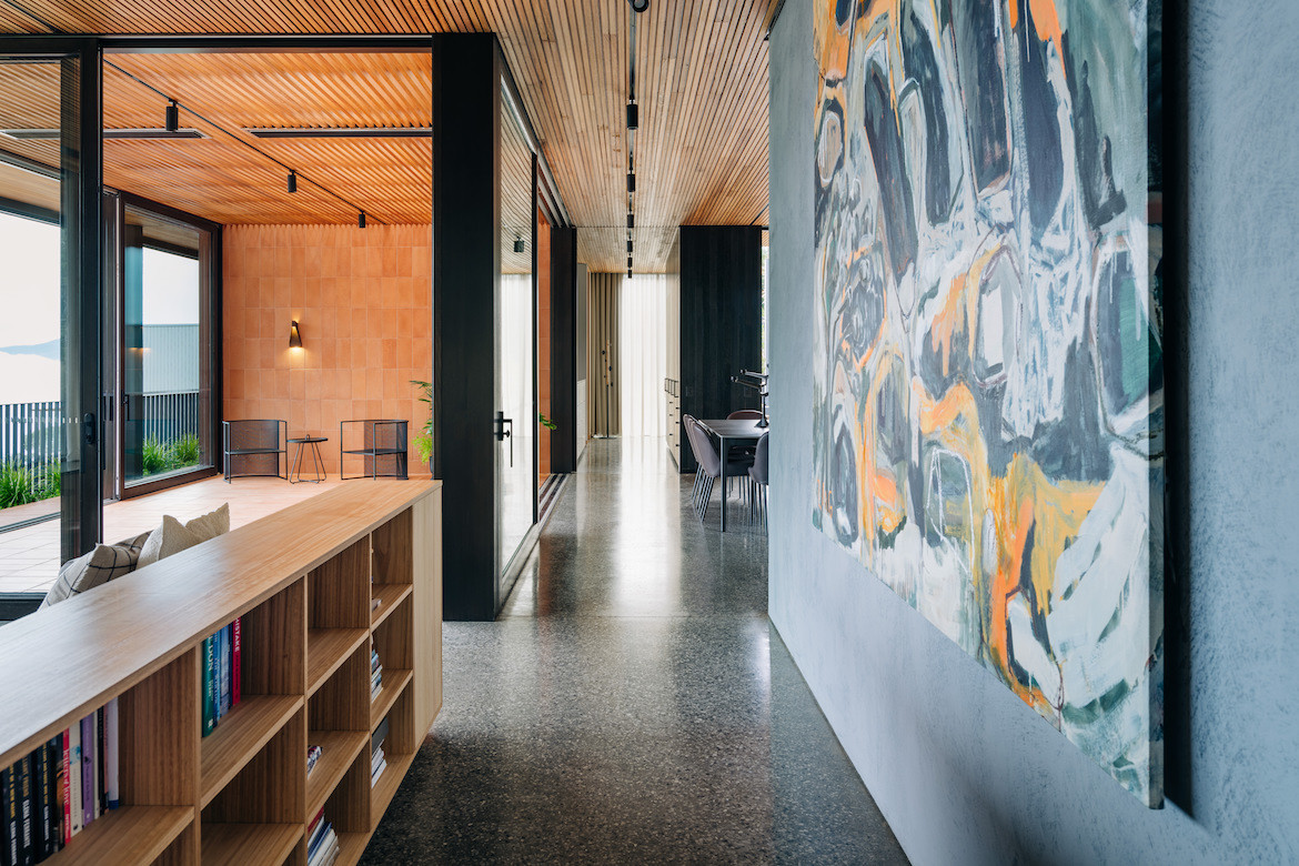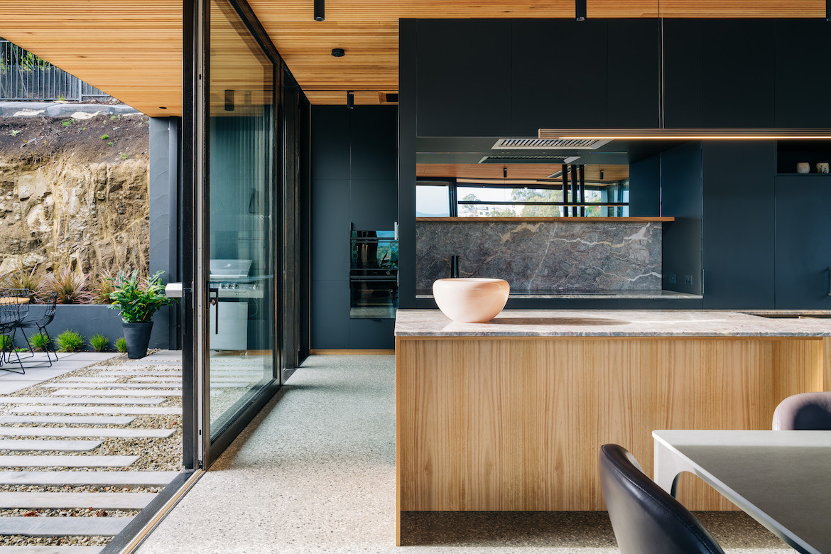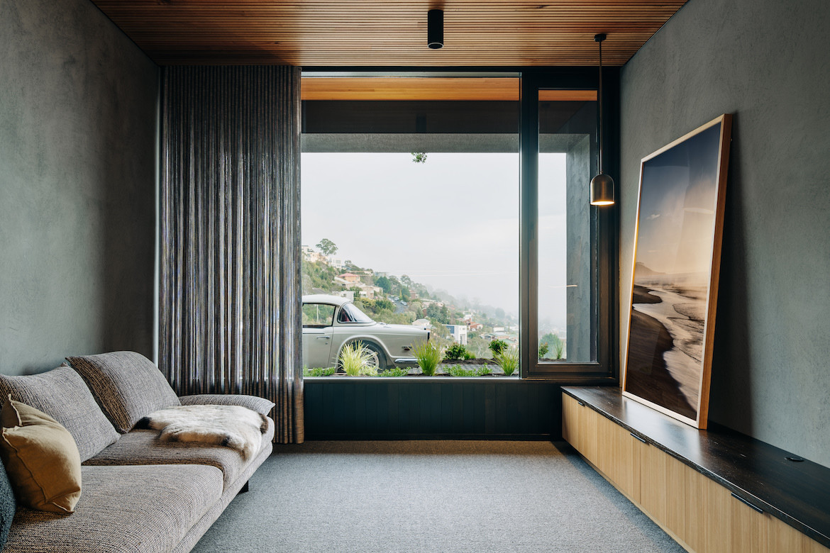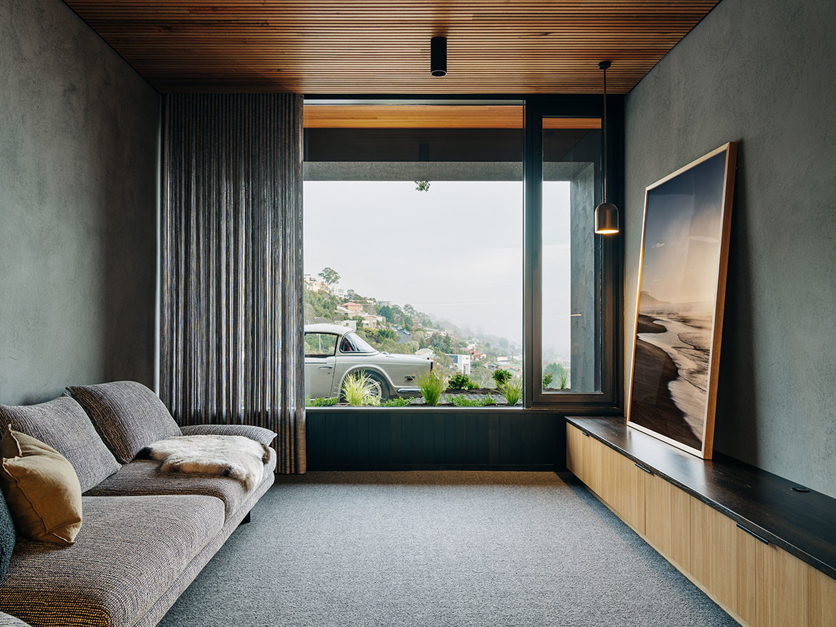 A built-in concrete planter softens the edge of the house: “It can get quite cold on top of Sandy Bay so it didn’t make sense to just create an outdoor deck that left itself open to the inclement weather,” says Haddad, who has created flexibility in the way spaces are used.