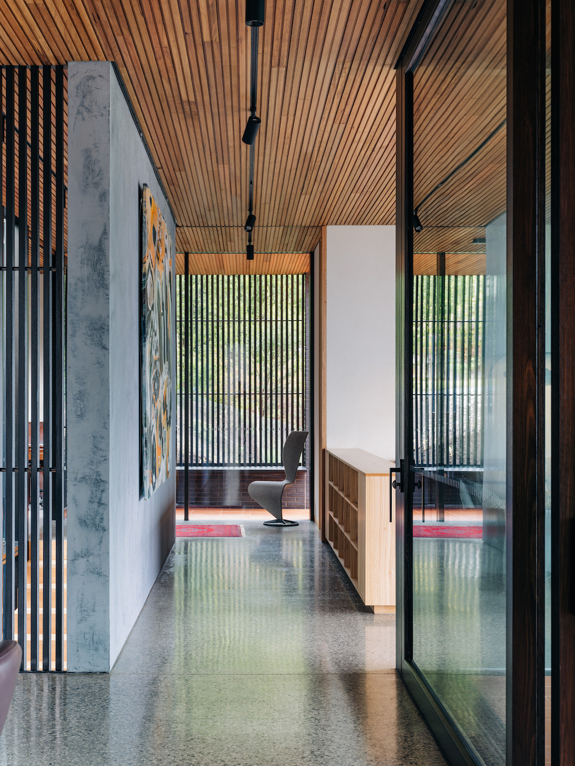 “When I’m sitting in the study, I can see what Paul is up to in the kitchen. But it’s also possible to see him in his workshop from the living areas,” says Kerry. When privacy is required, additional large sliding doors can easily be freed from the cavity wall.