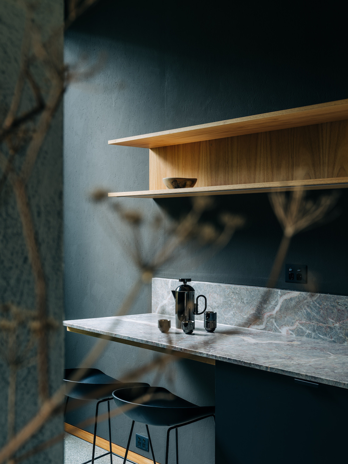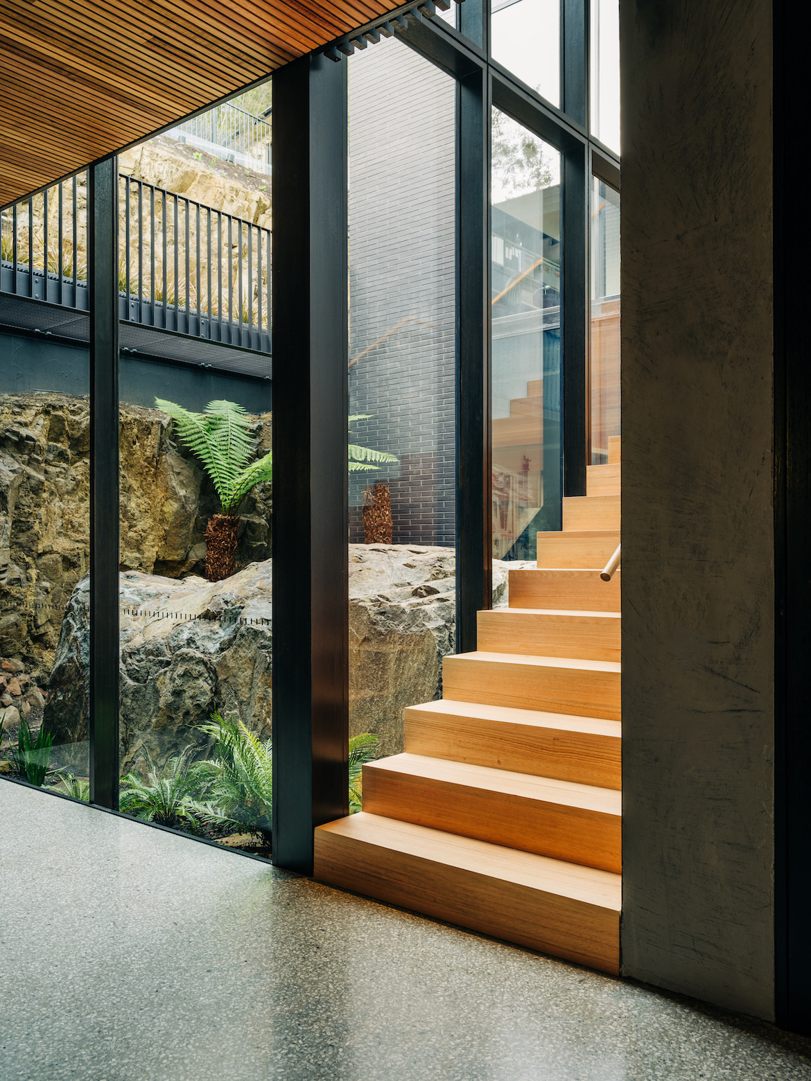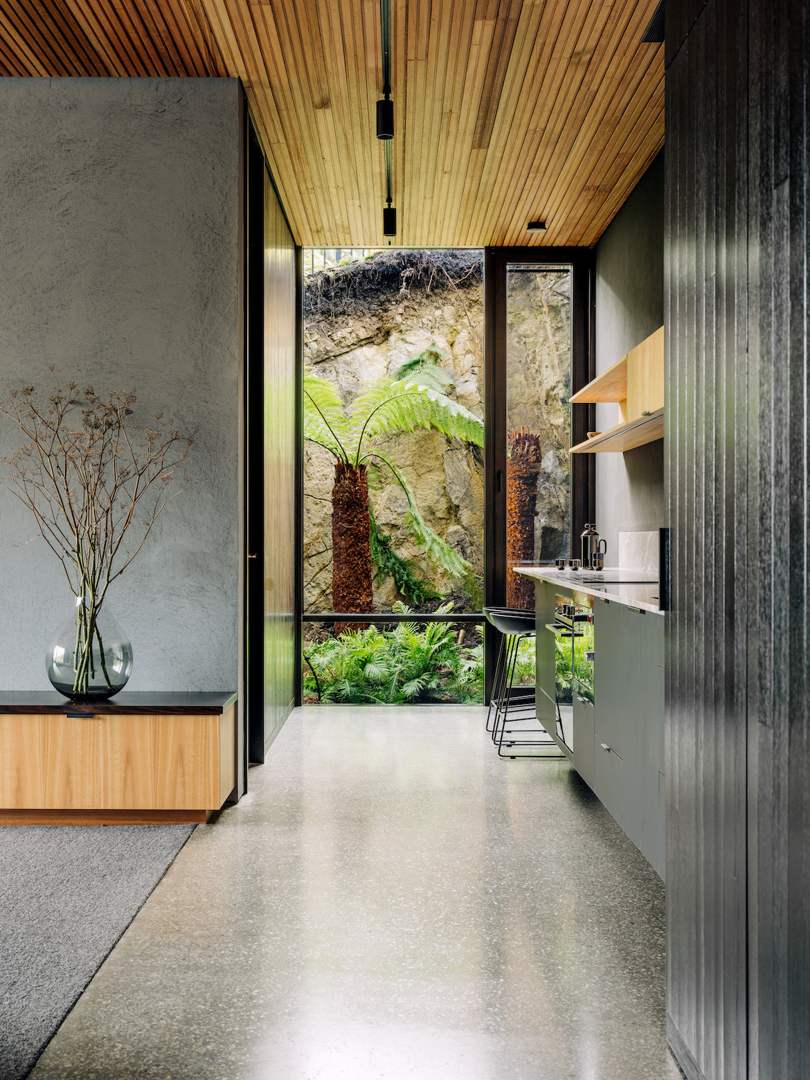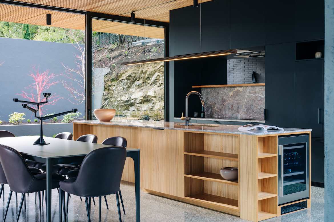 While the opportunity to build came with a 1,000-square-metre site, the terrain was relatively steep with a rocky bed as the foundation. One of the massive boulders was retained and transformed into a fern-style garden. Given the slope of the site and the desire to ensure neighbours’ views of the river were also maintained, Archier excavated more than six metres below the original ground level, nestling the house into a dolerite base.
