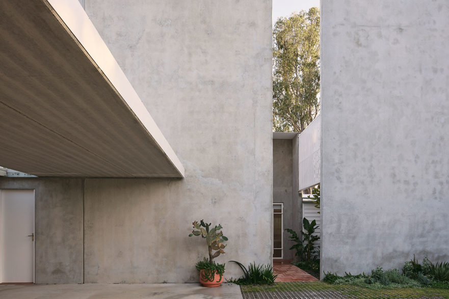 As such, the entire site has been conceived as a “large walled garden”, with soaring concrete walls concealing the streetscape and creating a hidden oasis within the suburban setting. Courtyard gardens punctuate the site, connecting the old and new. This permeable plan also gives almost every room direct access to light, ventilation, and the gardens. “The idea is that you are encouraged to pass through landscape and structure prior to entry of the rooms,” says Furminger.