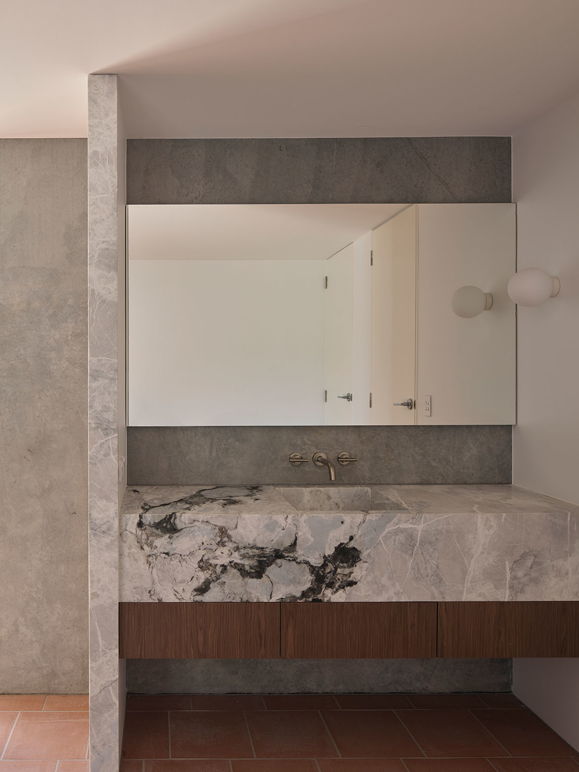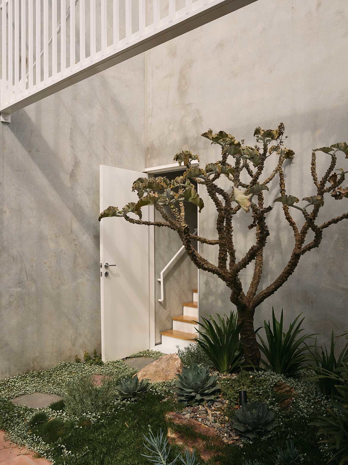 This connection to the landscape responds to the existing floor plan, which was one of the few attributes of the original home. A north-eastern courtyard acts as a central corridor through the home, connecting many of the rooms to the garden and natural light, and this arrangement informed the placement of the new concrete elements.