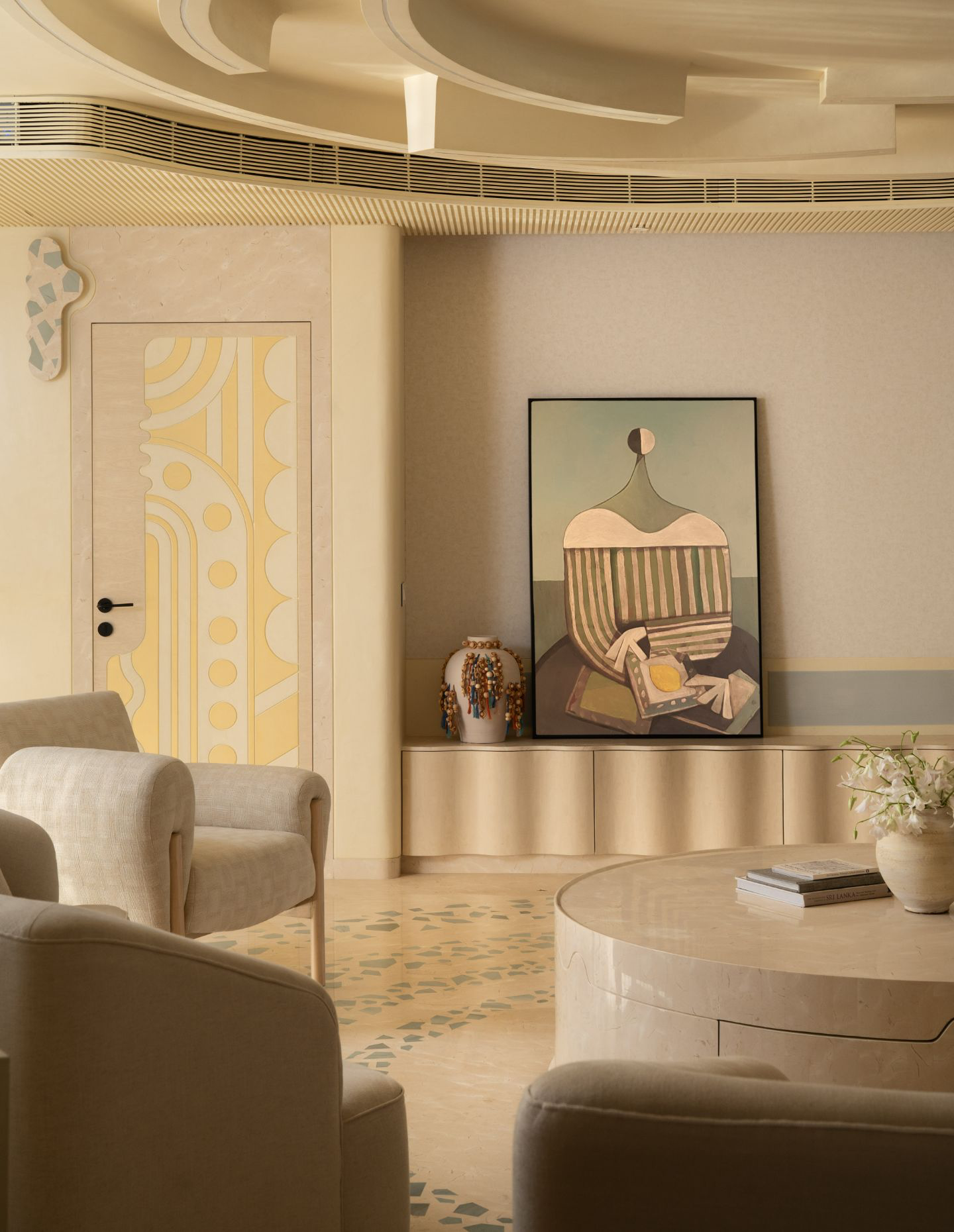 MuseLAB’s Soft Serve transforms a high-rise apartment in Thane, India into a calm, pastel-toned retreat. Drawing on the Japanese concept of Seijaku, the interiors use a disciplined palette of ecru, sage, taupe and blush layered with stone, concrete and timber veneer. The muted colour language creates a sense of quiet luxury, pairing serenity with playful material expression.