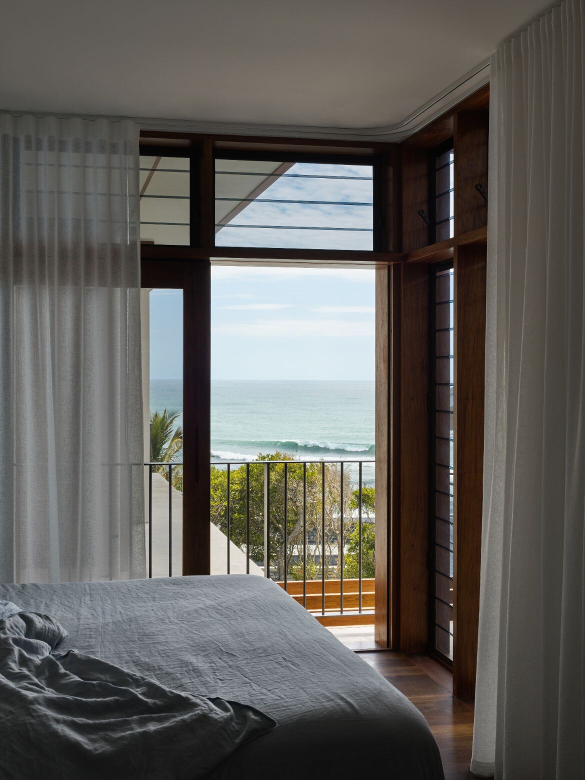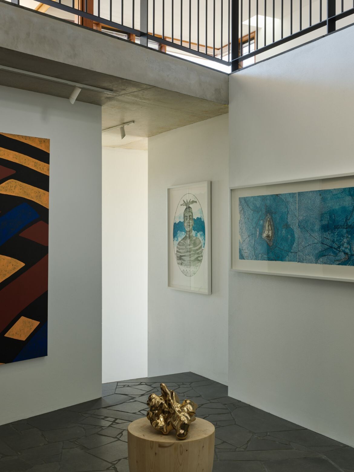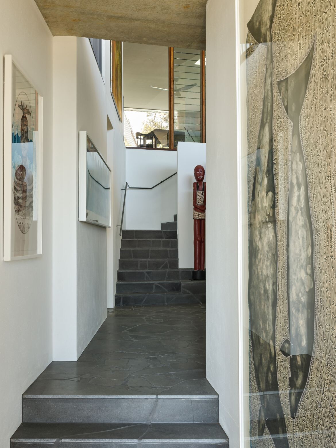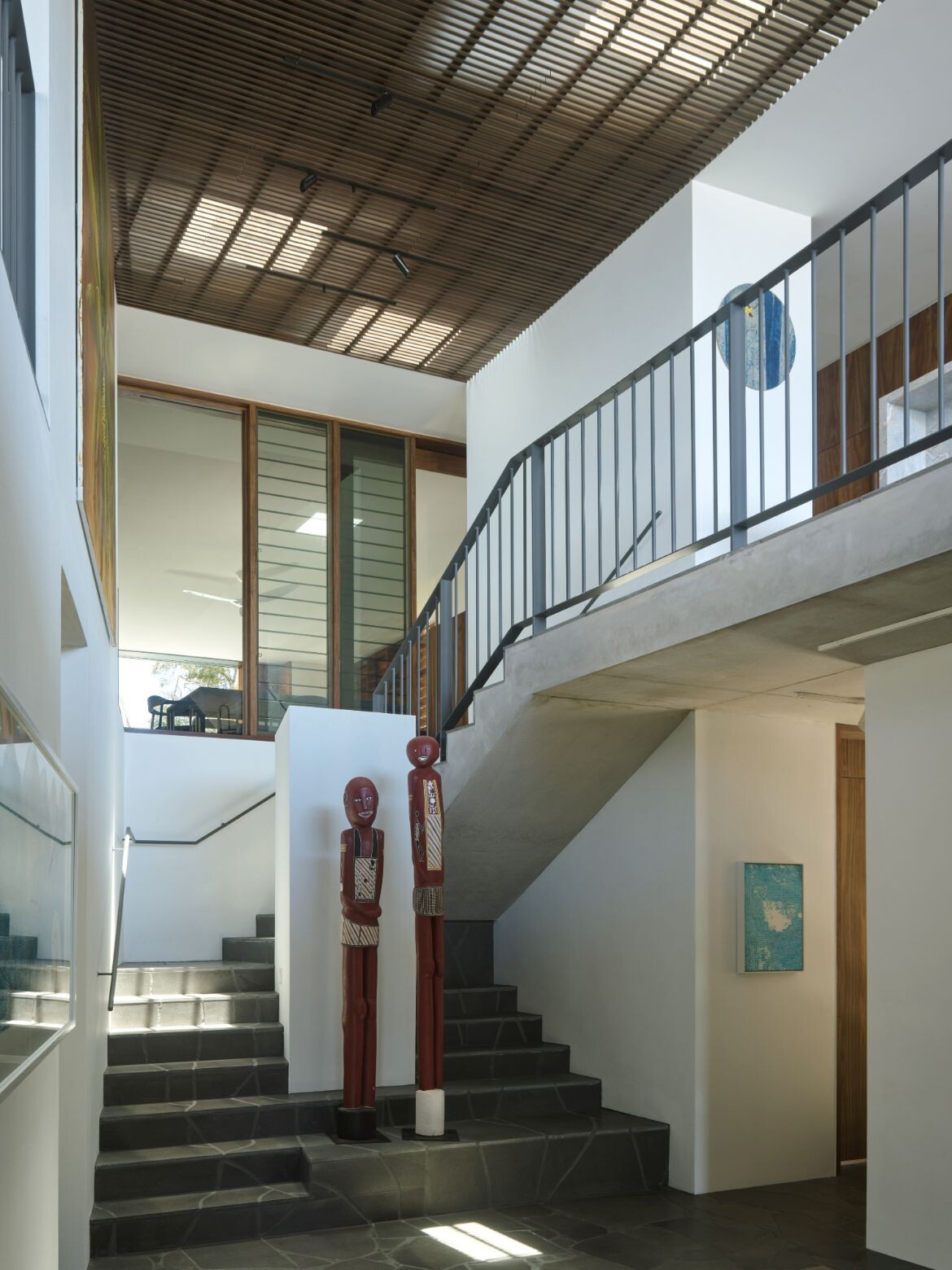 Through materiality and layout, the architects have achieved a beautiful and effective synthesis of the whole. On one hand, there is an upper living area defined by openness, sightlines and porous thresholds between indoor and outdoor space. On the other, a lower space that is both art gallery and private holiday quarters. It’s a delicate balance achieved under one sub-tropical roof.