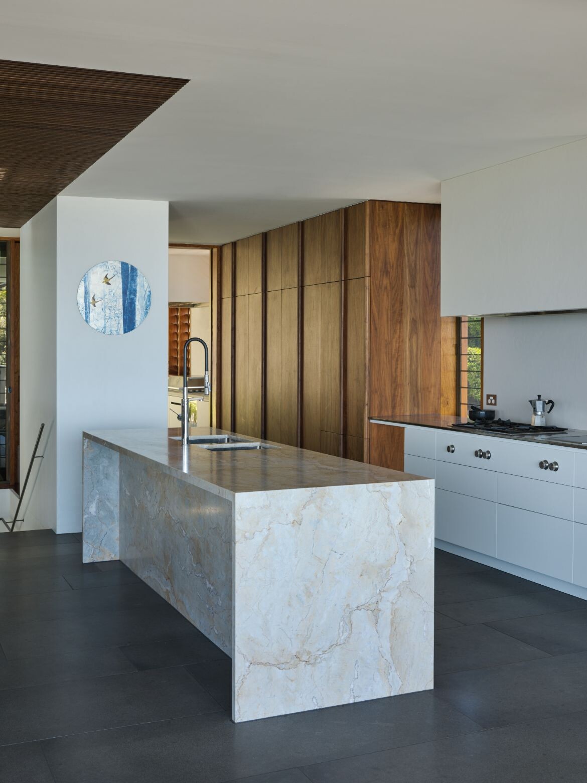One of the smart moves made by the architects was to design radically different layouts for each floor. Above, it’s all about openness, views and spatial flow; below, separate rooms instead emphasise privacy. The bathrooms express some of this difference, with the main ensuite upstairs providing sightlines to the ocean while the lower ones are designed for flexible, shared use.