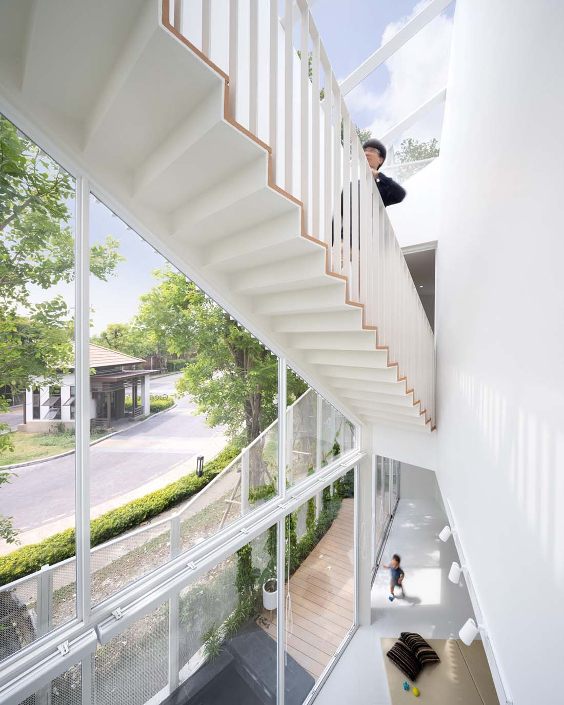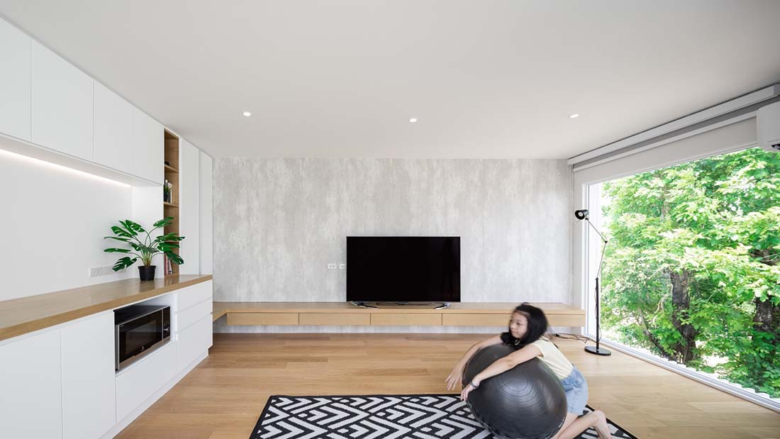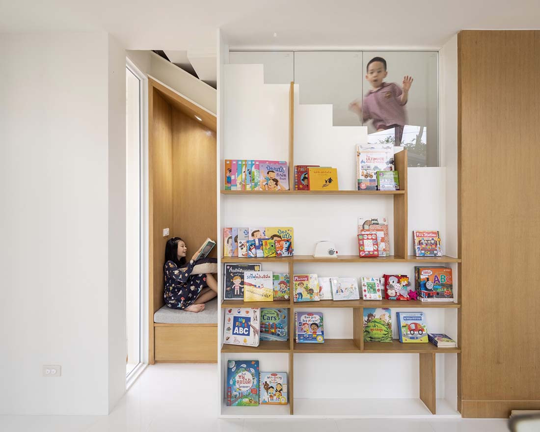 Home to a couple, their two young children and their grandmother, the original house simply couldn’t accommodate everyone’s needs. Given the hot and humid climate of Thailand, the owner desired additional indoor space, while maintaining a connection to the mature trees that line the block on the street side. “We designed this house to follow the site and maximise the size. It was about attaining a high efficiency of space because of the high price of land,” says Parpis Lee, founder and lead architect at Touch Architect.